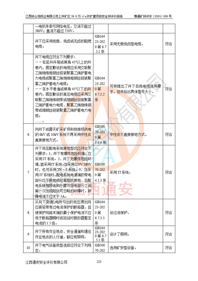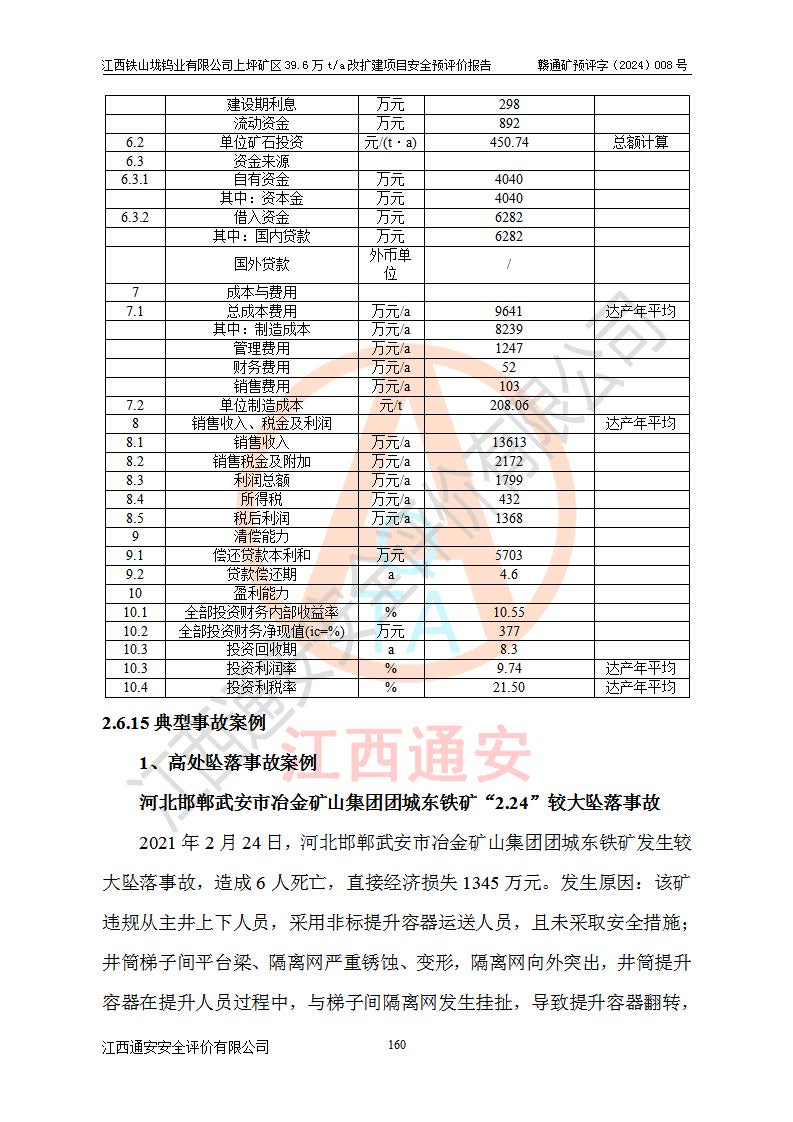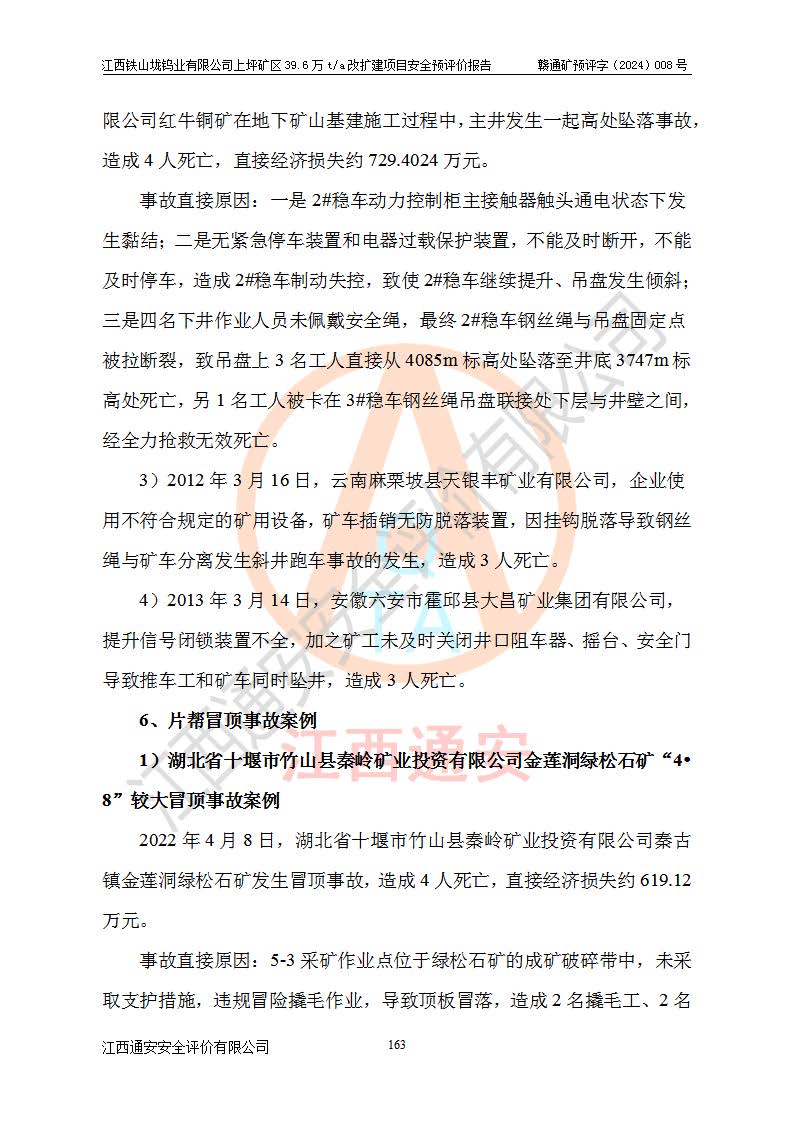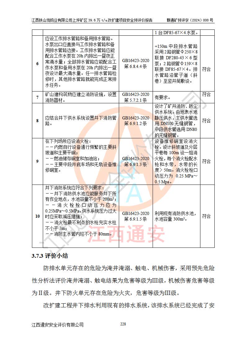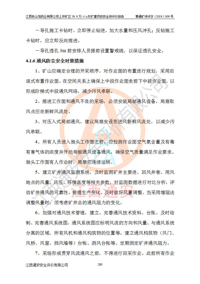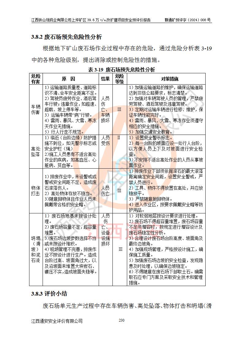 其它 | 江西铁山垅钨业有限公司上坪矿区39.6万t/a改扩建工程存在的主要危险因素有:坍塌、放炮、火药爆炸、**伤害、高处坠落、物体打击、片帮冒顶、触电、机械伤害、火灾、容器爆炸、中毒与窒息、透水、淹溺等。该评价项目中存在的有害因素有:粉尘、噪声与振动、不良作业环境,如高温、采光照明不良对矿山人员的伤害和其他不利的环境因素等。上述主要危险、有害因素在采取本《报告》第4章中及《可研》提出的安全对策措施后,能得到**控制,则江西铁山垅钨业有限公司上坪矿区39.6万t/a改扩建工程符合**有关法律法规、规章、标准和规范要求。 | ||||