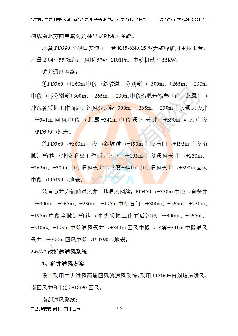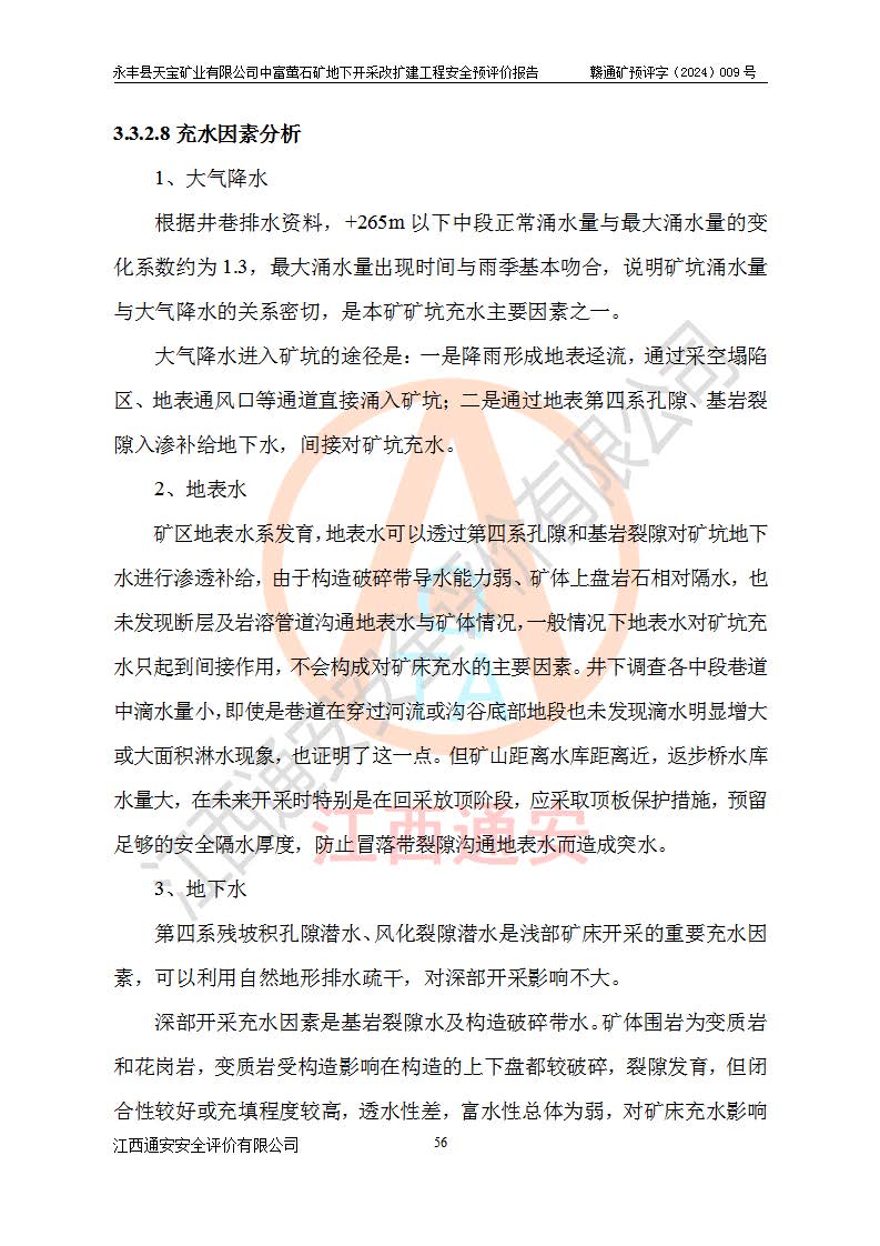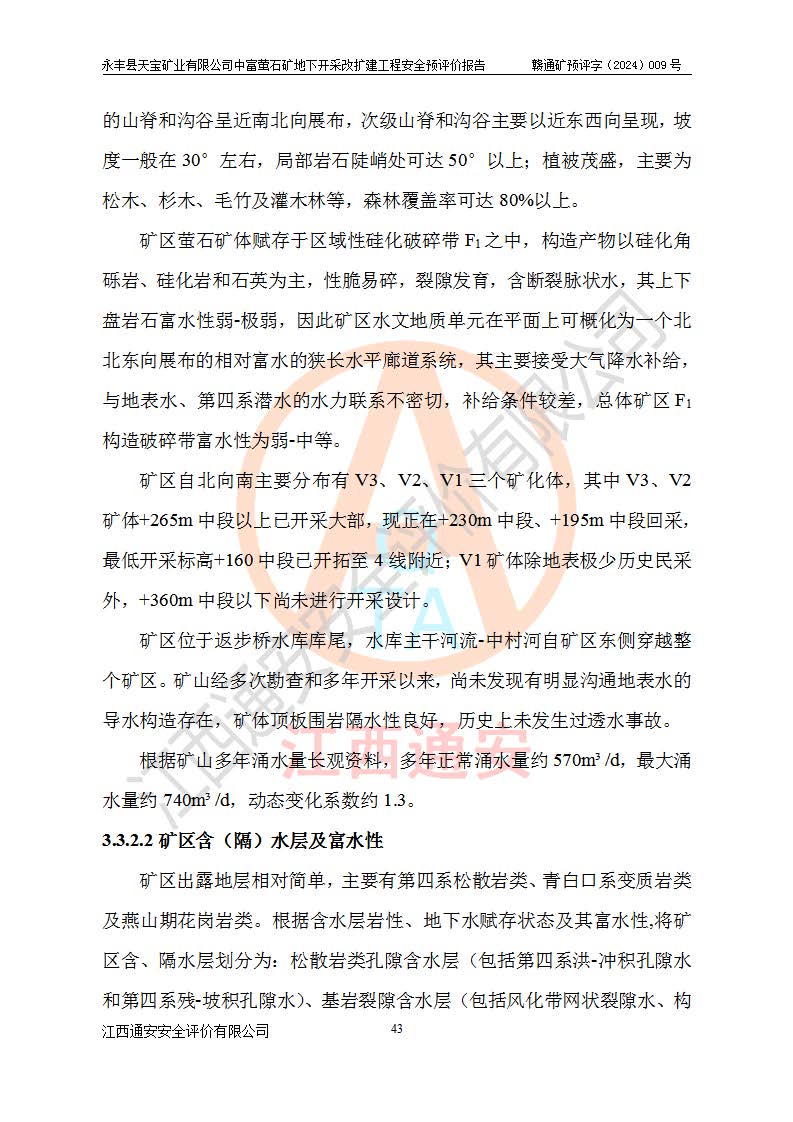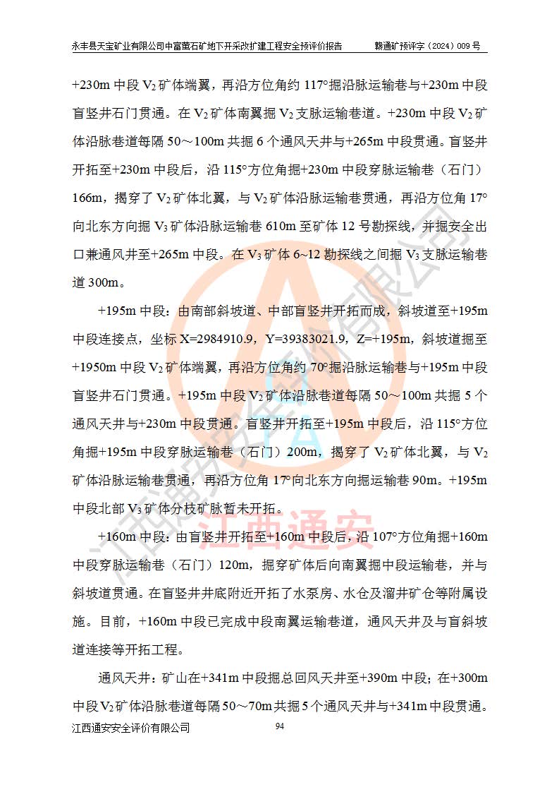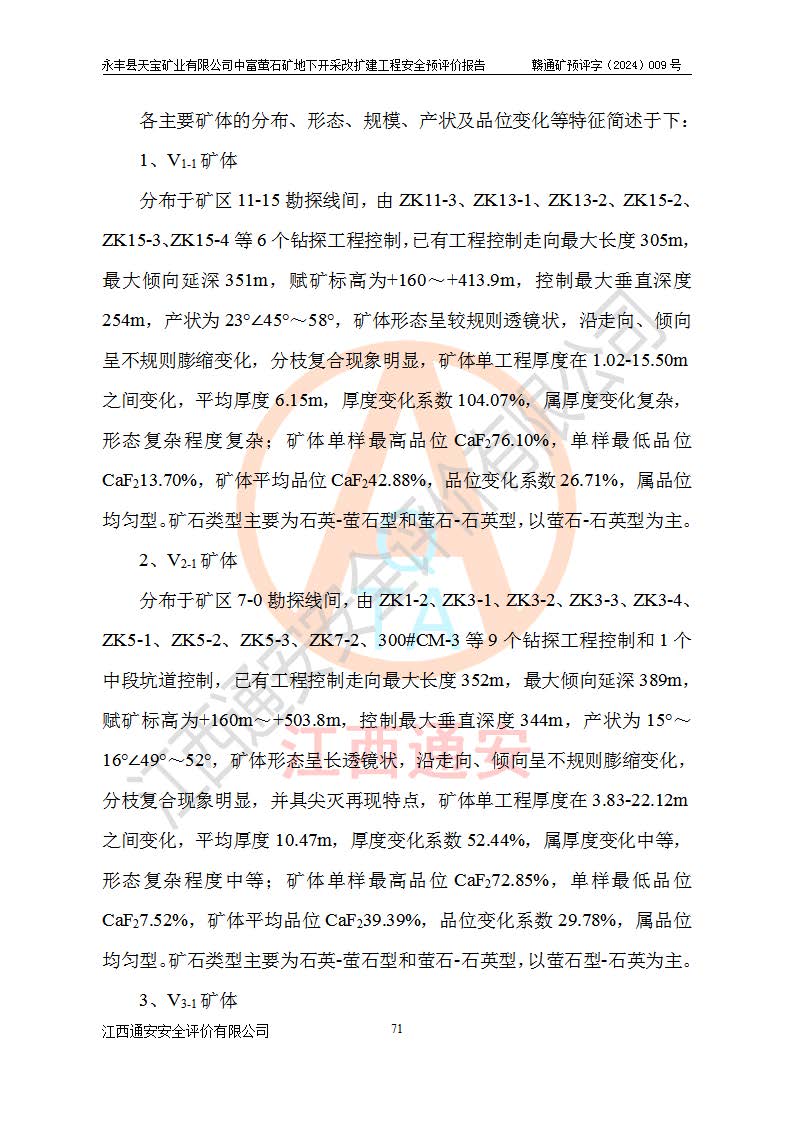 项目简介 | 永丰县天宝矿业有限公司中富萤石矿位于永丰县县城130°方向直距约60km的中村乡境内。矿区有水泥公路通往永丰县城,交通较为便利。 永丰县中村乡中富萤石矿于2007年10月由原永丰县中村萤石矿、永丰县富源萤石矿及永丰县中村牛角湾萤石矿三个采矿权整合而成,矿区范围由J1~J13十三个拐点圈定,矿区面积为1.9034km2。矿区分Ⅰ区、Ⅱ区、Ⅲ区三部分,即位于X坐标2984448以北部分为Ⅰ区,位于X坐标2984448至2981948之间部分为Ⅱ区,位于X坐标2981948以南部分为Ⅲ区。整合后自2008年1月投产至今,主要开采范围集中在Ⅰ区(矿区北部)的V2、V3号矿体进行开采。2012年矿山委托江西冶金设计院进行初步设计。设计的范围主要包含中村、富源两整合后的采区,即矿区X坐标2984400以北范围内,设计采用平硐+盲斜坡道联合开拓将原两个独立的生产许可整合为一个生产系统。2013年通过了安全设施验收,并取得了由省安监局颁发的安全生产许可证,证号:(赣)FM安许证字[2013]M1625号。 永丰县中村乡中富萤石矿经过多年开采,原开采初步设计范围内(+341m以上中段)萤石矿资源储量日渐减少。2013年4月矿山向原吉安市国土资源局提出申请,将采矿许可证开采深度在现有*低标高(+300m)的基础上,再向下延伸 140m(*低标高为+160m)。2013年10月吉安市国土局以吉市采复字〔2013〕1号文批准矿山在预划定的矿区范围内开采深度变更为+550m至+160m。2014年5月江西省核工业地质局二六三大队编制了《永丰县中村乡中富萤石矿补充勘查地质报告》。 2015年9月矿山委托江西省冶金设计院有限责任公司编制了《永丰县天宝矿业有限公司永丰县中村乡中富萤石矿地下开采深部扩建工程初步设计及安全设施设计》,并于2016年3月3日通过原省安监局组织的专家评审,2016年8月1日由原江西省安全生产监督管理局下达了《关于永丰县天宝矿业有限公司永丰县中村乡中富萤石矿地下开采深部扩建工程安全设施设计审查意见》(赣安监非煤项目设审[2016]25号)。 由于深部扩建工程一期工程已完成建设的排水系统、运输系统、采矿方法等工程与设计不符。根据安监总管一〔2016〕18号文件要求,2017年12月矿山委托江西省冶金设计院有限责任公司编制了《永丰县天宝矿业有限公司永丰县中村乡中富萤石矿地下开采深部扩建工程初步设计安全设施设计变更》,并于2018年3月28日通过省安监局组织的专家评审,2018年8月1日由江西省安全生产监督管理局下达了《关于永丰县天宝矿业有限公司永丰县中村乡中富萤石矿地下开采深部扩建工程安全设施设计变更审查意见》(赣安监非煤项目设审[2018]23号)。矿山深部开拓工程采用平硐+盲竖井+盲斜坡道联合开拓,主要开采V2、V3矿体,利用原PD350作为主运输平硐,在矿区Ⅰ区中央V2、V3之间0线位置布置盲竖井,在PD360平巷内距离硐口40m处布置折返式盲斜坡道至井下各中段。设计深部开拓共布置+300m、+265m、+230m、+195m、+160m五个中段。采矿方法选用浅孔留矿法,留矿全面法;通风系统采用单翼对角抽出式机械通风,主扇安装北翼+390m回风平硐内;设计生产规模为5万t/a,服务年限为26.7a。 2018年8月26-27日,矿山组织有关专家对永丰县天宝矿业有限公司永丰县中村乡中富萤石矿深部扩建工程安全设施进行了现场验收并原则通过。原永丰县安监局依法对验收过程及结果进行监督。 2022年6月23日,矿山取得江西省应急管理厅延期换发的安全生产许可证。编号:(赣)FM安许证字[2013]M1625,单位名称:永丰县天宝矿业有限公司永丰县中村乡中富萤石矿,许可范围萤石矿5万吨/年,平硐+斜坡道+盲竖井联合开拓,Ⅰ区V2、V3矿体+265m、+230m、+195m、+160m四个中段地下开采,**期自2022年8月23日至2025年8月22日。 永丰县天宝矿业有限公司永丰县中村乡中富萤石矿2019年6月1日前的采矿许可证载明的矿区面积1.9034km2。矿区自北向南分为Ⅰ、Ⅱ、Ⅲ三个区,南北走向长度6020m,东西倾向宽度250~380m,矿井的井巷工程、设备设施位于Ⅰ区,矿井开采Ⅰ区。根据江西省委省**赣办发[2018]1号文《江西省矿业权出让制度改革实施方案》文件要求,为矿业权有偿处置,矿山总体规划、设计和行政主管部门资源储量统计登记提供科学依据。永丰县天宝矿业有限公司委托江西省核工业地质局二六三大队,依据国土资发[2007]26号《关于〈固体矿产资源储量核实报告编写规定〉的通知》要求开展资源储量核实工作,对采权区域进行了勘探,并编写《永丰县中村乡中富萤石矿储量核实报告》。根据《永丰县中村乡中富萤石矿储量核实报告》矿区范围内有V1、V2、V3、V4、V5五个矿体,其中V1、V2、V3矿体位于矿井的Ⅰ区,V4、V5矿体位于矿井的Ⅲ区,Ⅱ区无矿体。矿井储量(矿石量)99.286%位于Ⅰ区、0.714%位于Ⅲ区、Ⅱ区无储量,根据市、县自然资源部门建议要求缩小矿区面积,永丰县天宝矿业有限公司采纳了市、县自然资源部门的建议,同意缩小矿区面积,为此《永丰县中村乡中富萤石矿储量核实报告》储量汇总仅计算V1+V2+V3三个矿体的储量,放弃了V4、V5矿体的储量,以便于交纳采矿权价款及矿权管理。2019年上半年办理采矿许可证时按要求对矿区范围进行缩小,截去Ⅱ、Ⅲ区、仅保留Ⅰ区。缩小后矿区南北走向长度1770m,东西倾向宽度300m~365m。 2024年7月9日,矿山取得由江西省自然资源厅换发的采矿许可证,证号:C3608002010126120085724,采矿权人:永丰县天宝矿业有限公
