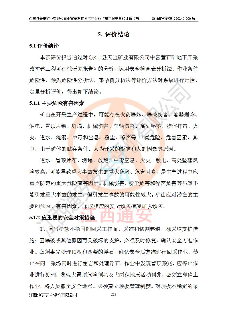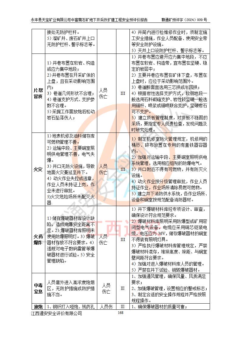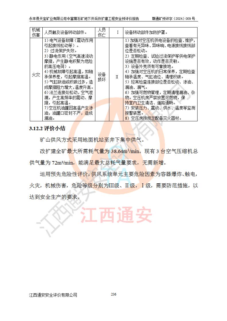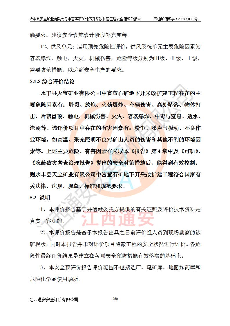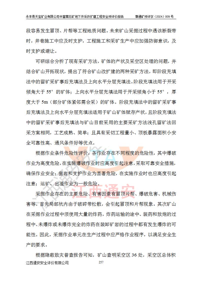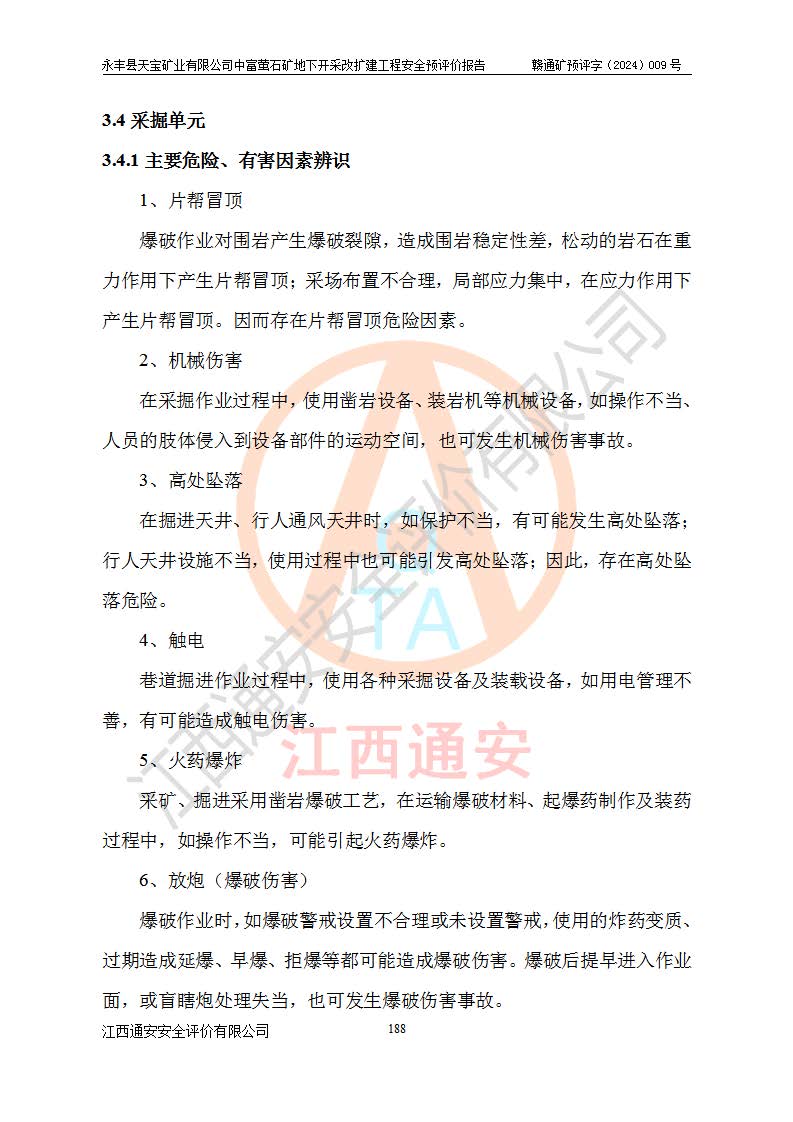 其它 | 永丰县天宝矿业有限公司中富萤石矿地下开采改扩建工程存在的主要危险因素有:坍塌、放炮、火药爆炸、**伤害、高处坠落、物体打击、片帮冒顶、触电、机械伤害、火灾、容器爆炸、中毒与窒息、透水、淹溺等。该评价项目中存在的有害因素有:粉尘、噪声与振动、不良作业环境,如高温、采光照明不良对矿山人员的伤害和其他不利的环境因素等。上述主要危险、有害因素在采取本《报告》第4章中及《可研》、《隐蔽致灾普查治理报告》提出的安全对策措施后,能得到**控制,则永丰县天宝矿业有限公司中富萤石矿地下开采改扩建工程符合**有关法律、法规、规章、标准和规范要求。 | ||||