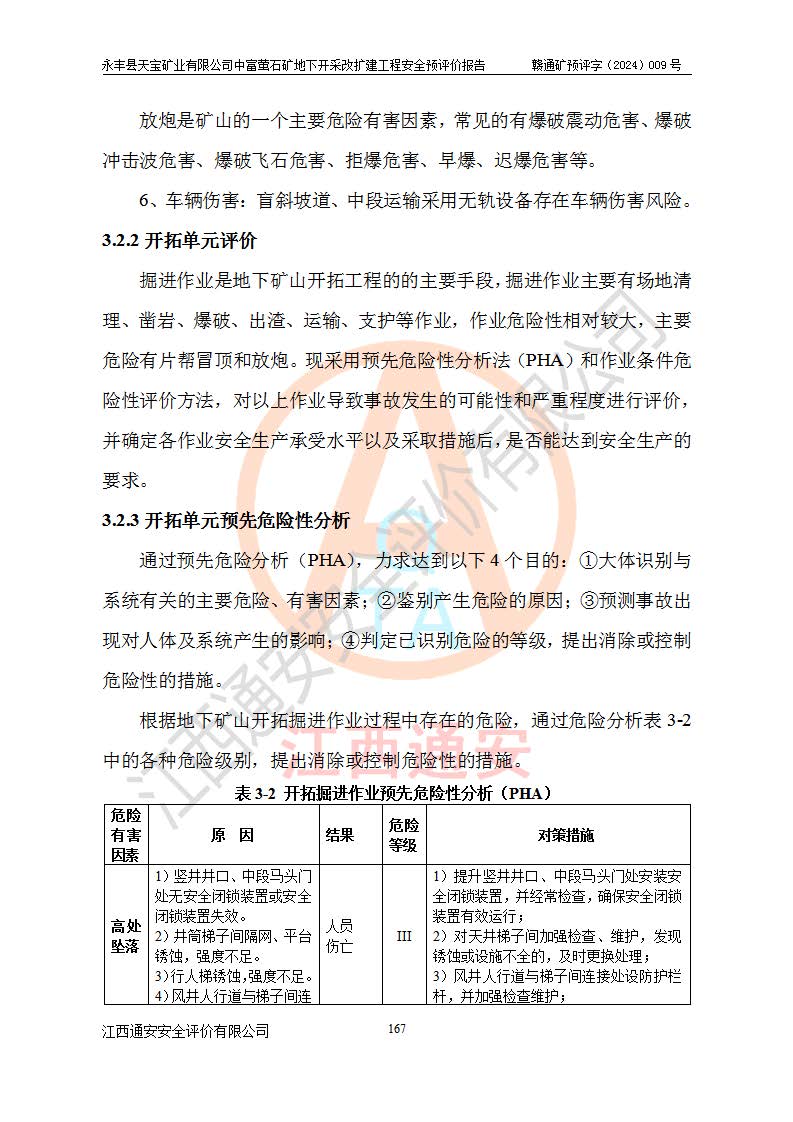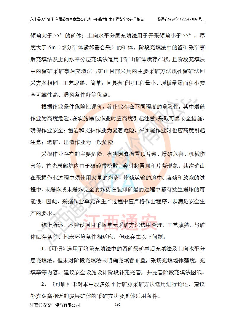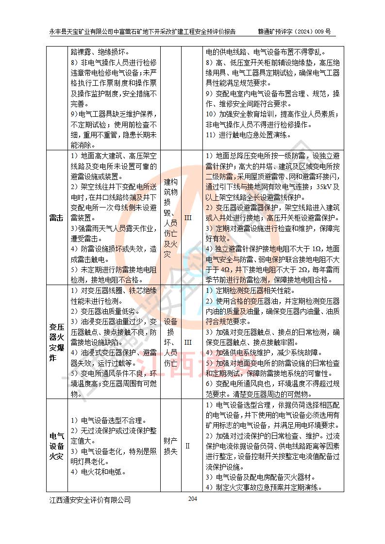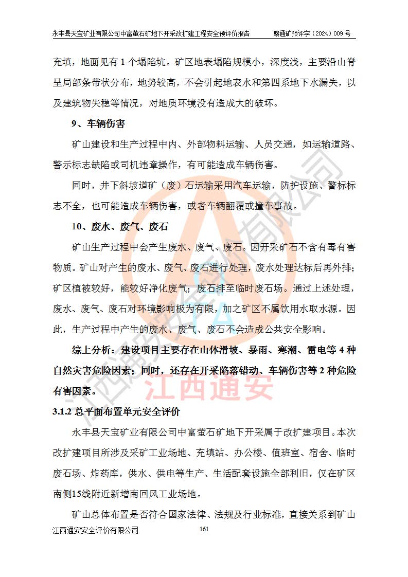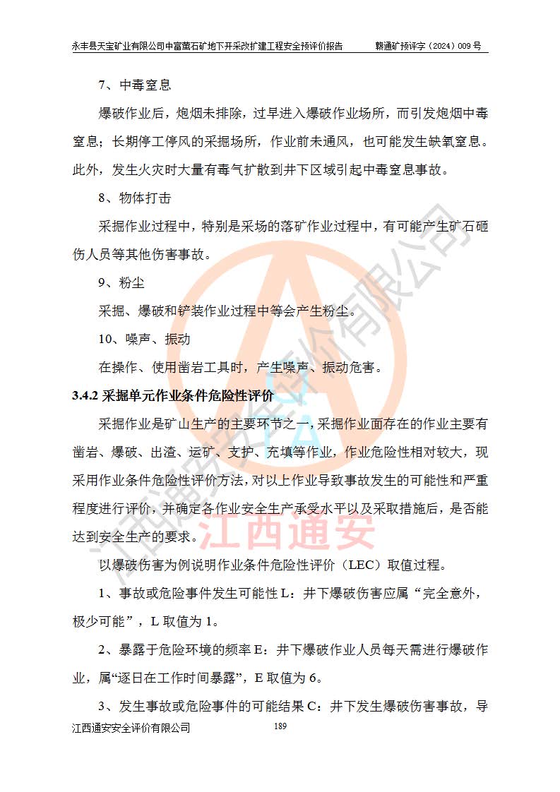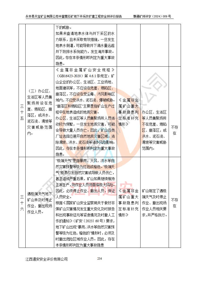 其它 | 永丰县天宝矿业有限公司中富萤石矿地下开采改扩建工程存在的主要危险因素有:坍塌、放炮、火药爆炸、**伤害、高处坠落、物体打击、片帮冒顶、触电、机械伤害、火灾、容器爆炸、中毒与窒息、透水、淹溺等。该评价项目中存在的有害因素有:粉尘、噪声与振动、不良作业环境,如高温、采光照明不良对矿山人员的伤害和其他不利的环境因素等。上述主要危险、有害因素在采取本《报告》第4章中及《可研》、《隐蔽致灾普查治理报告》提出的安全对策措施后,能得到**控制,则永丰县天宝矿业有限公司中富萤石矿地下开采改扩建工程符合**有关法律、法规、规章、标准和规范要求。 | ||||