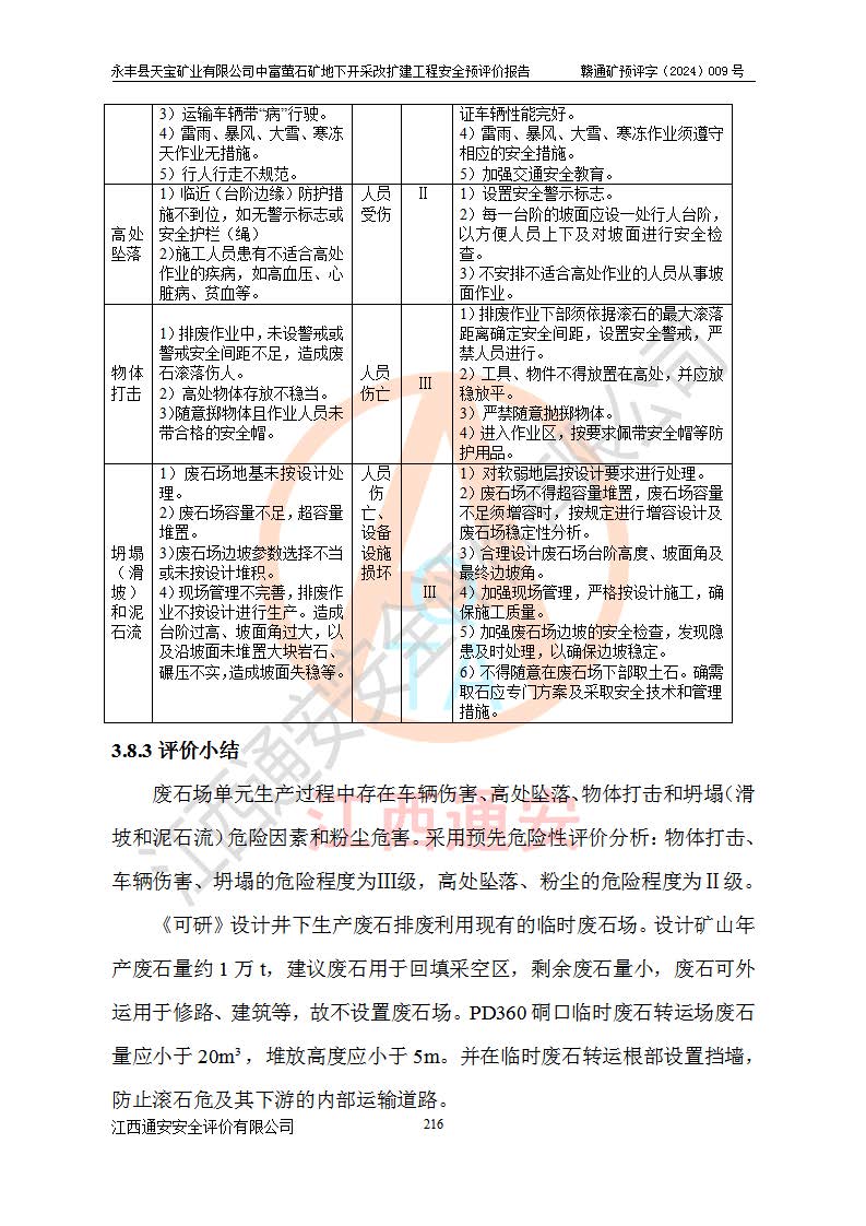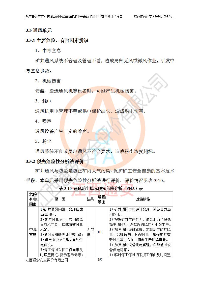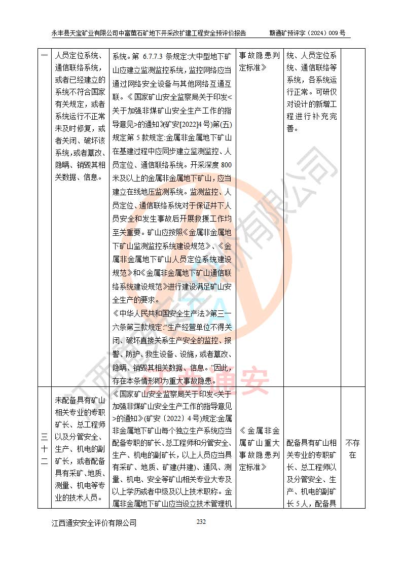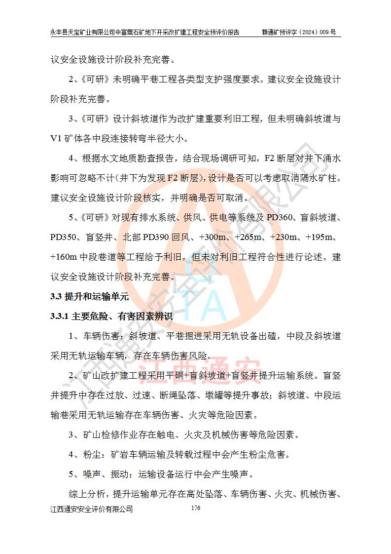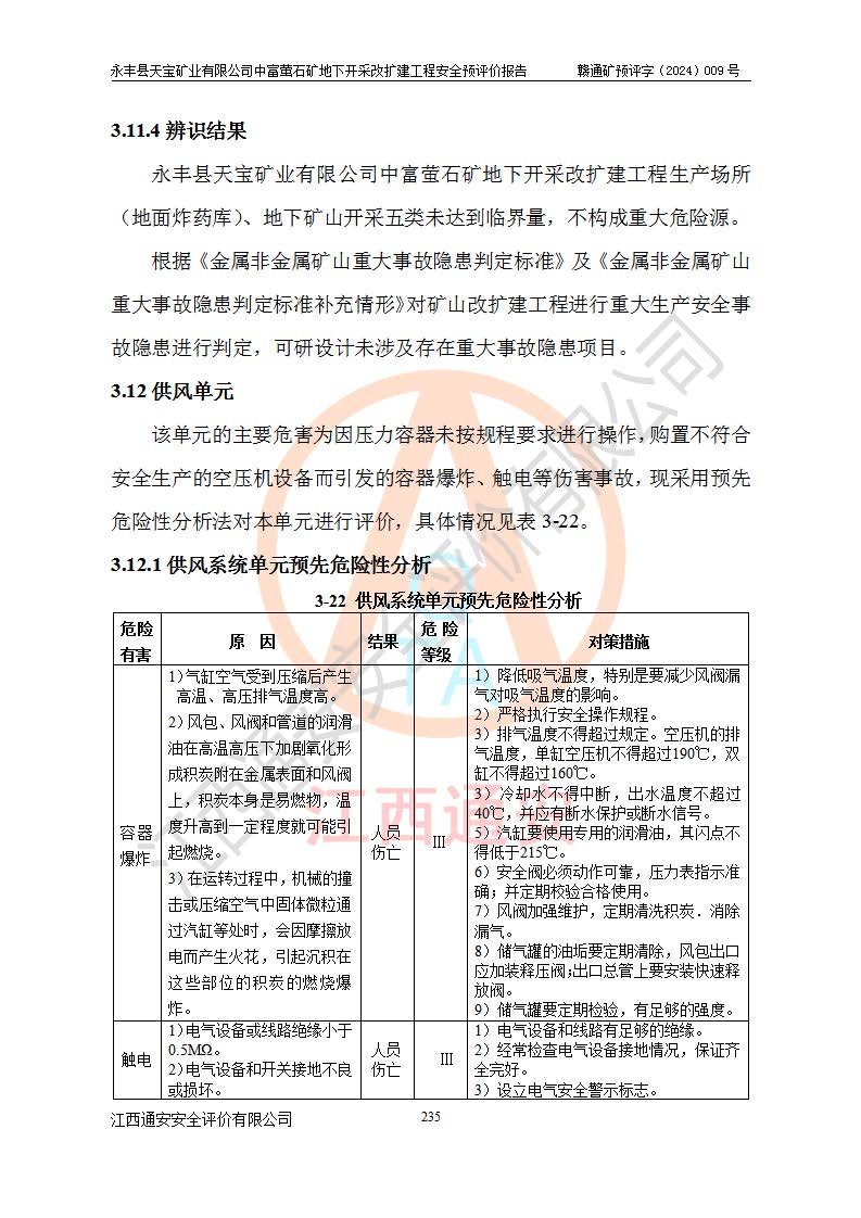 其它 | 永丰县天宝矿业有限公司中富萤石矿地下开采改扩建工程存在的主要危险因素有:坍塌、放炮、火药爆炸、**伤害、高处坠落、物体打击、片帮冒顶、触电、机械伤害、火灾、容器爆炸、中毒与窒息、透水、淹溺等。该评价项目中存在的有害因素有:粉尘、噪声与振动、不良作业环境,如高温、采光照明不良对矿山人员的伤害和其他不利的环境因素等。上述主要危险、有害因素在采取本《报告》第4章中及《可研》、《隐蔽致灾普查治理报告》提出的安全对策措施后,能得到**控制,则永丰县天宝矿业有限公司中富萤石矿地下开采改扩建工程符合**有关法律、法规、规章、标准和规范要求。 | ||||