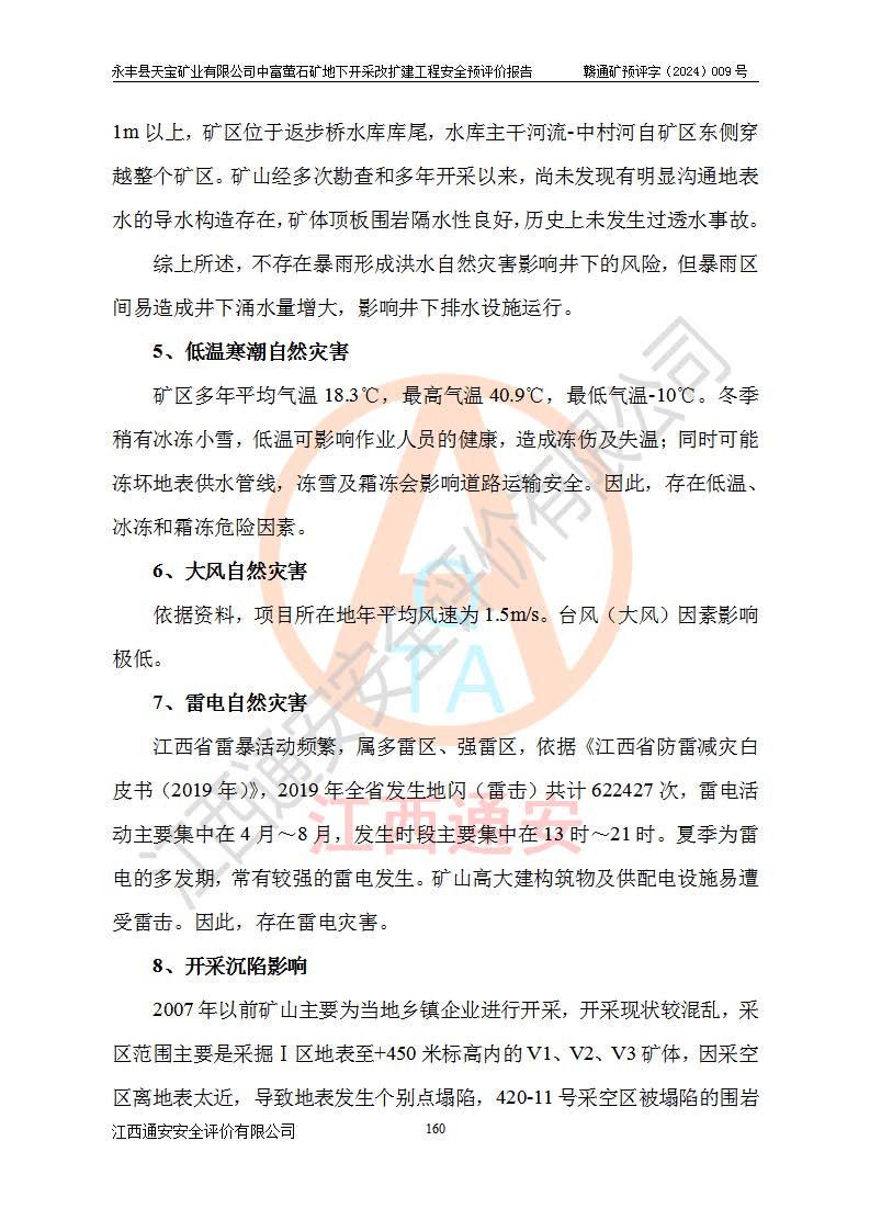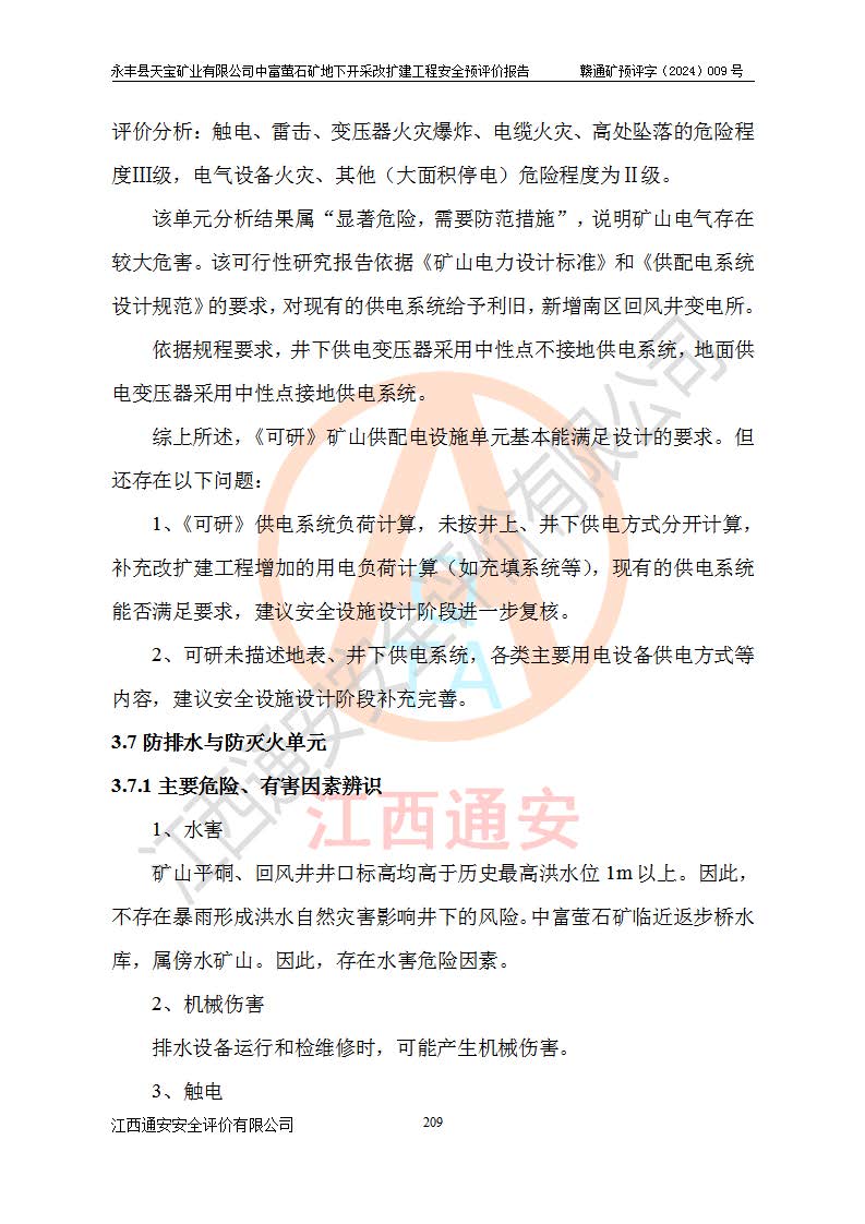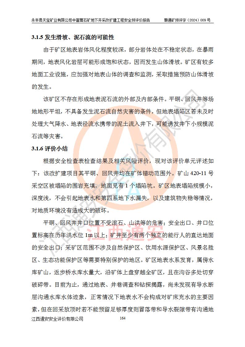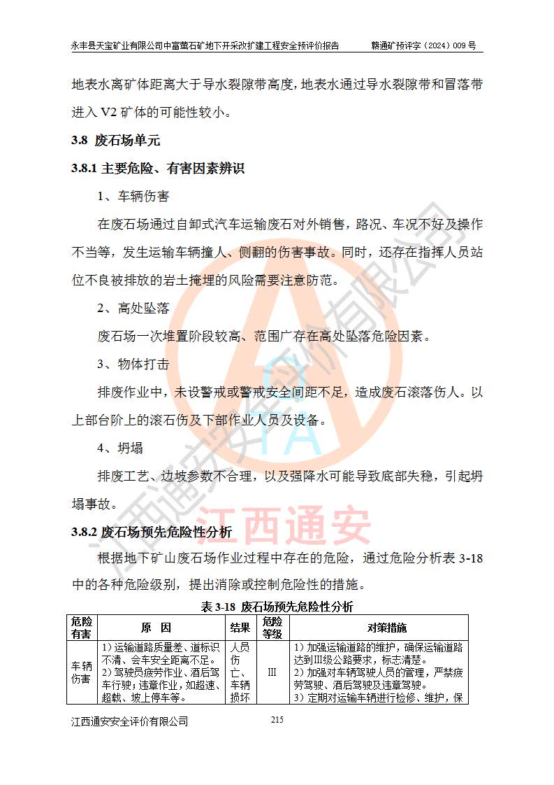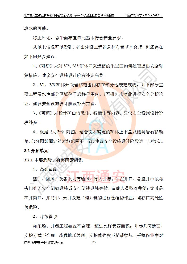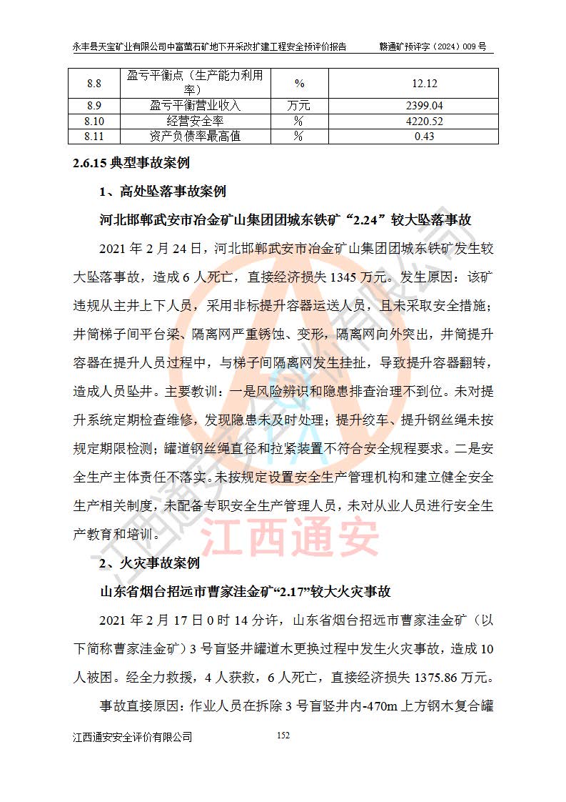 其它 | 永丰县天宝矿业有限公司中富萤石矿地下开采改扩建工程存在的主要危险因素有:坍塌、放炮、火药爆炸、**伤害、高处坠落、物体打击、片帮冒顶、触电、机械伤害、火灾、容器爆炸、中毒与窒息、透水、淹溺等。该评价项目中存在的有害因素有:粉尘、噪声与振动、不良作业环境,如高温、采光照明不良对矿山人员的伤害和其他不利的环境因素等。上述主要危险、有害因素在采取本《报告》第4章中及《可研》、《隐蔽致灾普查治理报告》提出的安全对策措施后,能得到**控制,则永丰县天宝矿业有限公司中富萤石矿地下开采改扩建工程符合**有关法律、法规、规章、标准和规范要求。 | ||||
