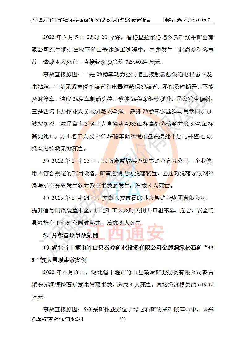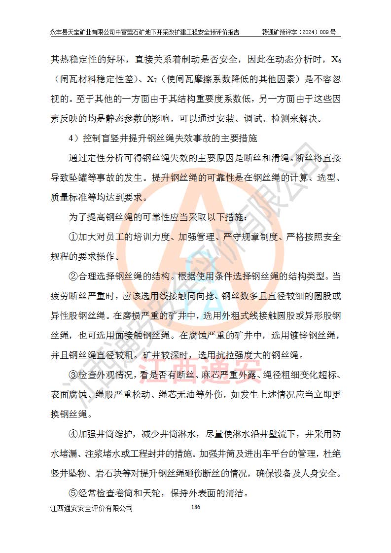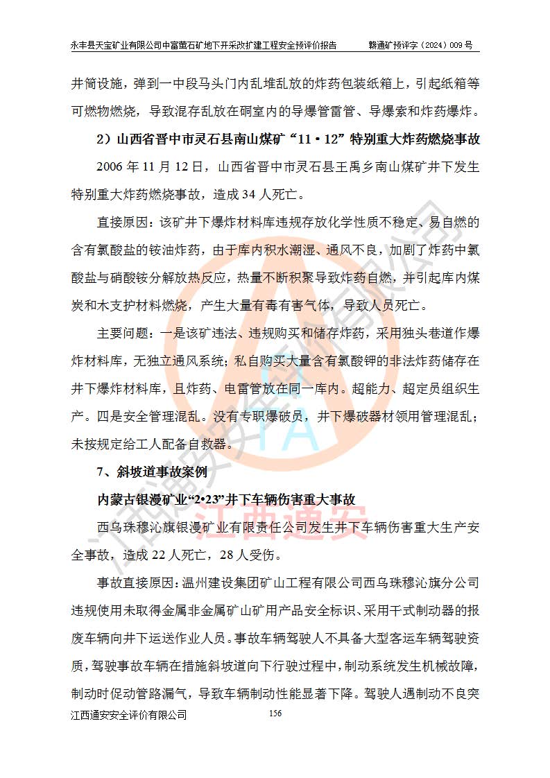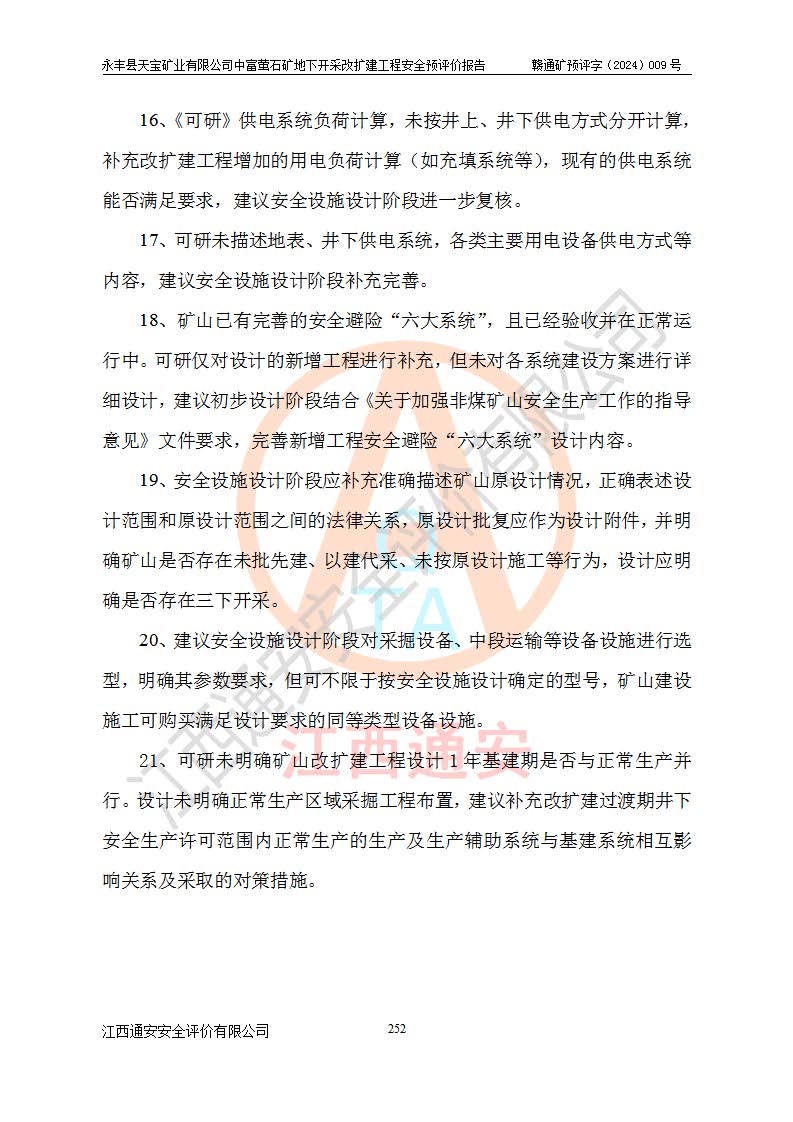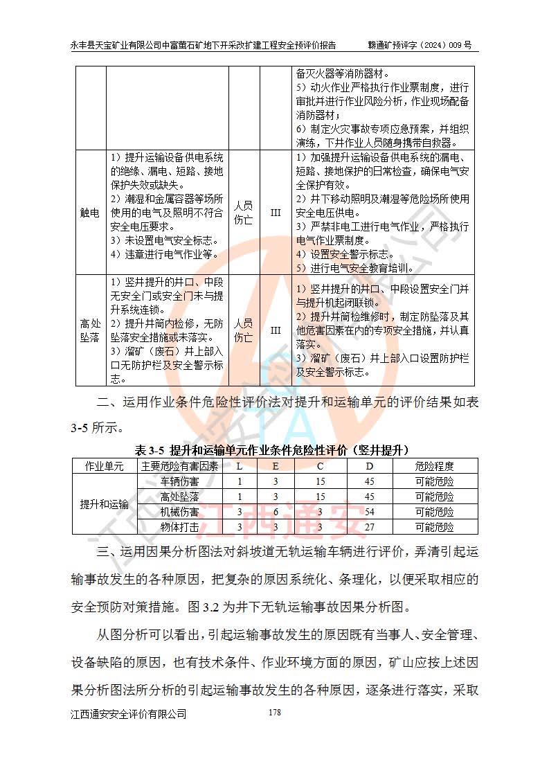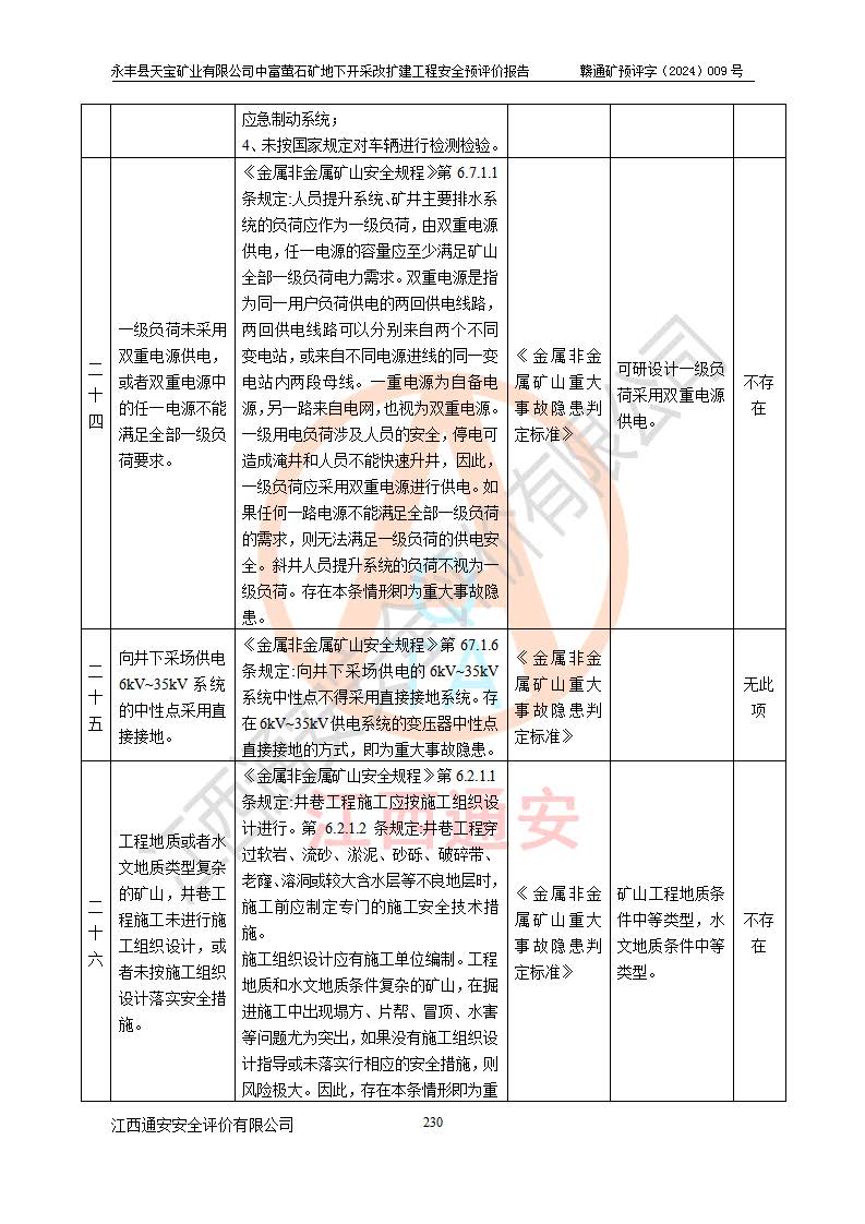 其它 | 永丰县天宝矿业有限公司中富萤石矿地下开采改扩建工程存在的主要危险因素有:坍塌、放炮、火药爆炸、**伤害、高处坠落、物体打击、片帮冒顶、触电、机械伤害、火灾、容器爆炸、中毒与窒息、透水、淹溺等。该评价项目中存在的有害因素有:粉尘、噪声与振动、不良作业环境,如高温、采光照明不良对矿山人员的伤害和其他不利的环境因素等。上述主要危险、有害因素在采取本《报告》第4章中及《可研》、《隐蔽致灾普查治理报告》提出的安全对策措施后,能得到**控制,则永丰县天宝矿业有限公司中富萤石矿地下开采改扩建工程符合**有关法律、法规、规章、标准和规范要求。 | ||||