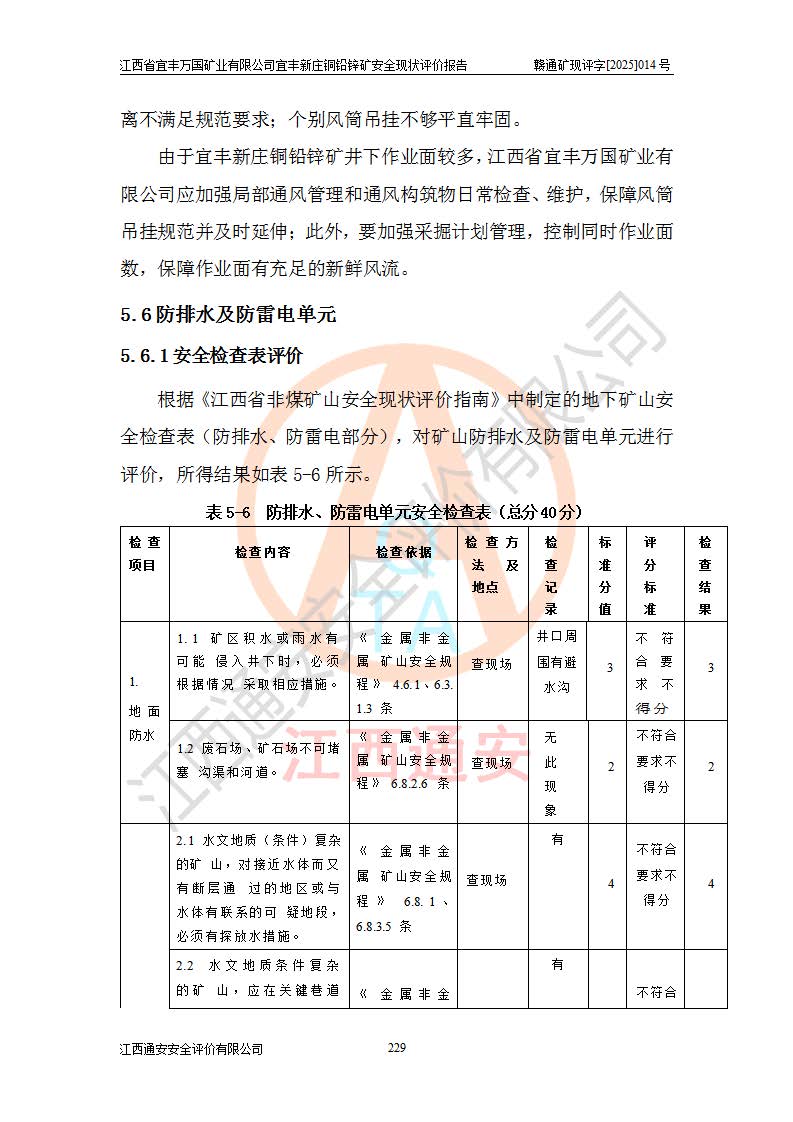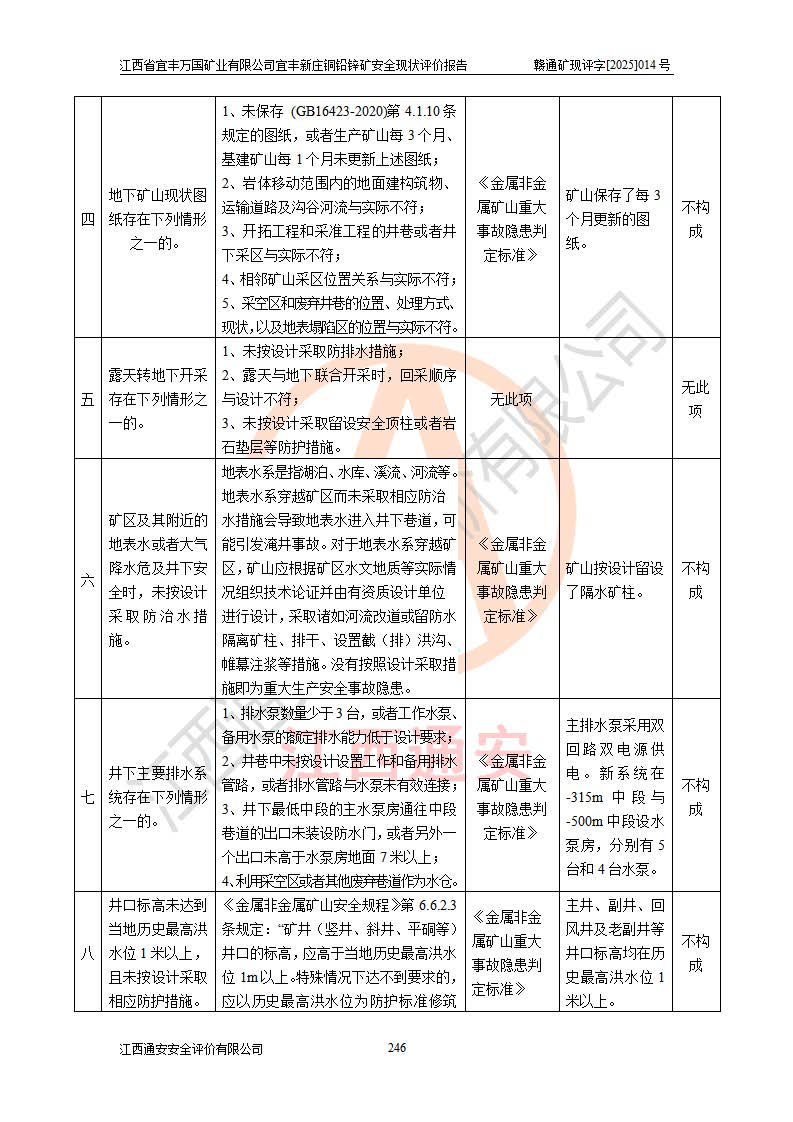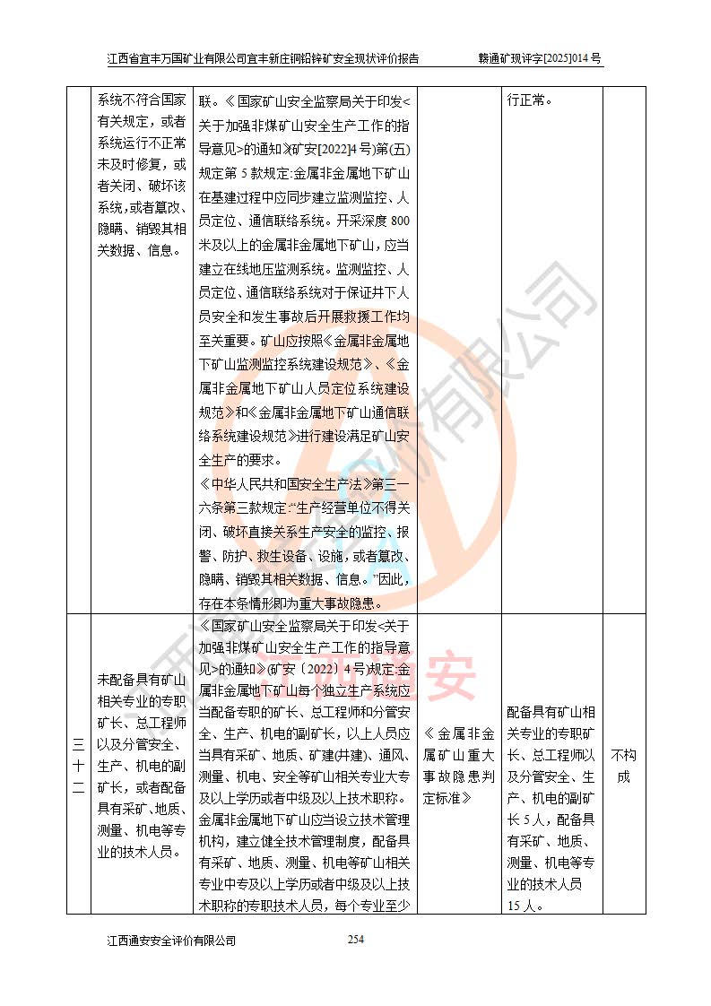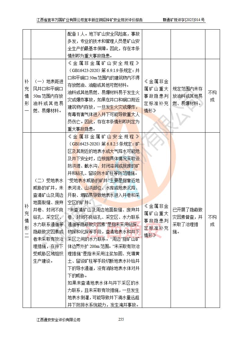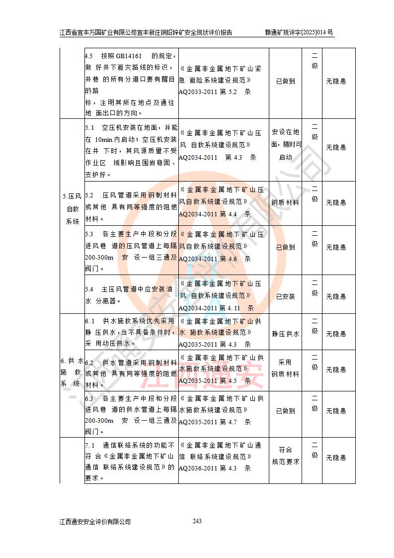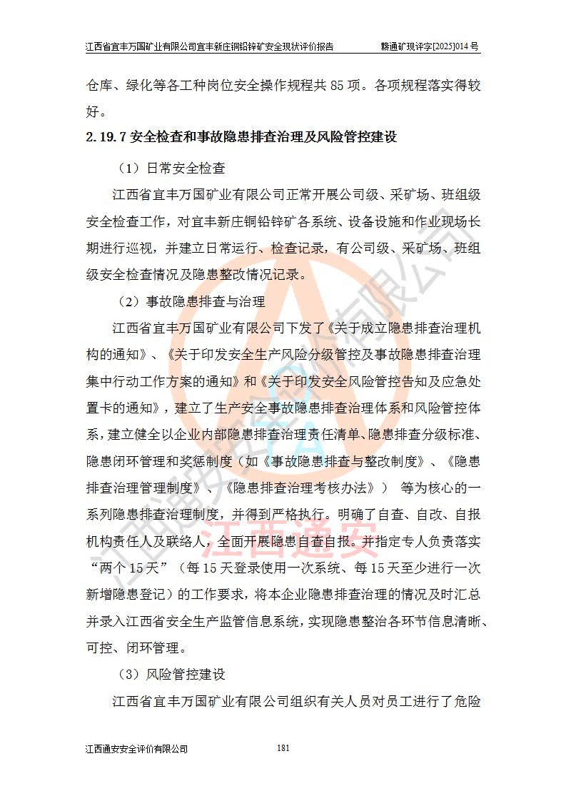 其它 | 江西省宜丰万国矿业有限公司宜丰新庄铜铅锌矿地下开采的主要生产及辅助系统:提升运输、排水、供配电、通风、供风、采掘、安全避险“六大系统”等符合法律法规要求和规程、规范要求;各种危险有害因素及不可接受的风险在运行中认真落实行之**的技术措施或管理措施,严格按规程,按要求加强管理,可以避免和控制各类事故,**安全生产。现阶段矿山设备、设施和场所符合**安全生产有关法律、法规、标准及规范的规定。矿山采用竖井开拓方式,安全生产条件较好;安全管理能满足法规要求,矿山现状与安全设施设计一致,矿山地下开采符合**规定的安全生产条件。 | ||||