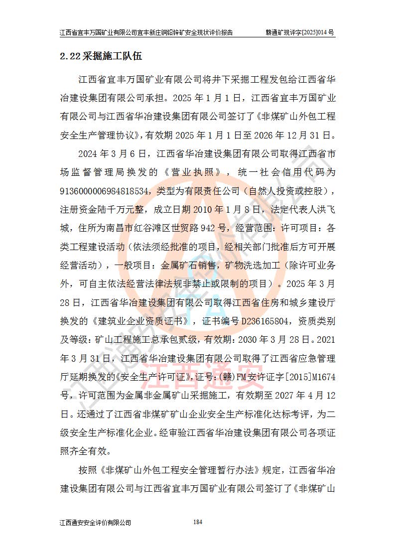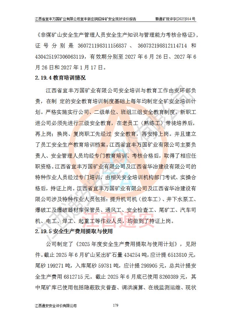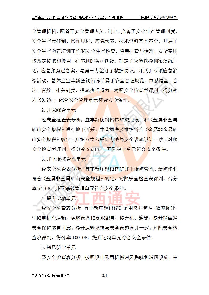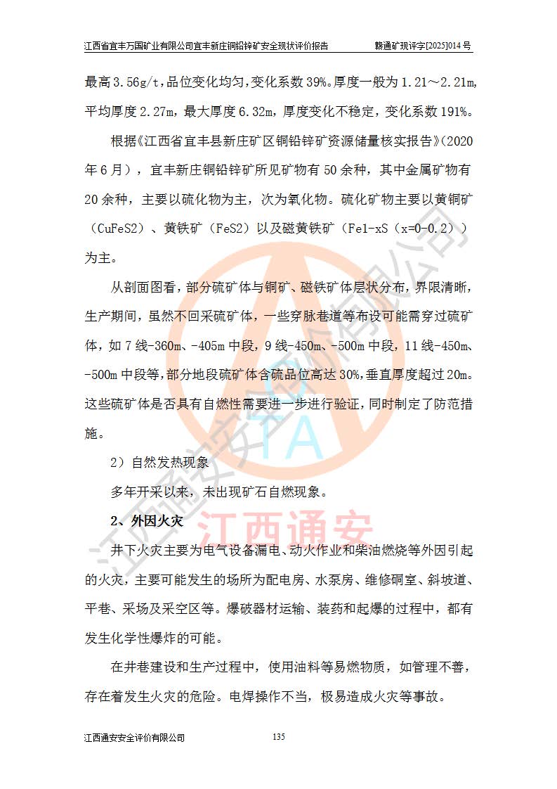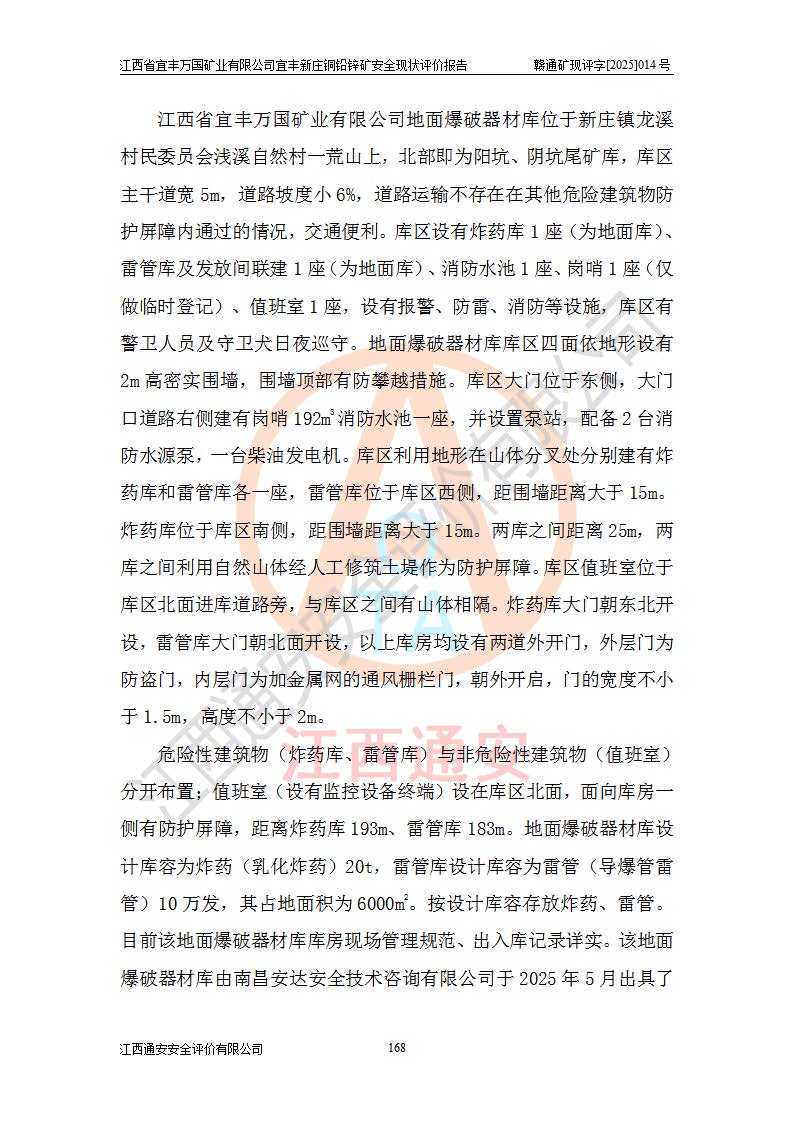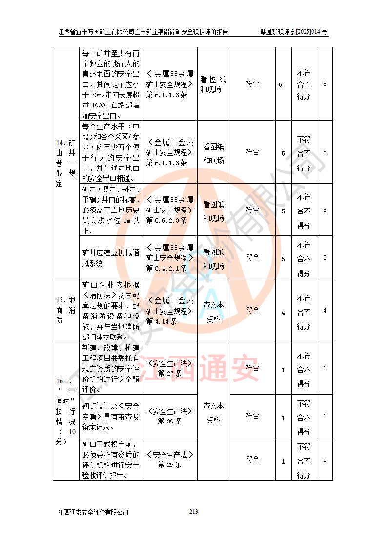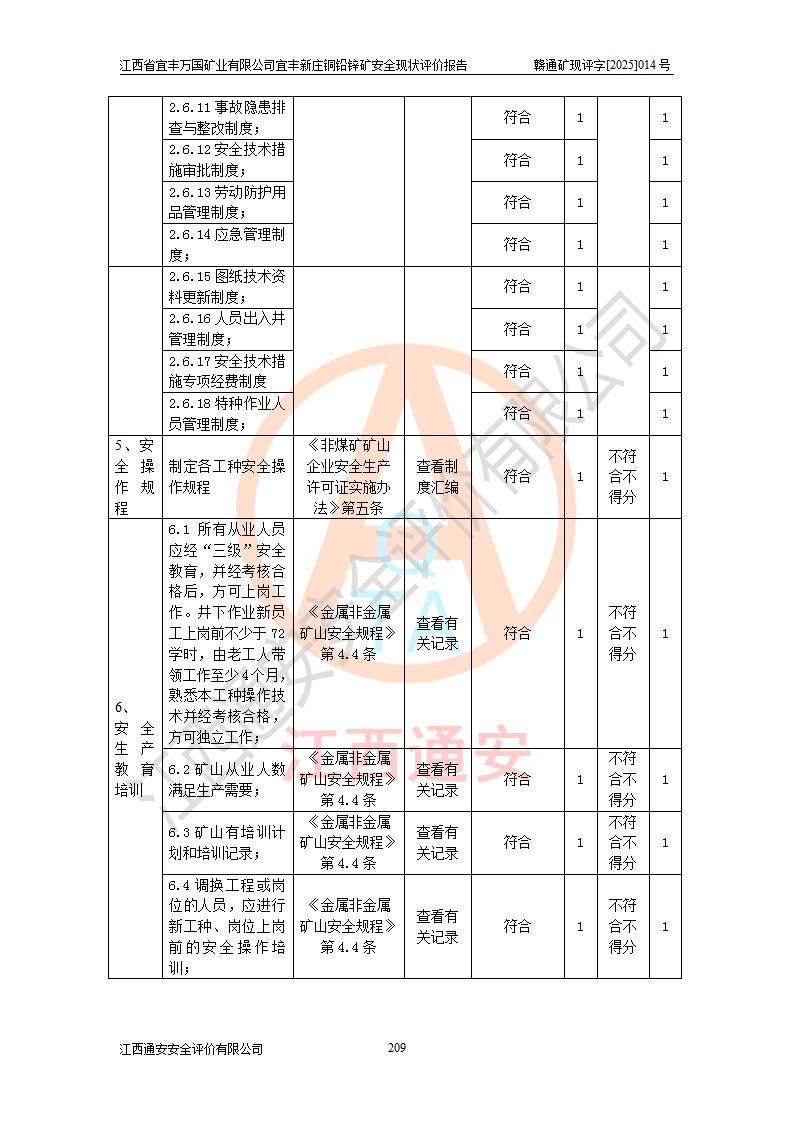 其它 | 江西省宜丰万国矿业有限公司宜丰新庄铜铅锌矿地下开采的主要生产及辅助系统:提升运输、排水、供配电、通风、供风、采掘、安全避险“六大系统”等符合法律法规要求和规程、规范要求;各种危险有害因素及不可接受的风险在运行中认真落实行之**的技术措施或管理措施,严格按规程,按要求加强管理,可以避免和控制各类事故,**安全生产。现阶段矿山设备、设施和场所符合**安全生产有关法律、法规、标准及规范的规定。矿山采用竖井开拓方式,安全生产条件较好;安全管理能满足法规要求,矿山现状与安全设施设计一致,矿山地下开采符合**规定的安全生产条件。 | ||||