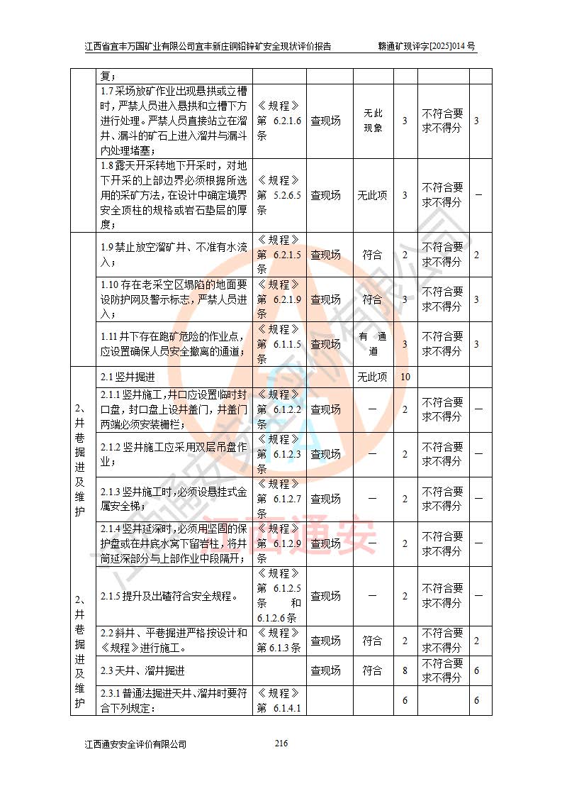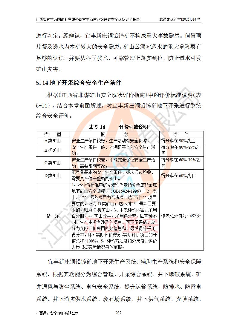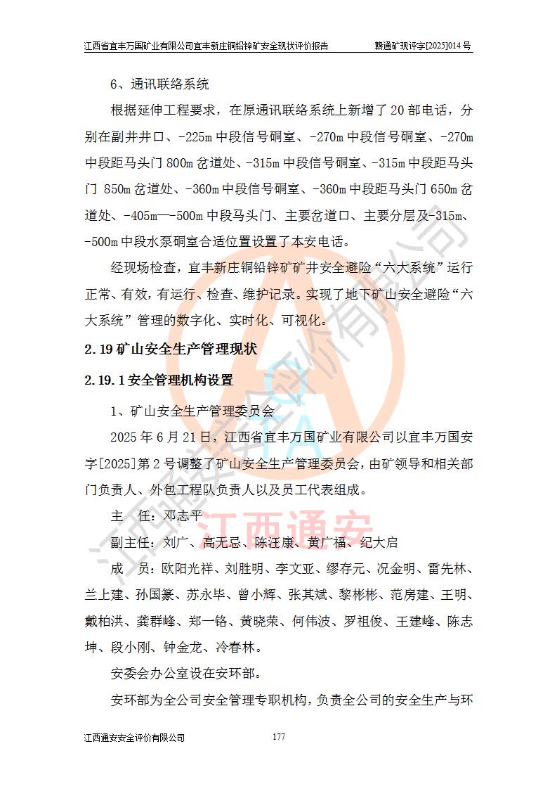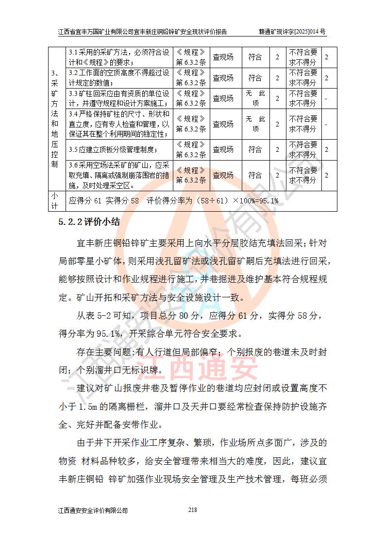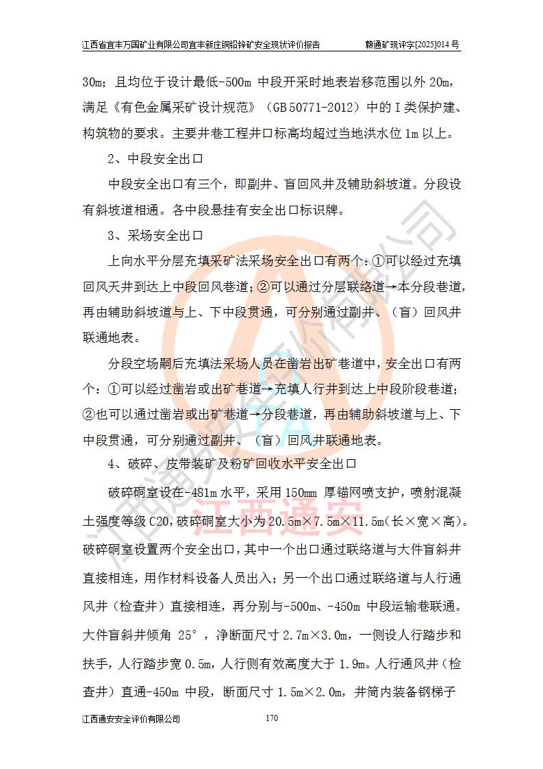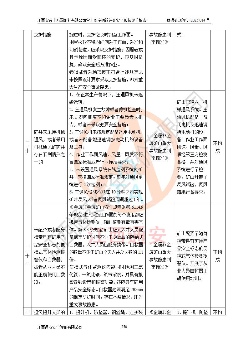 其它 | 江西省宜丰万国矿业有限公司宜丰新庄铜铅锌矿地下开采的主要生产及辅助系统:提升运输、排水、供配电、通风、供风、采掘、安全避险“六大系统”等符合法律法规要求和规程、规范要求;各种危险有害因素及不可接受的风险在运行中认真落实行之**的技术措施或管理措施,严格按规程,按要求加强管理,可以避免和控制各类事故,**安全生产。现阶段矿山设备、设施和场所符合**安全生产有关法律、法规、标准及规范的规定。矿山采用竖井开拓方式,安全生产条件较好;安全管理能满足法规要求,矿山现状与安全设施设计一致,矿山地下开采符合**规定的安全生产条件。 | ||||
