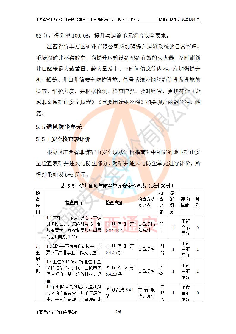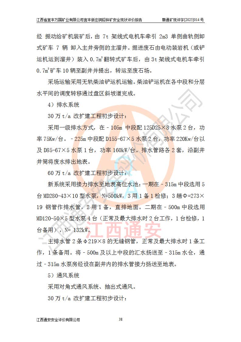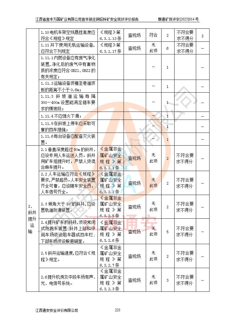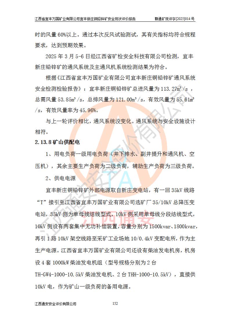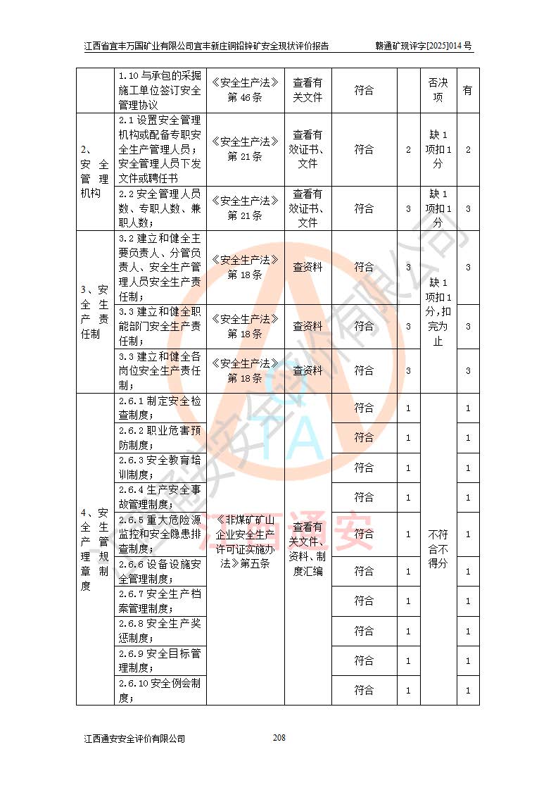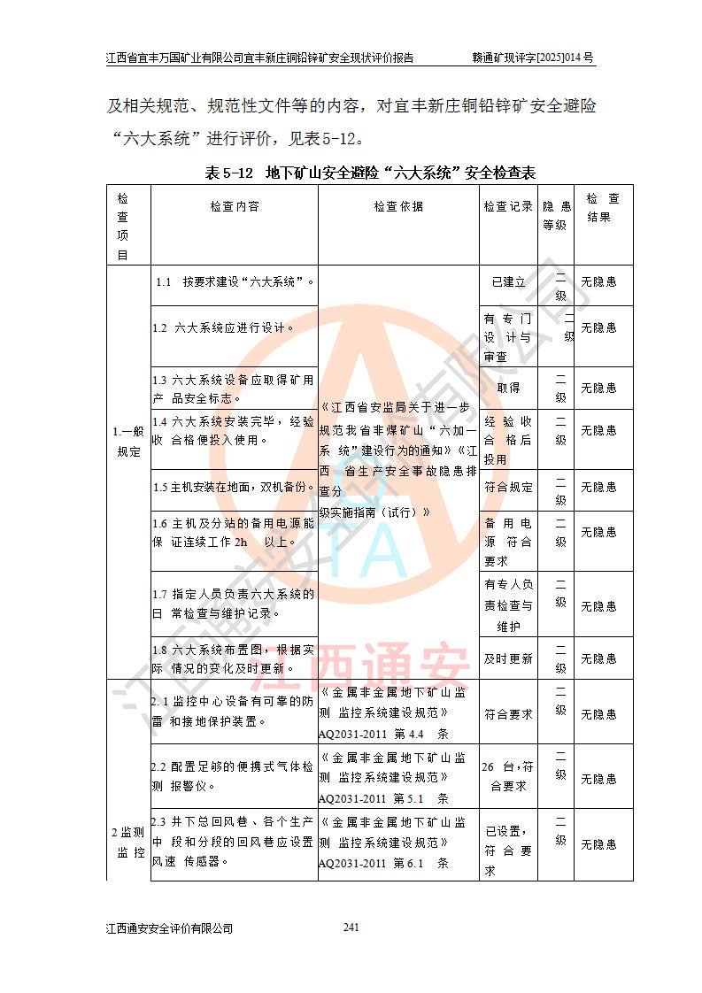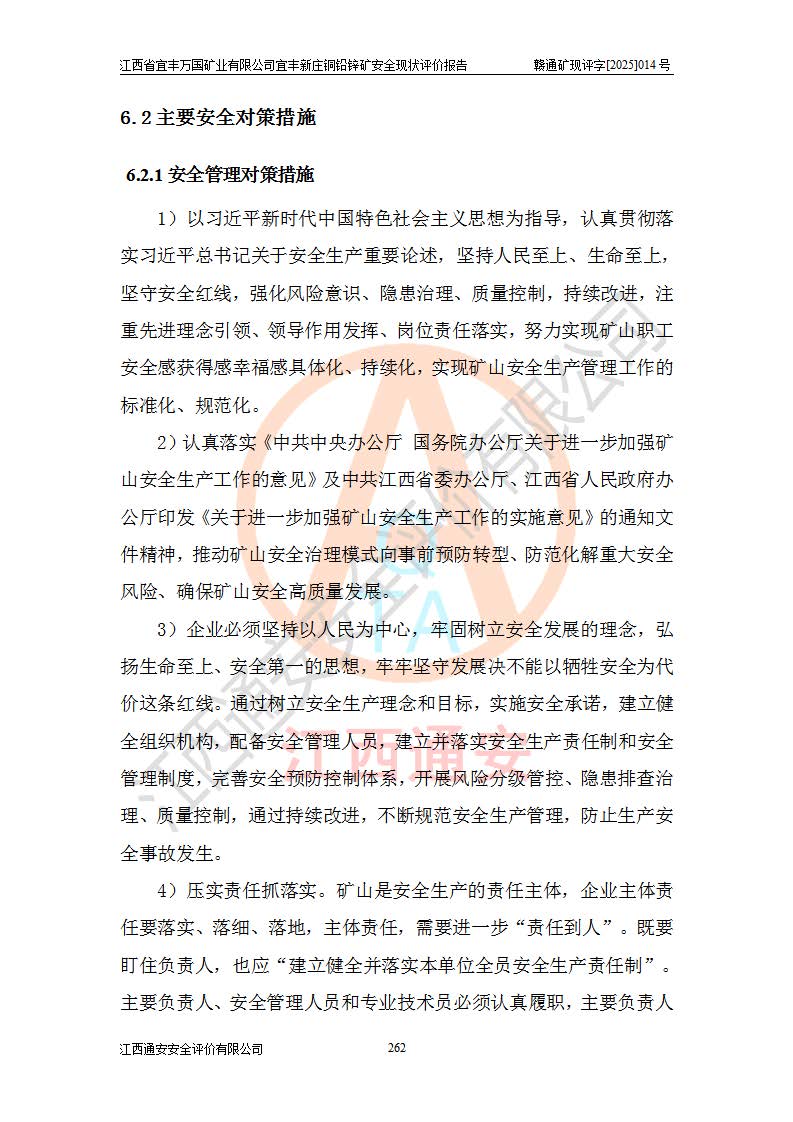 其它 | 江西省宜丰万国矿业有限公司宜丰新庄铜铅锌矿地下开采的主要生产及辅助系统:提升运输、排水、供配电、通风、供风、采掘、安全避险“六大系统”等符合法律法规要求和规程、规范要求;各种危险有害因素及不可接受的风险在运行中认真落实行之**的技术措施或管理措施,严格按规程,按要求加强管理,可以避免和控制各类事故,**安全生产。现阶段矿山设备、设施和场所符合**安全生产有关法律、法规、标准及规范的规定。矿山采用竖井开拓方式,安全生产条件较好;安全管理能满足法规要求,矿山现状与安全设施设计一致,矿山地下开采符合**规定的安全生产条件。 | ||||