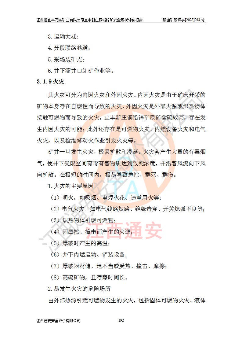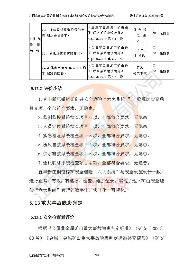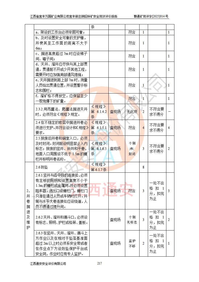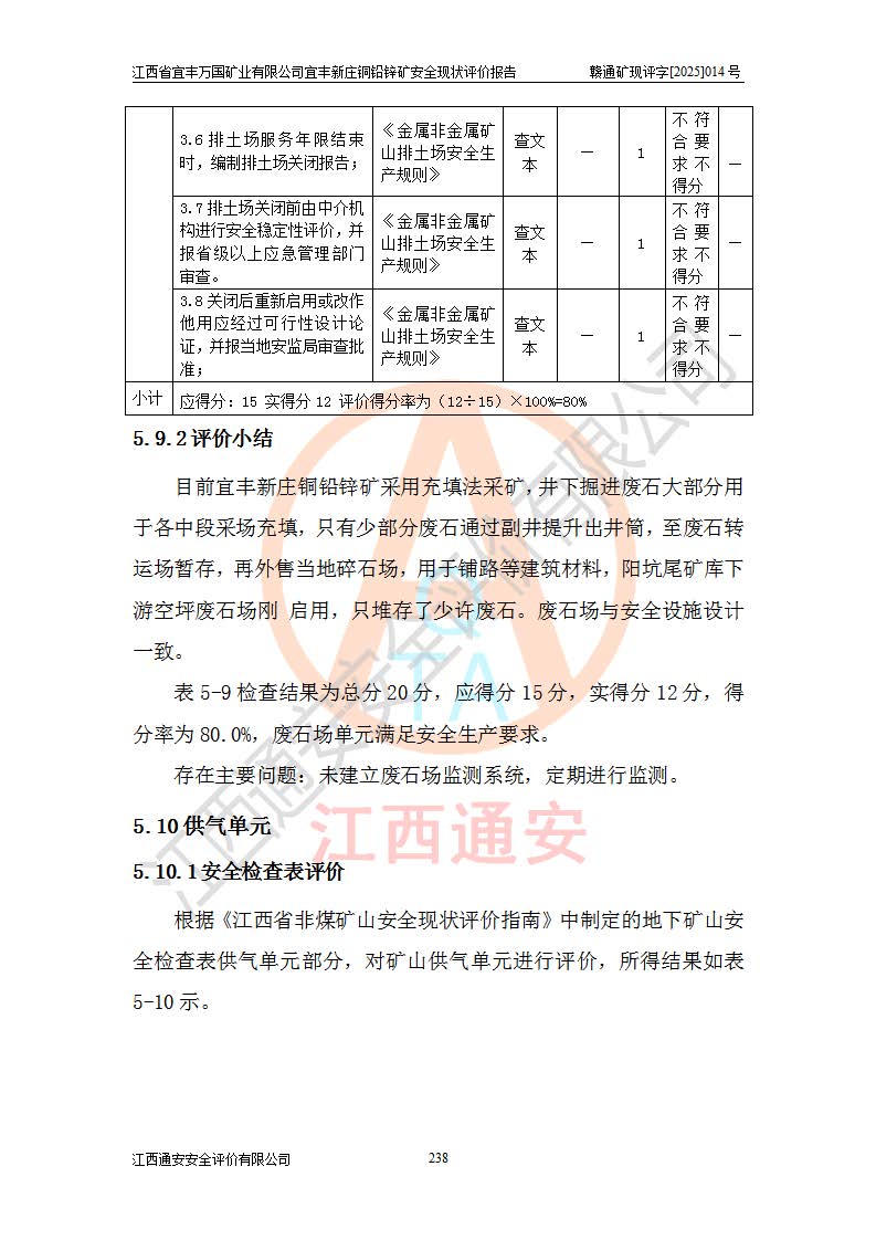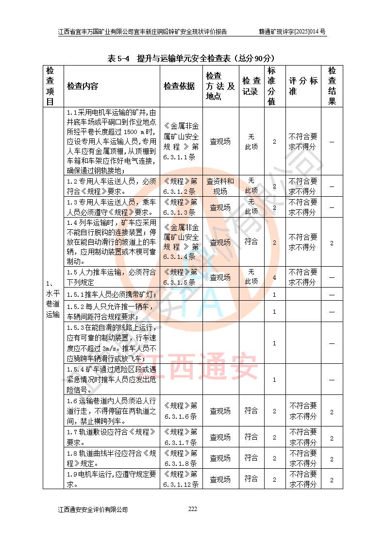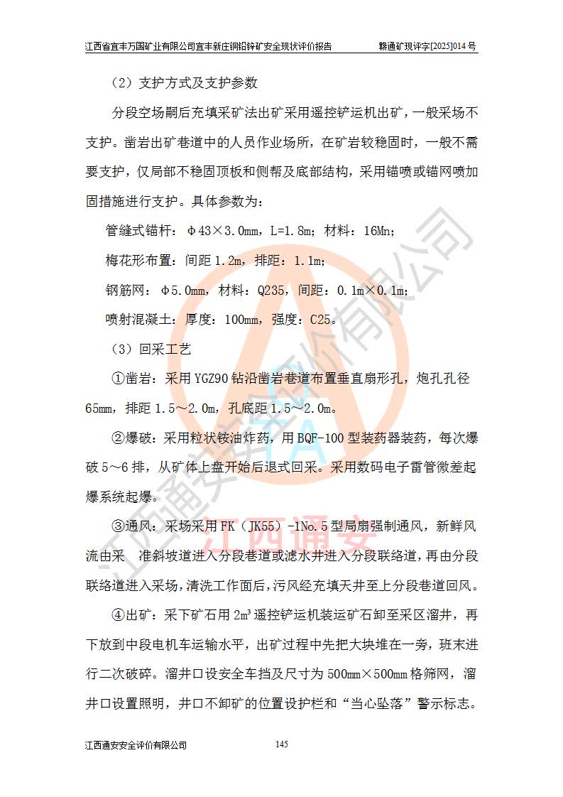 其它 | 江西省宜丰万国矿业有限公司宜丰新庄铜铅锌矿地下开采的主要生产及辅助系统:提升运输、排水、供配电、通风、供风、采掘、安全避险“六大系统”等符合法律法规要求和规程、规范要求;各种危险有害因素及不可接受的风险在运行中认真落实行之**的技术措施或管理措施,严格按规程,按要求加强管理,可以避免和控制各类事故,**安全生产。现阶段矿山设备、设施和场所符合**安全生产有关法律、法规、标准及规范的规定。矿山采用竖井开拓方式,安全生产条件较好;安全管理能满足法规要求,矿山现状与安全设施设计一致,矿山地下开采符合**规定的安全生产条件。 | ||||