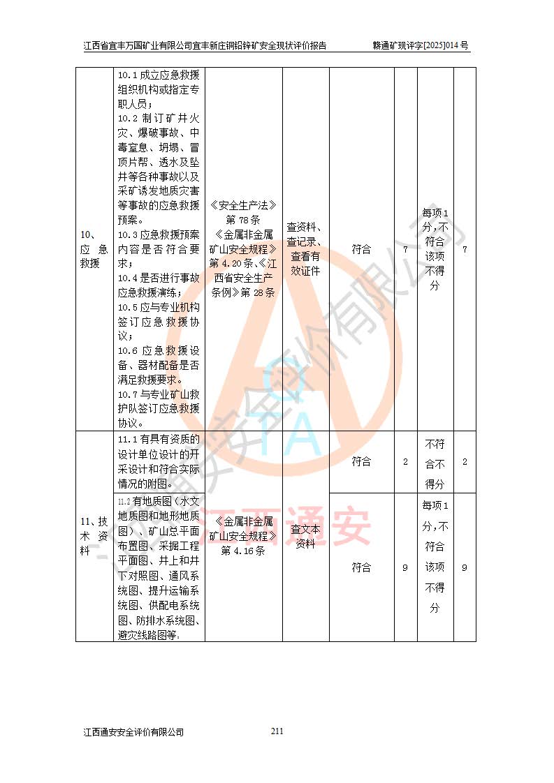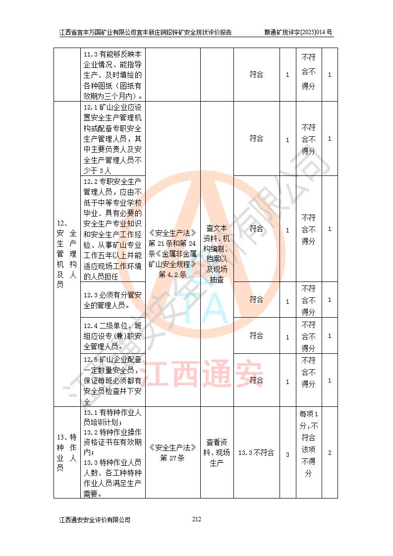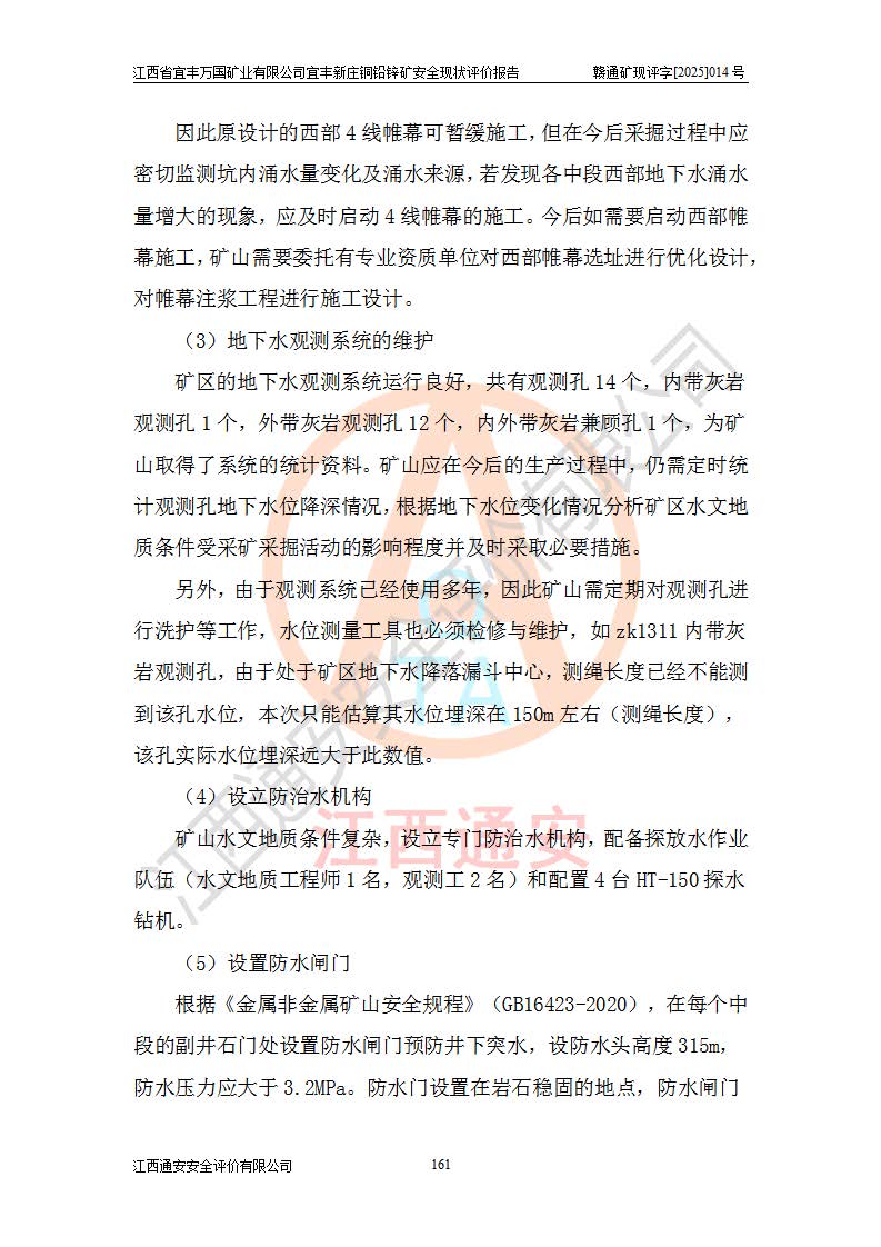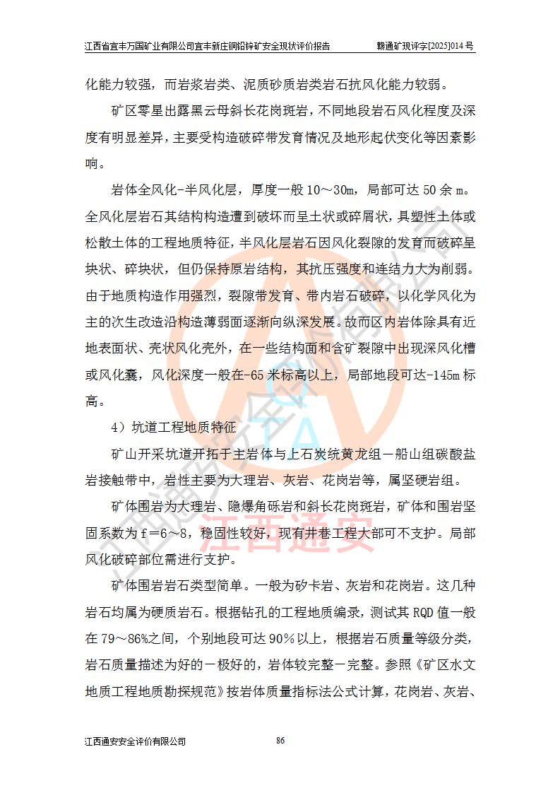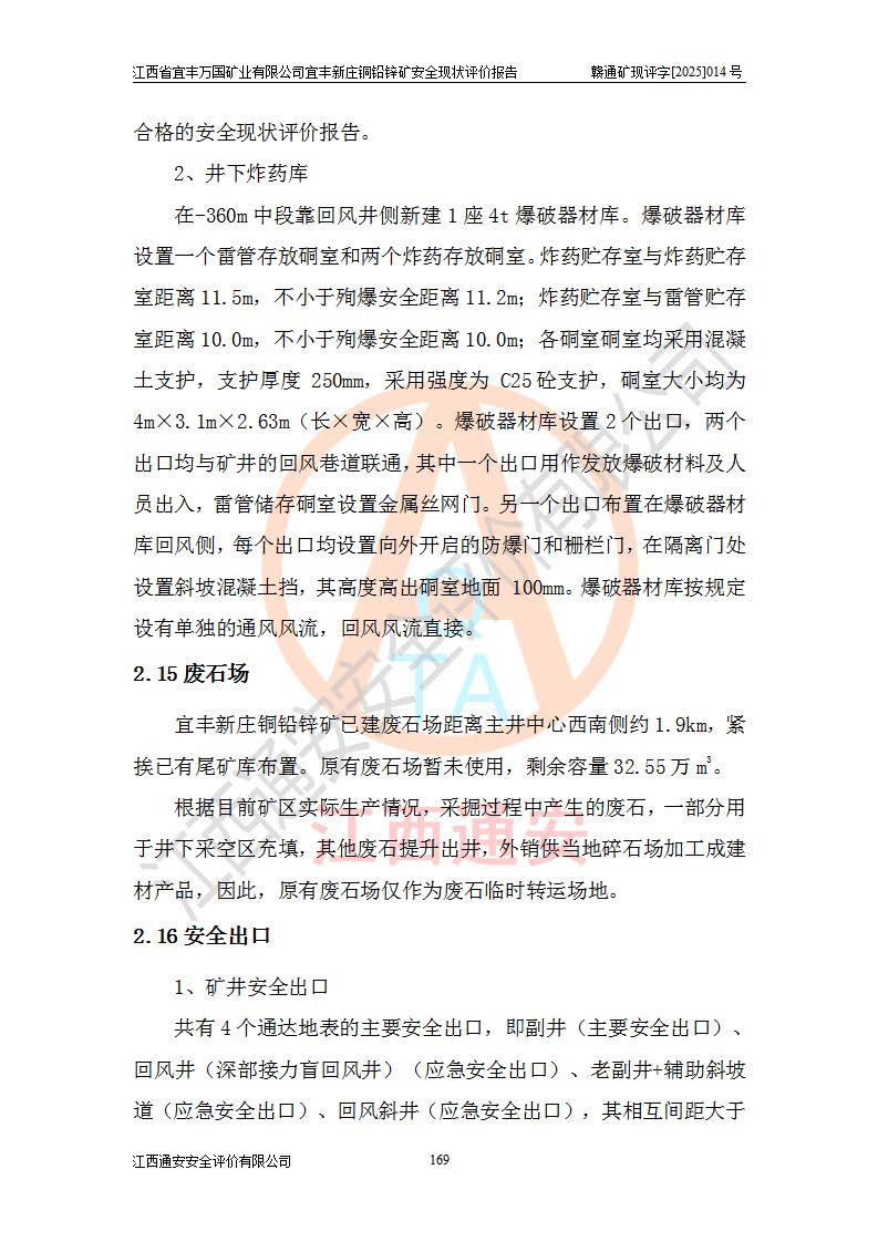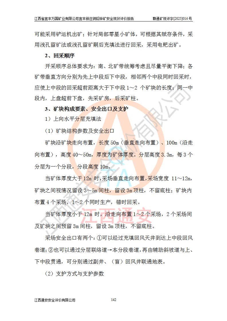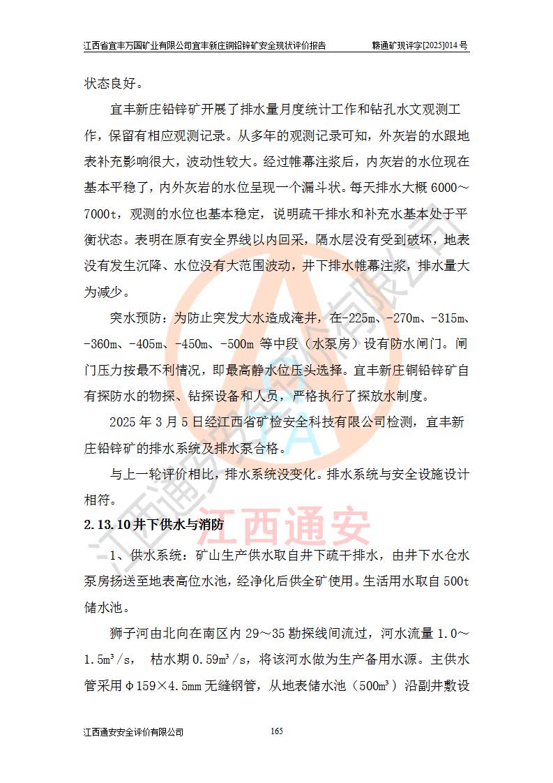 其它 | 江西省宜丰万国矿业有限公司宜丰新庄铜铅锌矿地下开采的主要生产及辅助系统:提升运输、排水、供配电、通风、供风、采掘、安全避险“六大系统”等符合法律法规要求和规程、规范要求;各种危险有害因素及不可接受的风险在运行中认真落实行之**的技术措施或管理措施,严格按规程,按要求加强管理,可以避免和控制各类事故,**安全生产。现阶段矿山设备、设施和场所符合**安全生产有关法律、法规、标准及规范的规定。矿山采用竖井开拓方式,安全生产条件较好;安全管理能满足法规要求,矿山现状与安全设施设计一致,矿山地下开采符合**规定的安全生产条件。 | ||||
