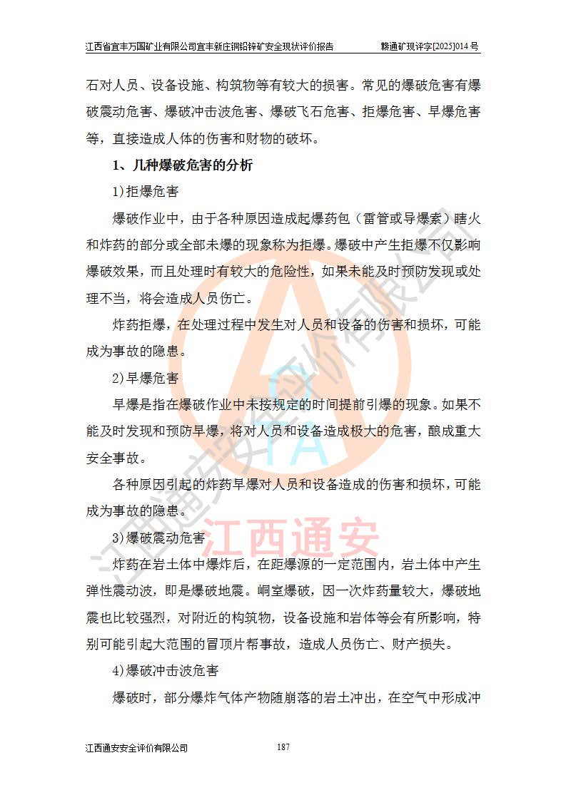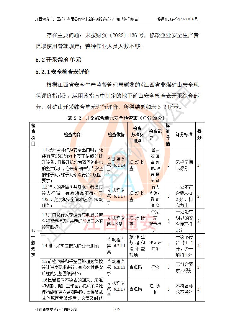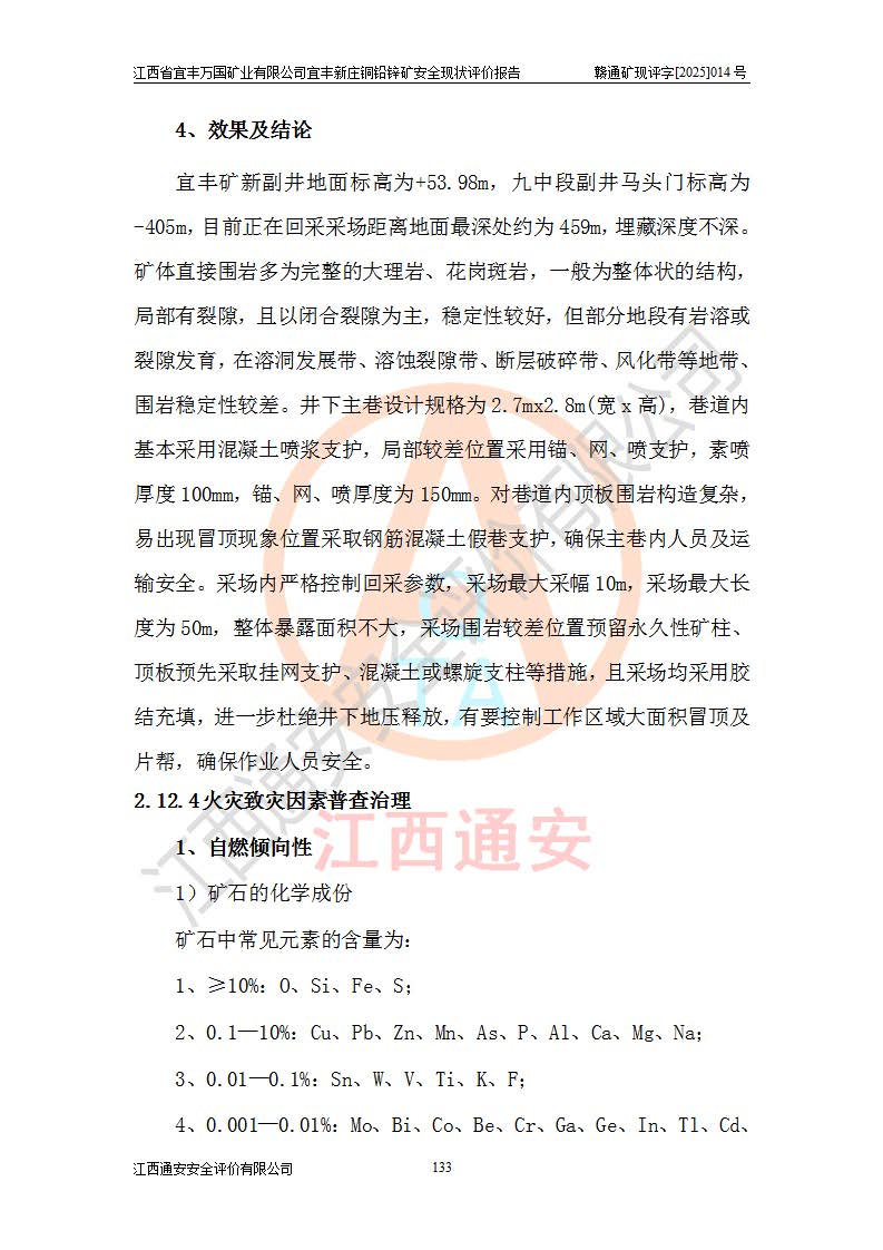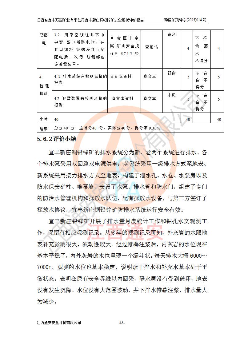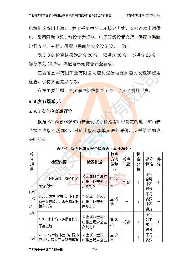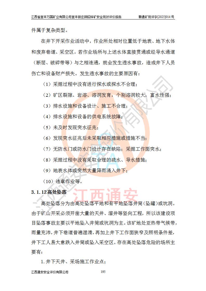 其它 | 江西省宜丰万国矿业有限公司宜丰新庄铜铅锌矿地下开采的主要生产及辅助系统:提升运输、排水、供配电、通风、供风、采掘、安全避险“六大系统”等符合法律法规要求和规程、规范要求;各种危险有害因素及不可接受的风险在运行中认真落实行之**的技术措施或管理措施,严格按规程,按要求加强管理,可以避免和控制各类事故,**安全生产。现阶段矿山设备、设施和场所符合**安全生产有关法律、法规、标准及规范的规定。矿山采用竖井开拓方式,安全生产条件较好;安全管理能满足法规要求,矿山现状与安全设施设计一致,矿山地下开采符合**规定的安全生产条件。 | ||||