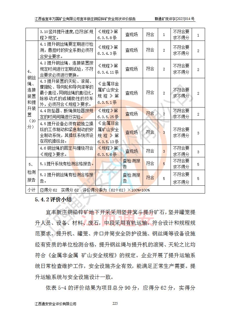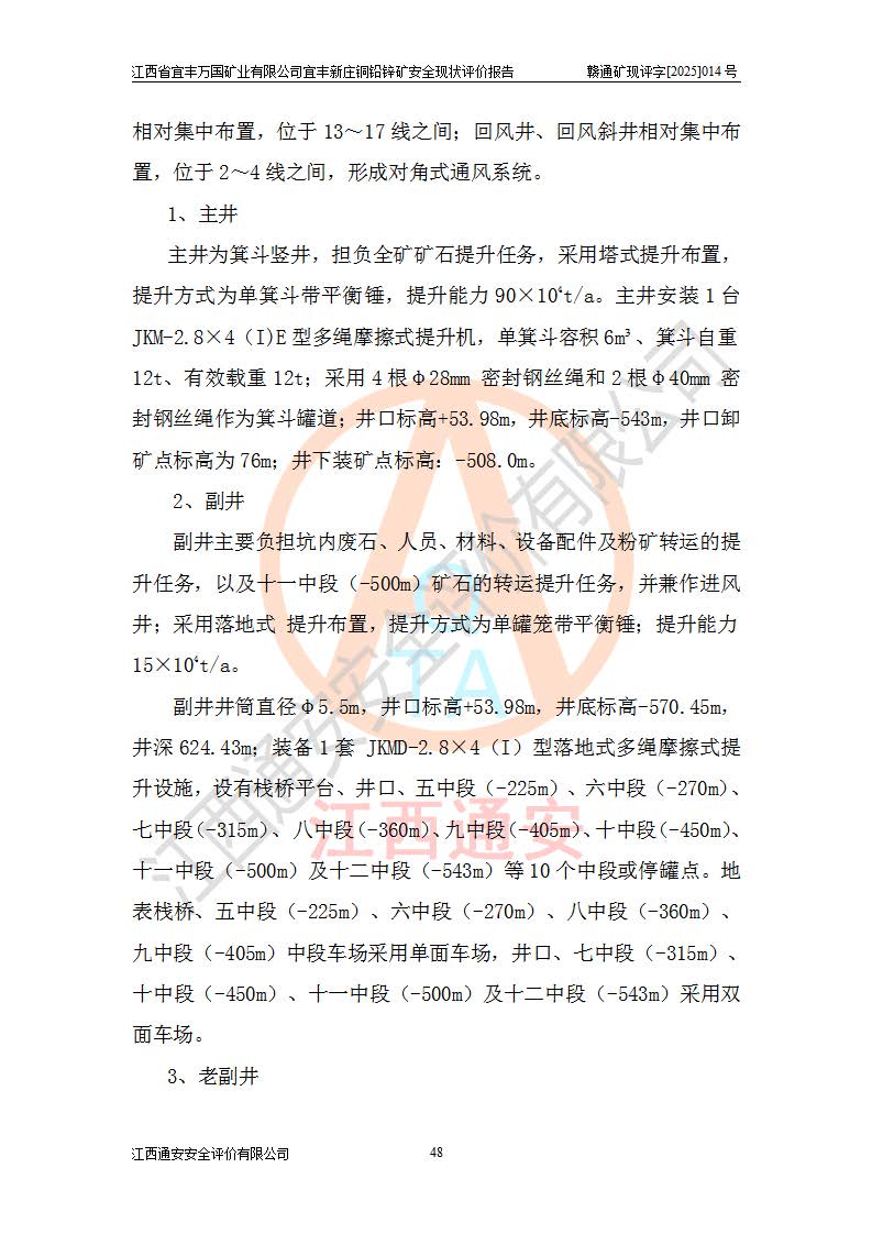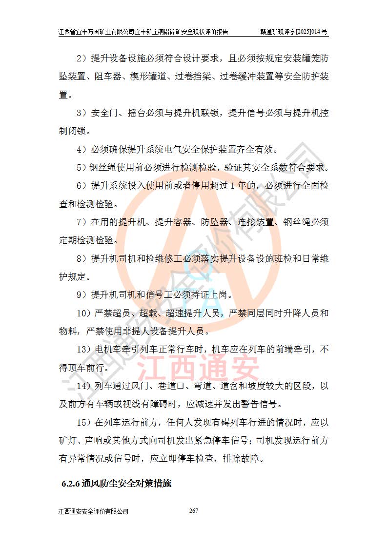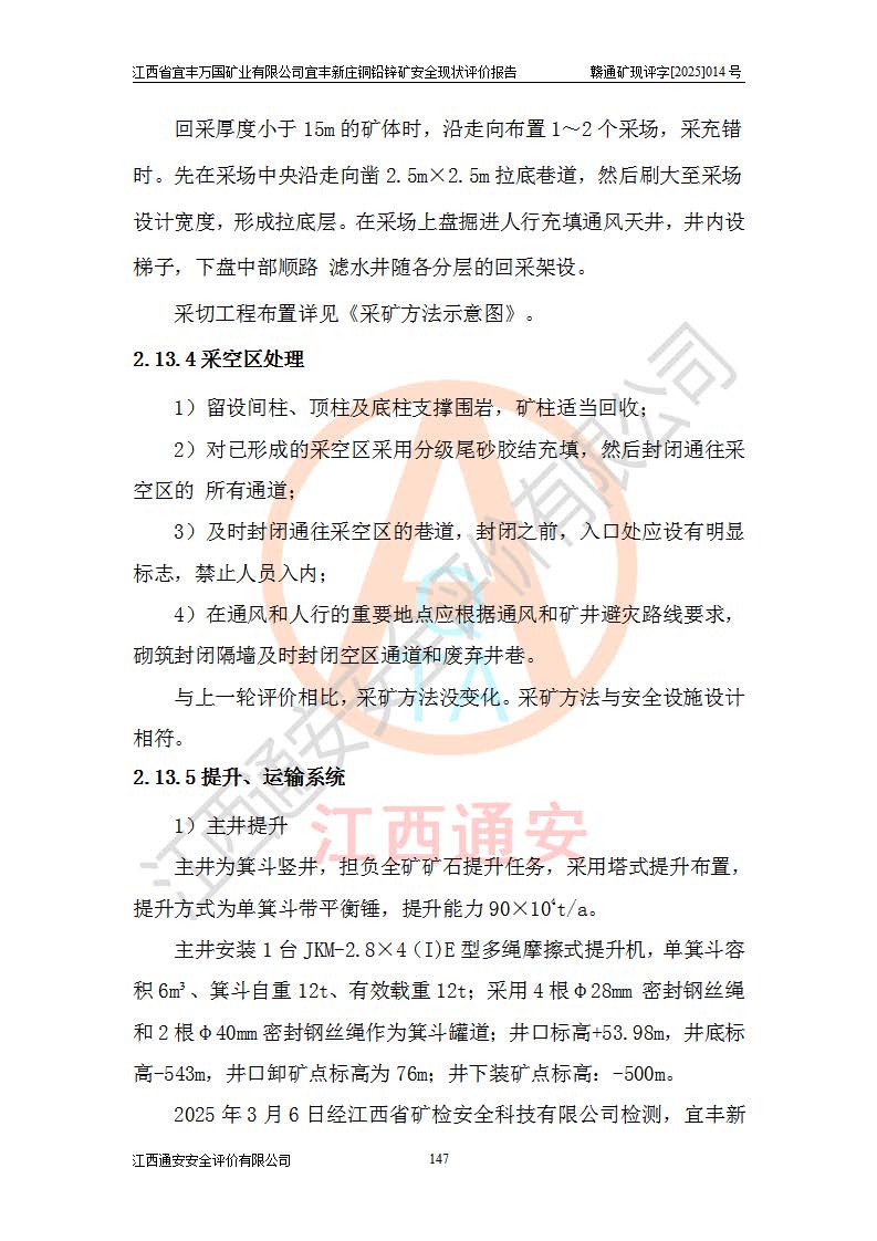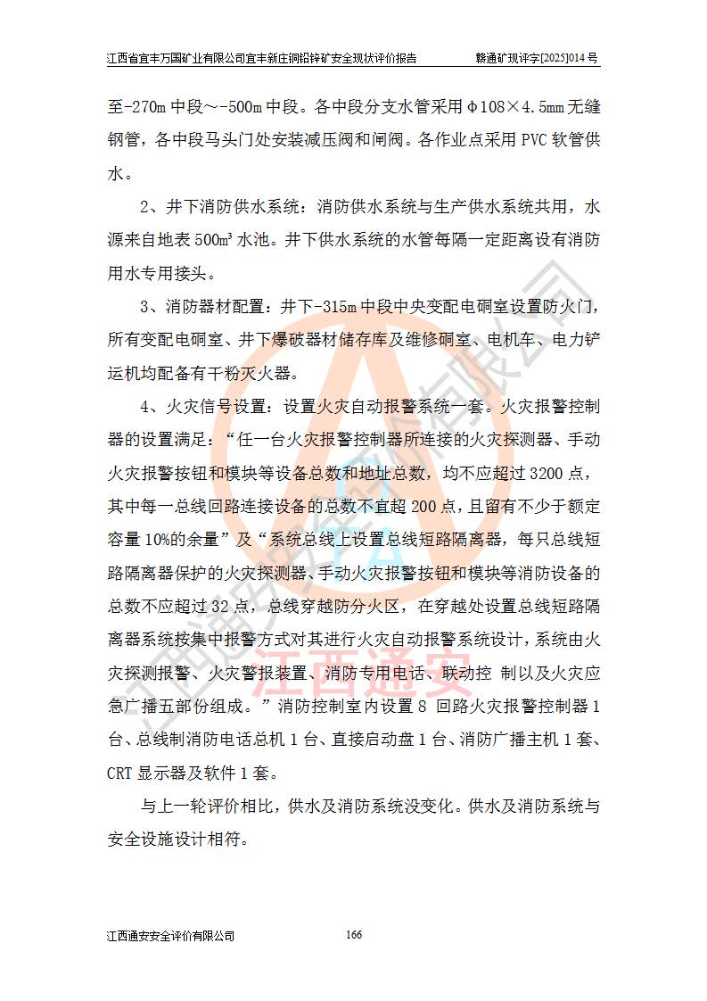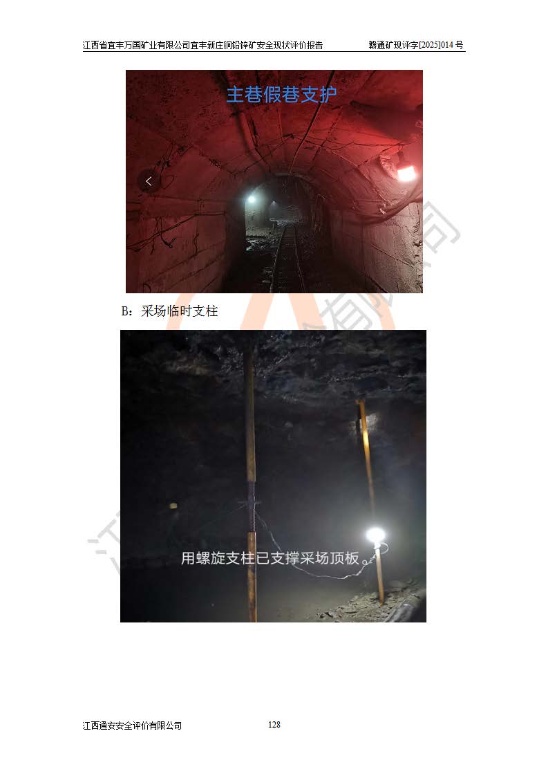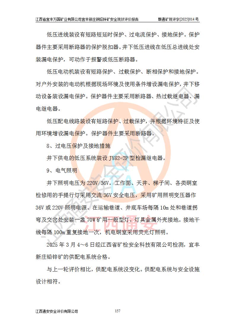 其它 | 江西省宜丰万国矿业有限公司宜丰新庄铜铅锌矿地下开采的主要生产及辅助系统:提升运输、排水、供配电、通风、供风、采掘、安全避险“六大系统”等符合法律法规要求和规程、规范要求;各种危险有害因素及不可接受的风险在运行中认真落实行之**的技术措施或管理措施,严格按规程,按要求加强管理,可以避免和控制各类事故,**安全生产。现阶段矿山设备、设施和场所符合**安全生产有关法律、法规、标准及规范的规定。矿山采用竖井开拓方式,安全生产条件较好;安全管理能满足法规要求,矿山现状与安全设施设计一致,矿山地下开采符合**规定的安全生产条件。 | ||||