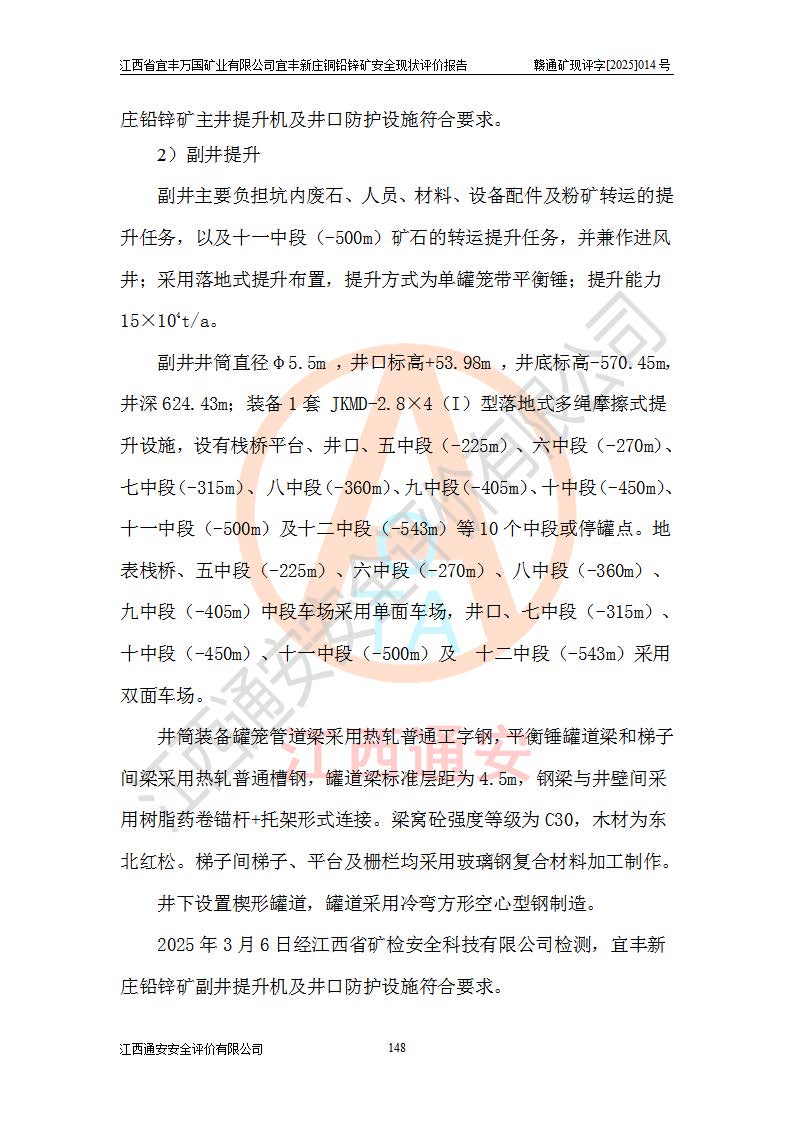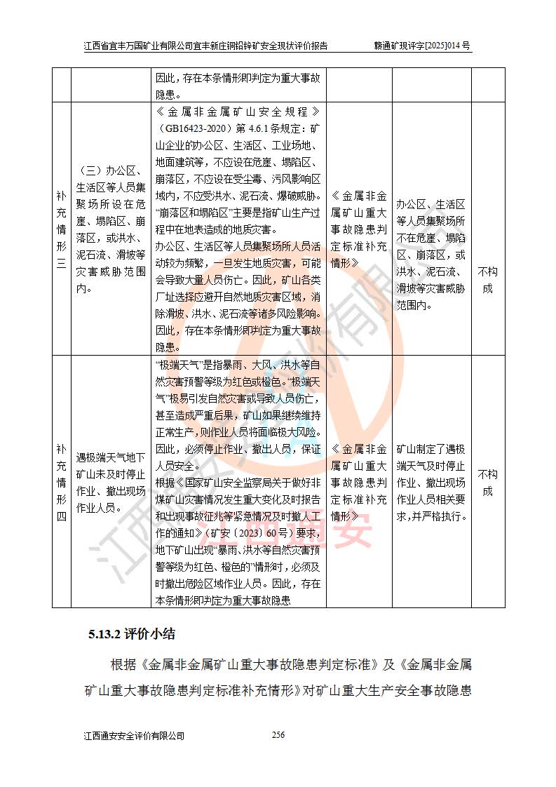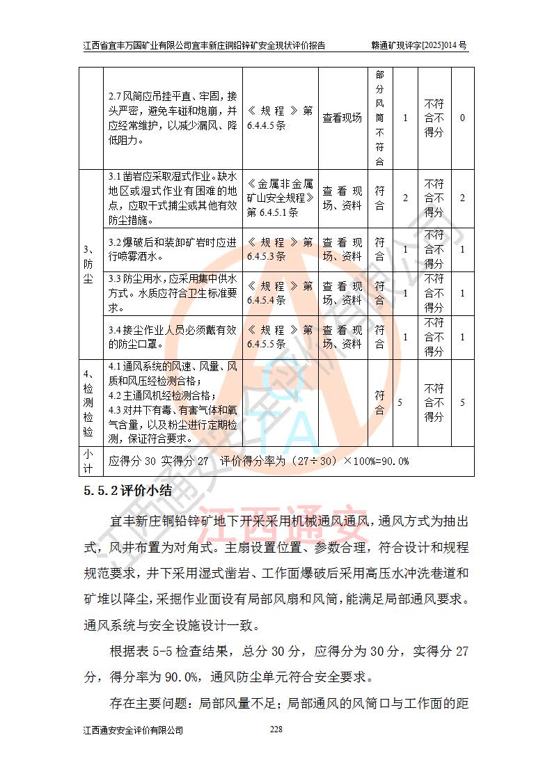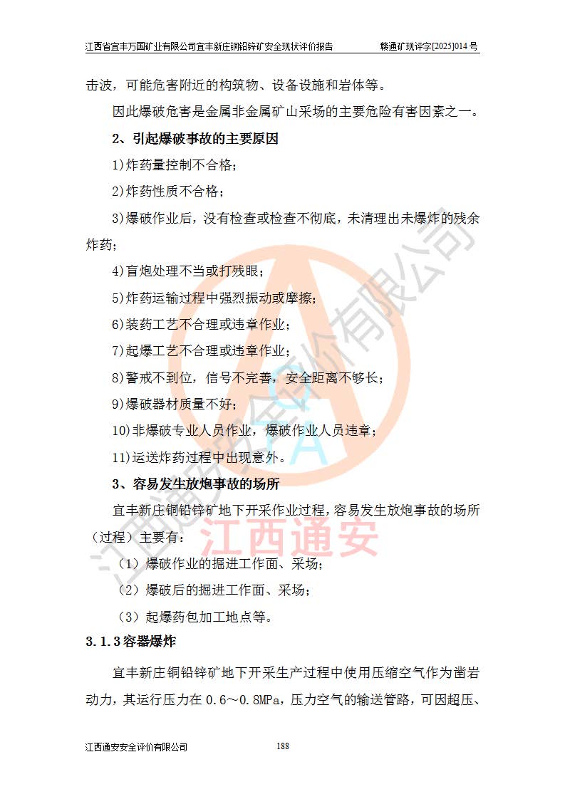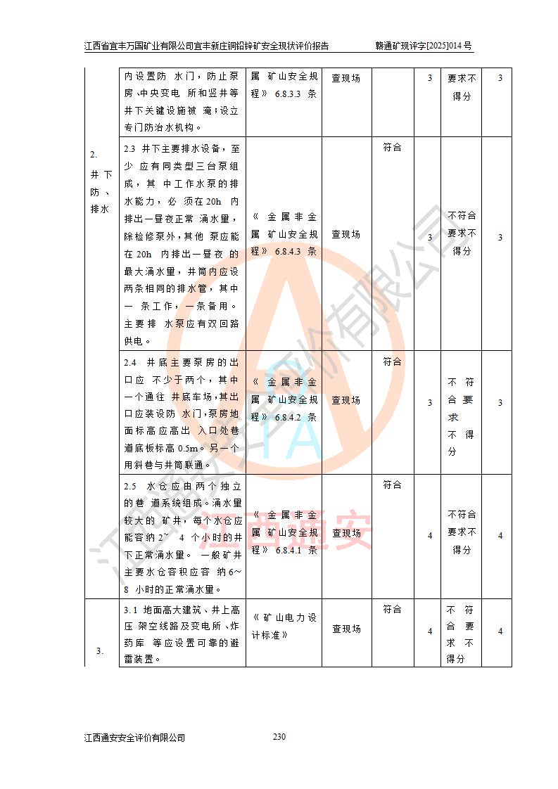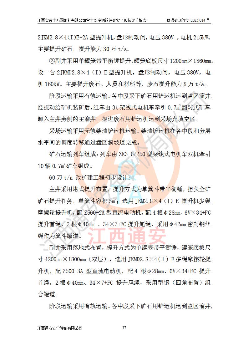 其它 | 江西省宜丰万国矿业有限公司宜丰新庄铜铅锌矿地下开采的主要生产及辅助系统:提升运输、排水、供配电、通风、供风、采掘、安全避险“六大系统”等符合法律法规要求和规程、规范要求;各种危险有害因素及不可接受的风险在运行中认真落实行之**的技术措施或管理措施,严格按规程,按要求加强管理,可以避免和控制各类事故,**安全生产。现阶段矿山设备、设施和场所符合**安全生产有关法律、法规、标准及规范的规定。矿山采用竖井开拓方式,安全生产条件较好;安全管理能满足法规要求,矿山现状与安全设施设计一致,矿山地下开采符合**规定的安全生产条件。 | ||||