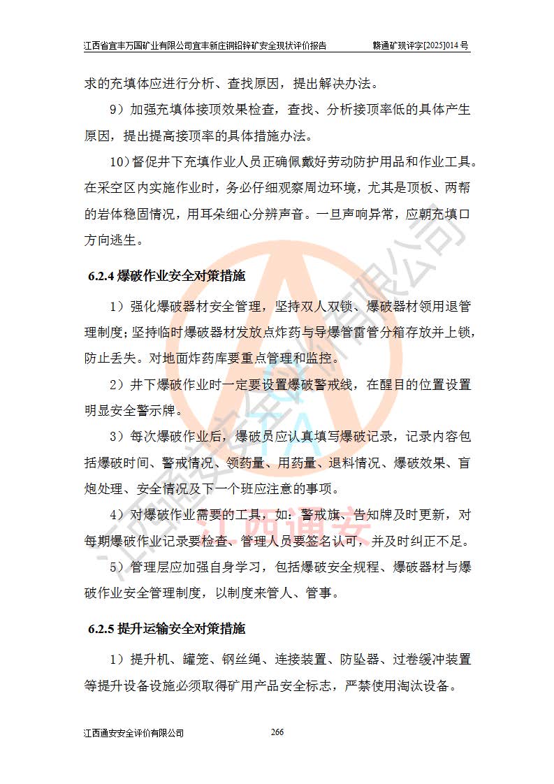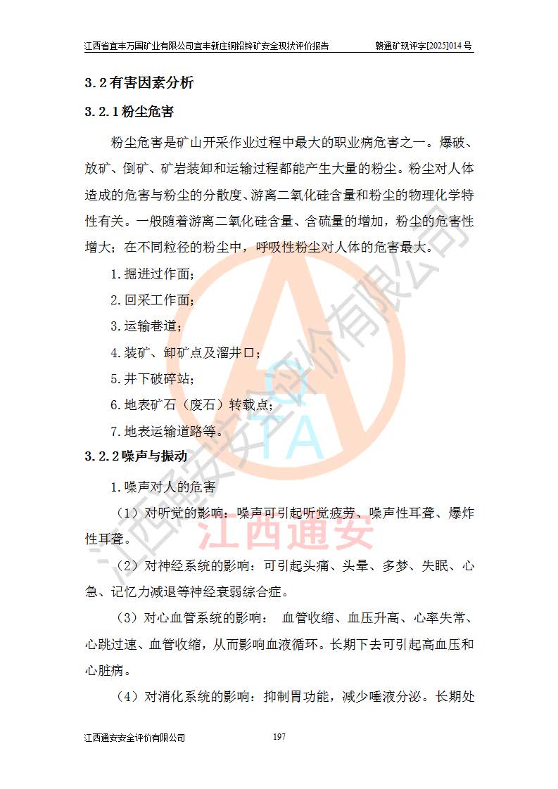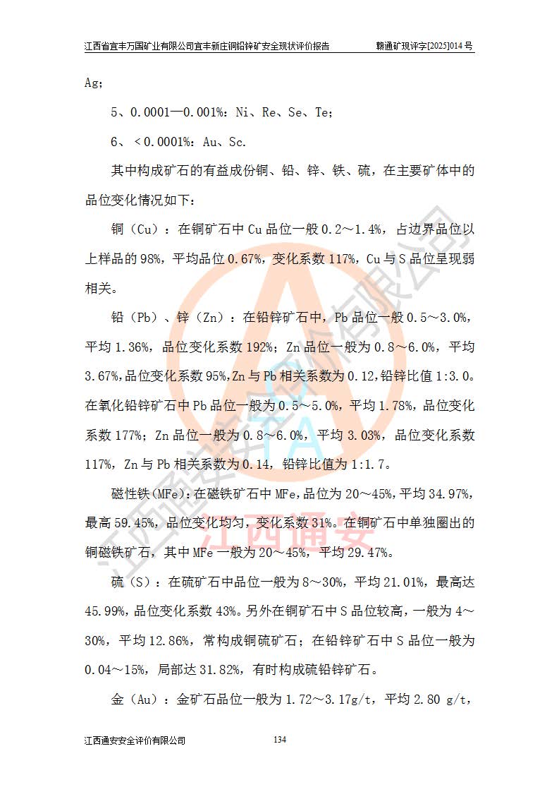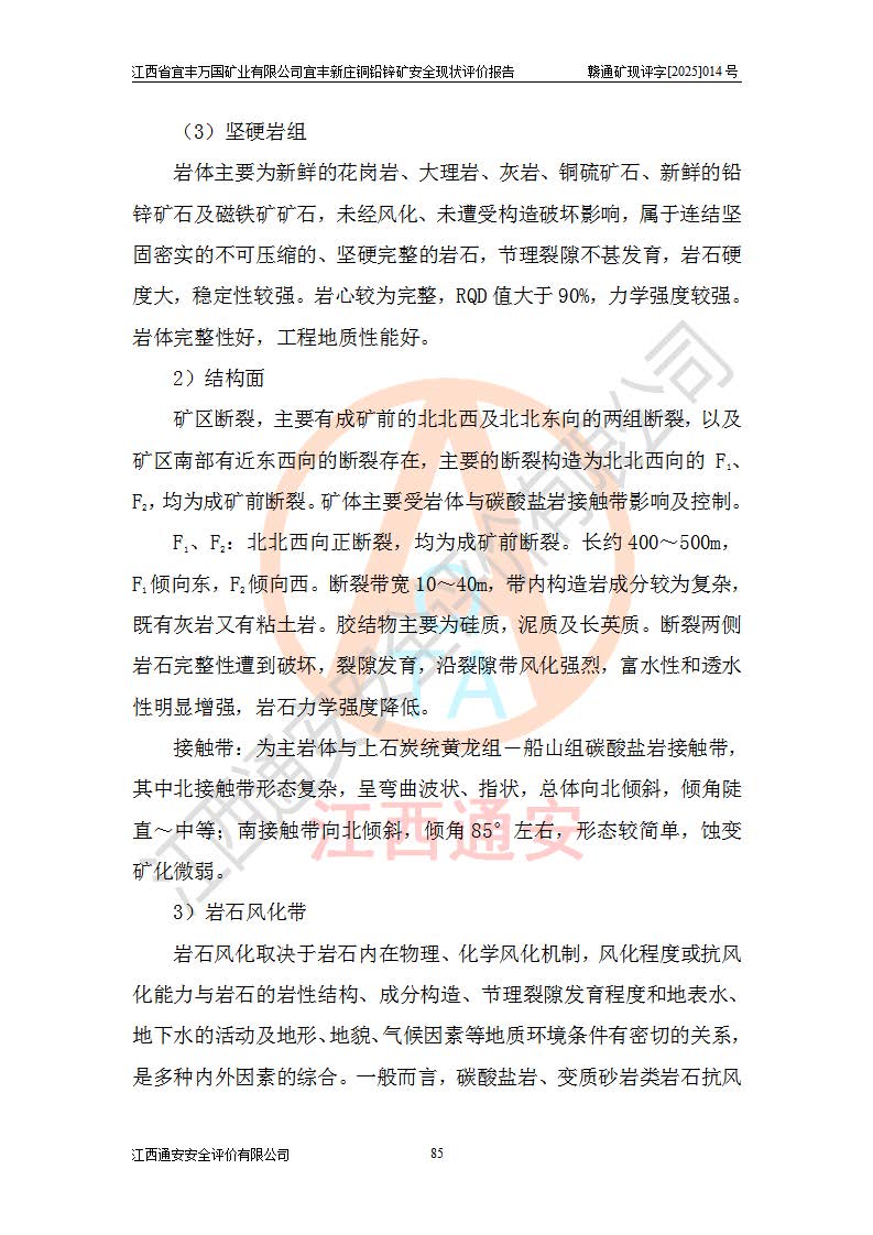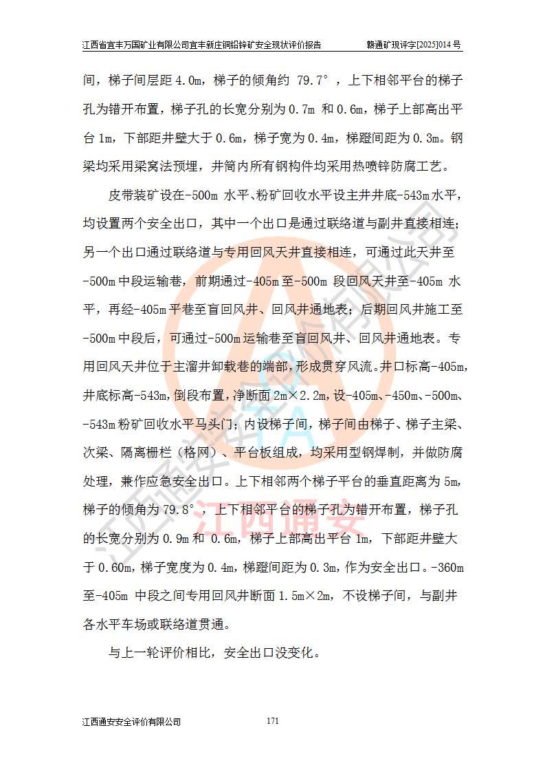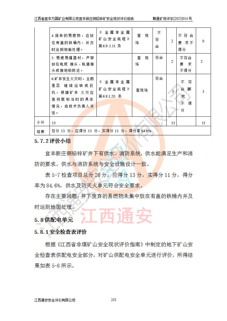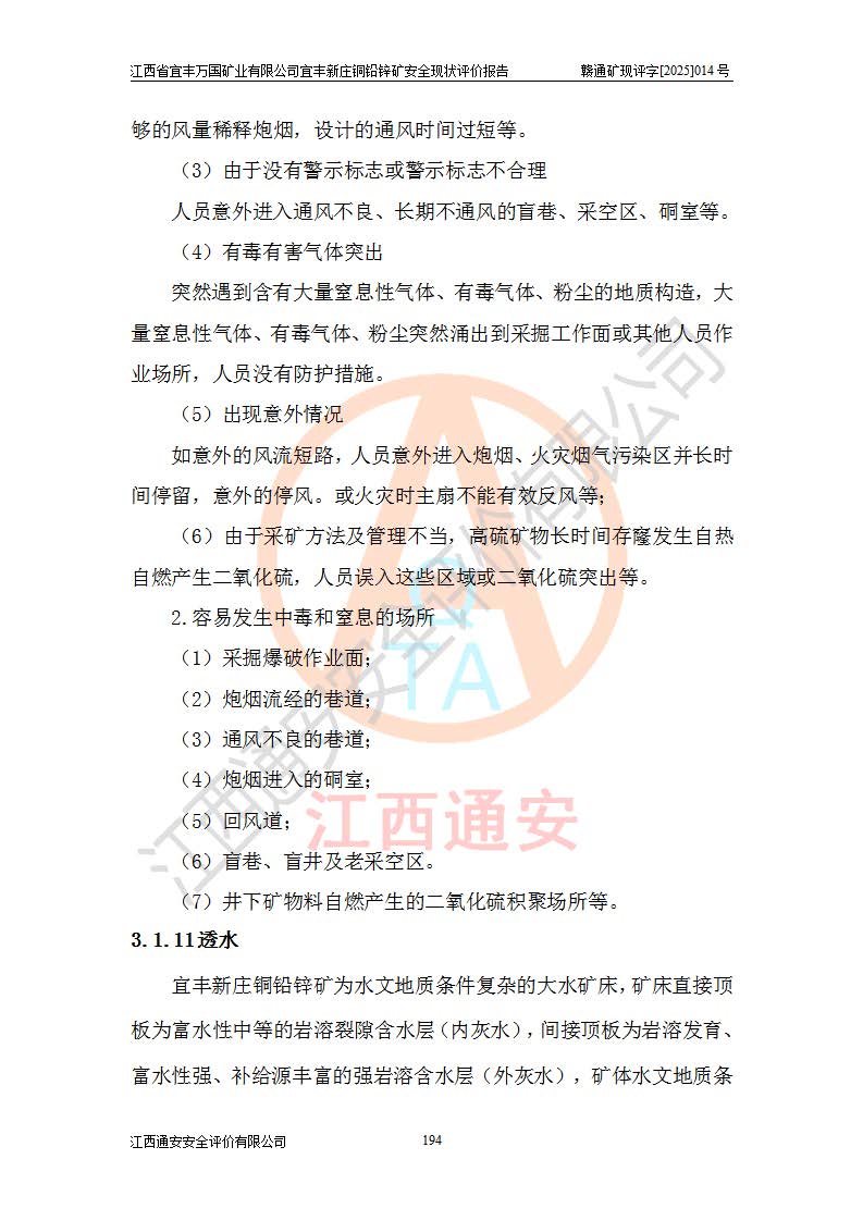 其它 | 江西省宜丰万国矿业有限公司宜丰新庄铜铅锌矿地下开采的主要生产及辅助系统:提升运输、排水、供配电、通风、供风、采掘、安全避险“六大系统”等符合法律法规要求和规程、规范要求;各种危险有害因素及不可接受的风险在运行中认真落实行之**的技术措施或管理措施,严格按规程,按要求加强管理,可以避免和控制各类事故,**安全生产。现阶段矿山设备、设施和场所符合**安全生产有关法律、法规、标准及规范的规定。矿山采用竖井开拓方式,安全生产条件较好;安全管理能满足法规要求,矿山现状与安全设施设计一致,矿山地下开采符合**规定的安全生产条件。 | ||||