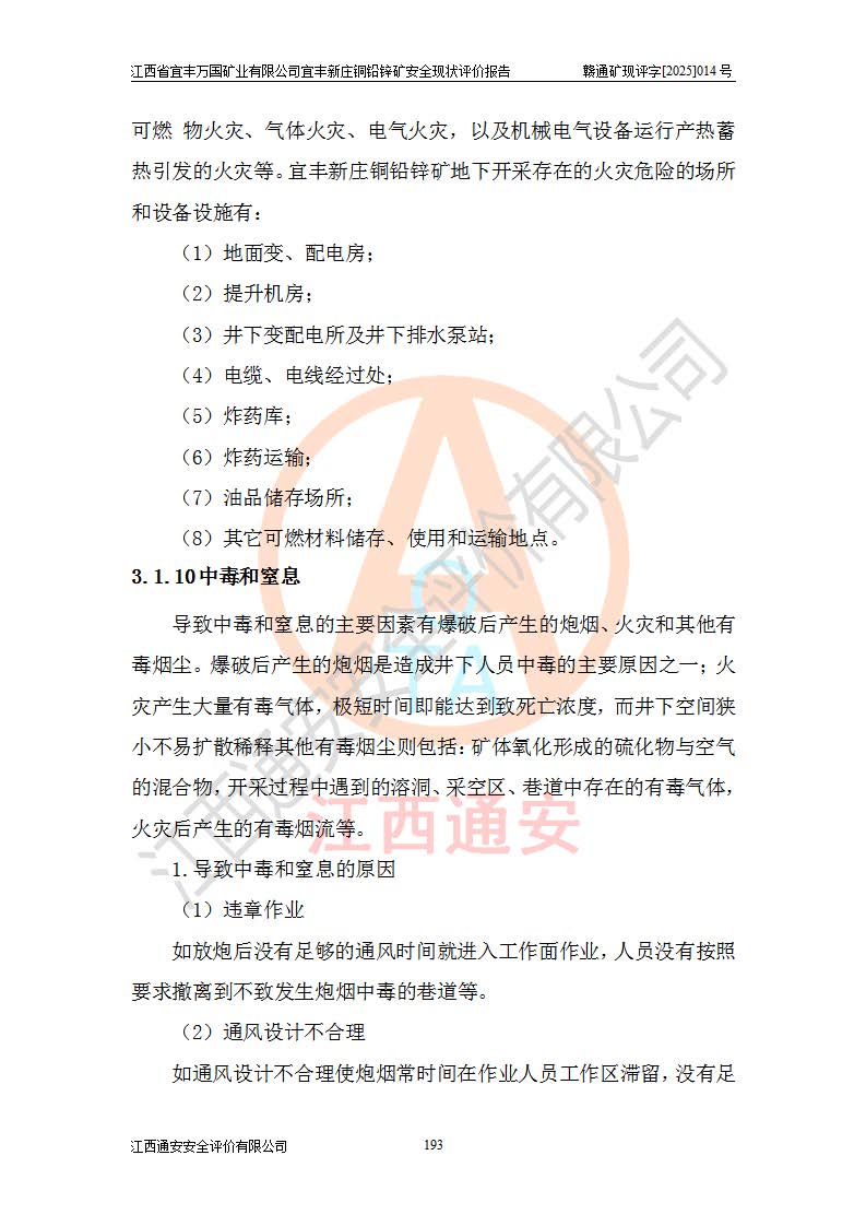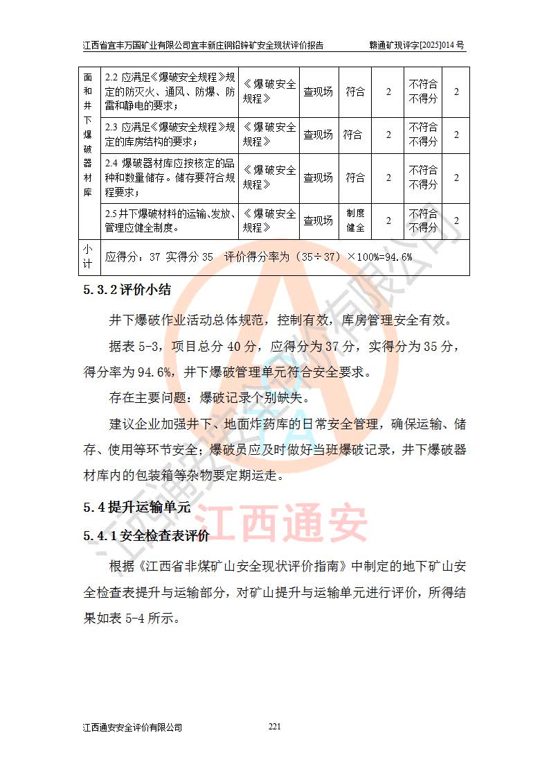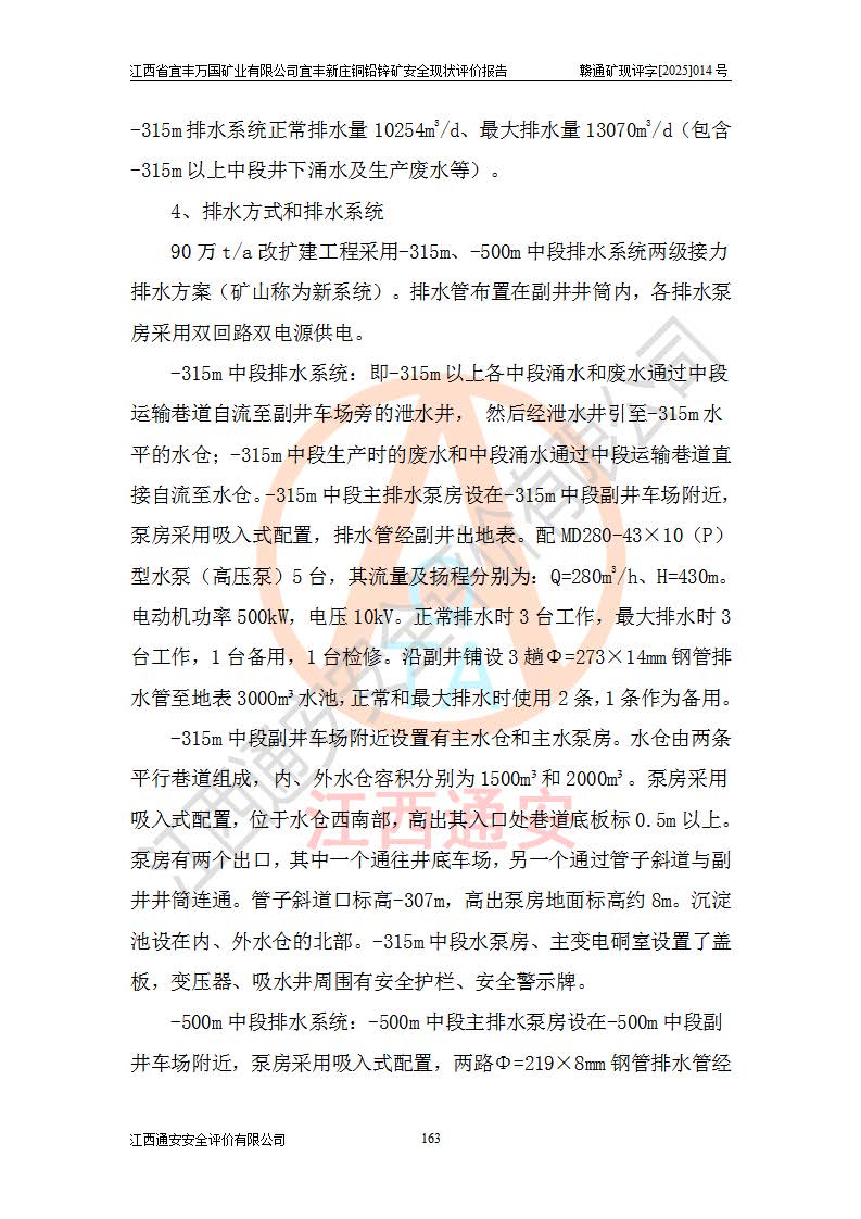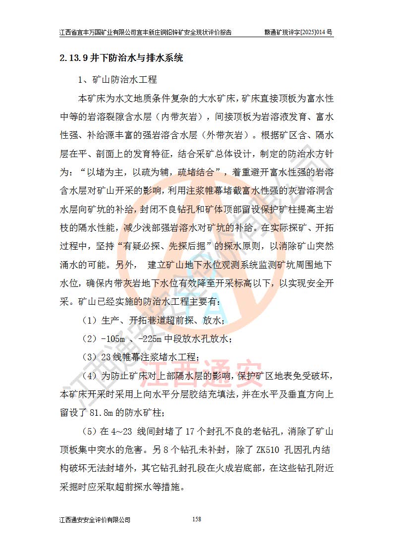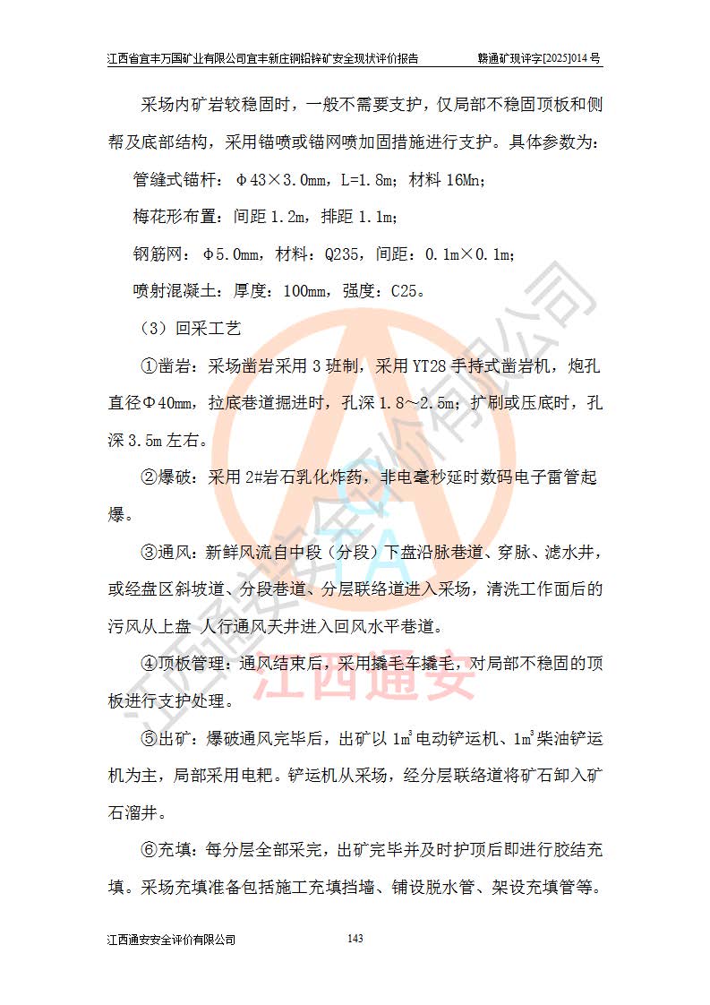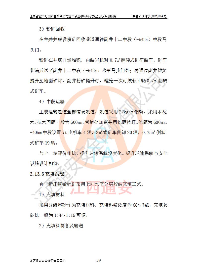 其它 | 江西省宜丰万国矿业有限公司宜丰新庄铜铅锌矿地下开采的主要生产及辅助系统:提升运输、排水、供配电、通风、供风、采掘、安全避险“六大系统”等符合法律法规要求和规程、规范要求;各种危险有害因素及不可接受的风险在运行中认真落实行之**的技术措施或管理措施,严格按规程,按要求加强管理,可以避免和控制各类事故,**安全生产。现阶段矿山设备、设施和场所符合**安全生产有关法律、法规、标准及规范的规定。矿山采用竖井开拓方式,安全生产条件较好;安全管理能满足法规要求,矿山现状与安全设施设计一致,矿山地下开采符合**规定的安全生产条件。 | ||||
