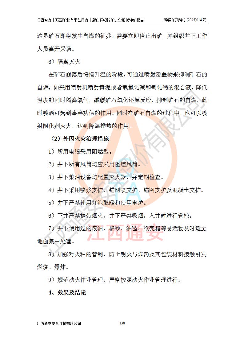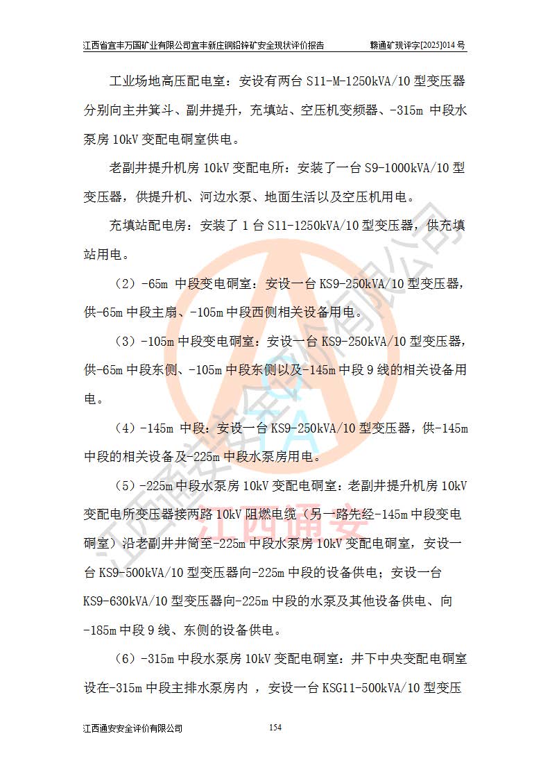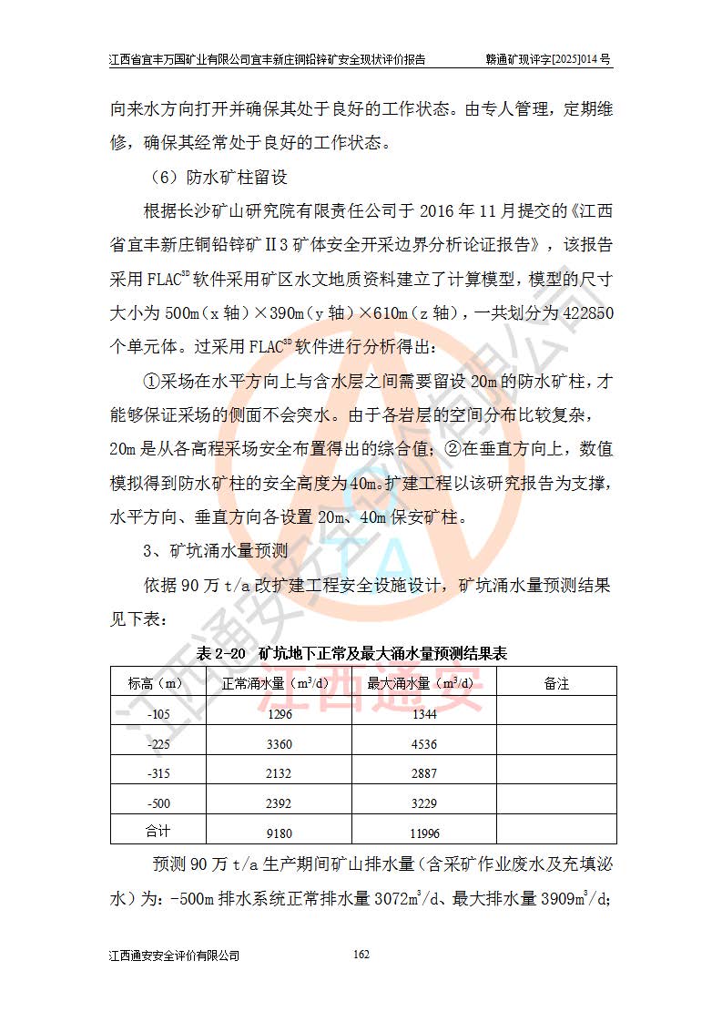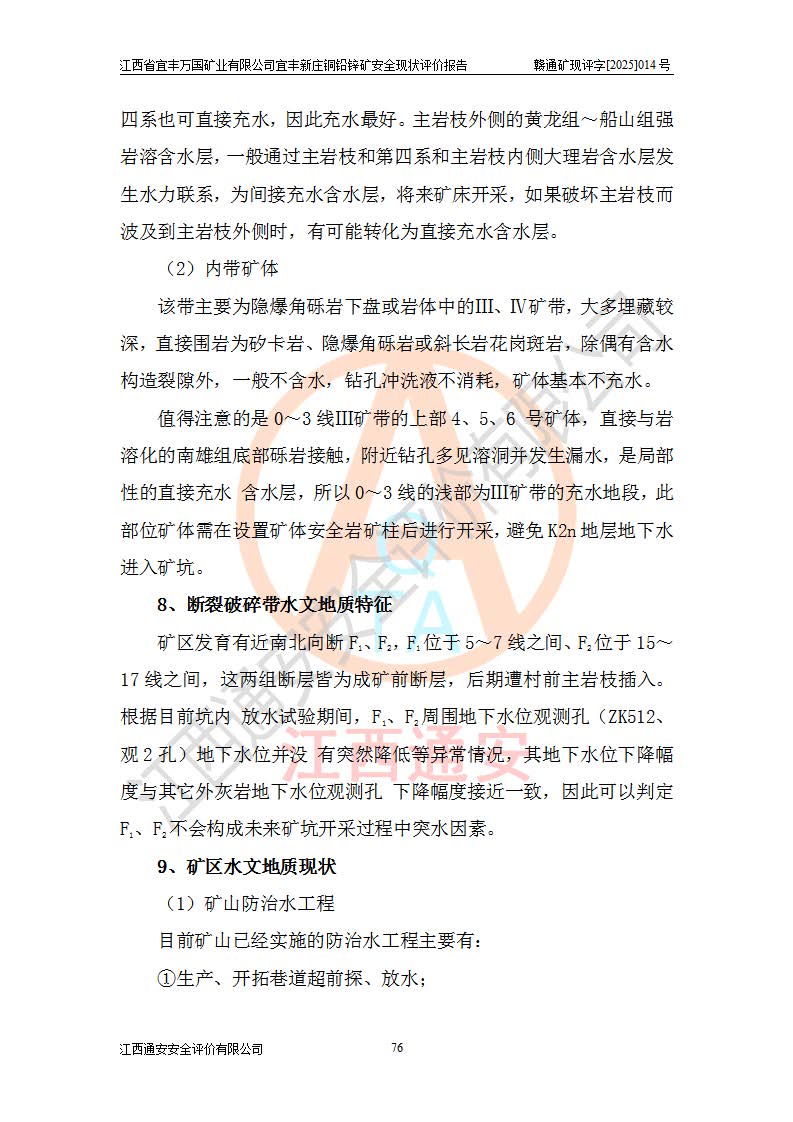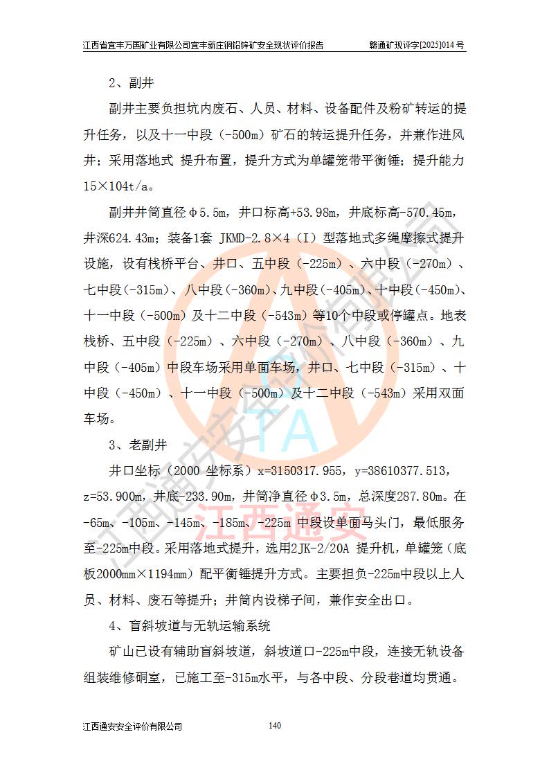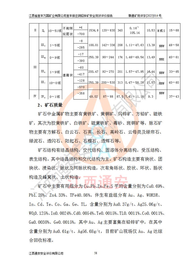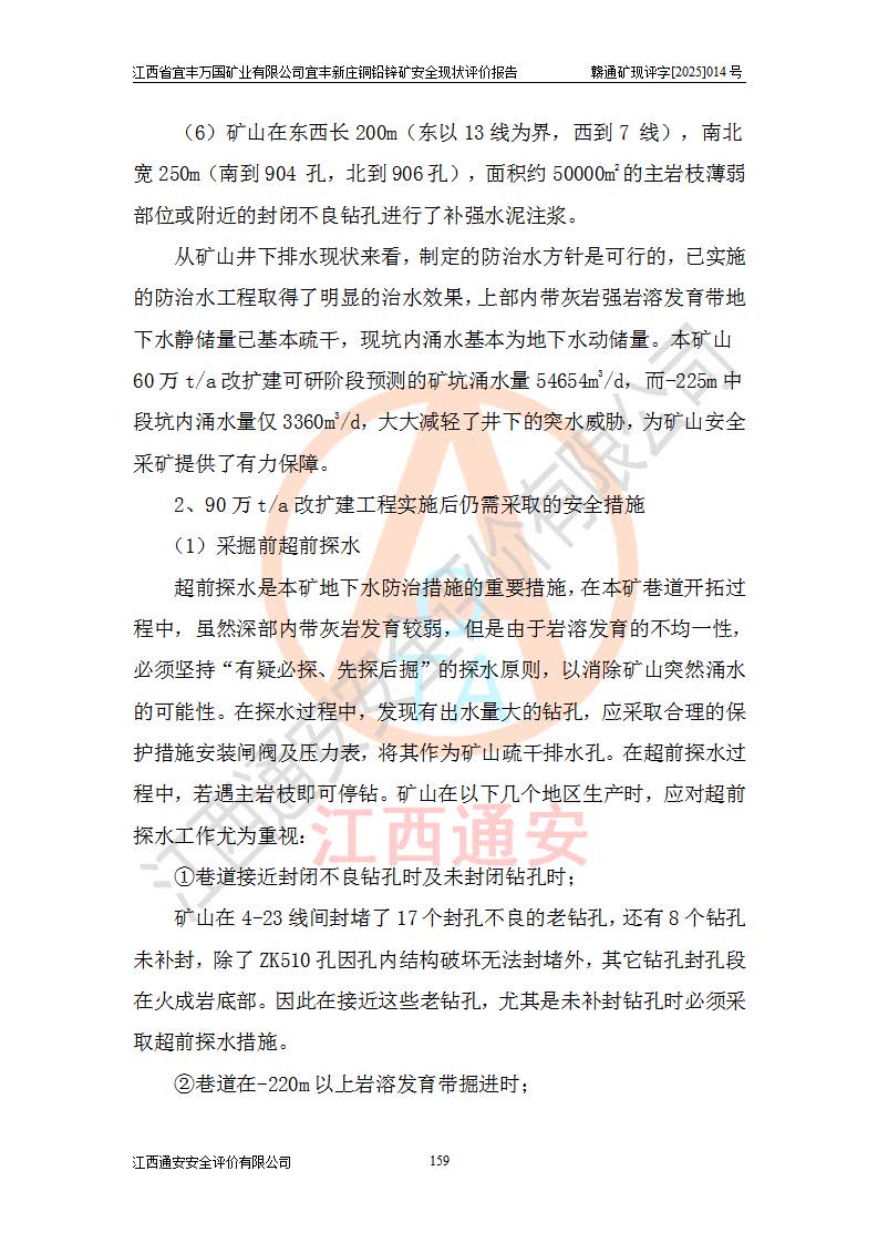 其它 | 江西省宜丰万国矿业有限公司宜丰新庄铜铅锌矿地下开采的主要生产及辅助系统:提升运输、排水、供配电、通风、供风、采掘、安全避险“六大系统”等符合法律法规要求和规程、规范要求;各种危险有害因素及不可接受的风险在运行中认真落实行之**的技术措施或管理措施,严格按规程,按要求加强管理,可以避免和控制各类事故,**安全生产。现阶段矿山设备、设施和场所符合**安全生产有关法律、法规、标准及规范的规定。矿山采用竖井开拓方式,安全生产条件较好;安全管理能满足法规要求,矿山现状与安全设施设计一致,矿山地下开采符合**规定的安全生产条件。 | ||||