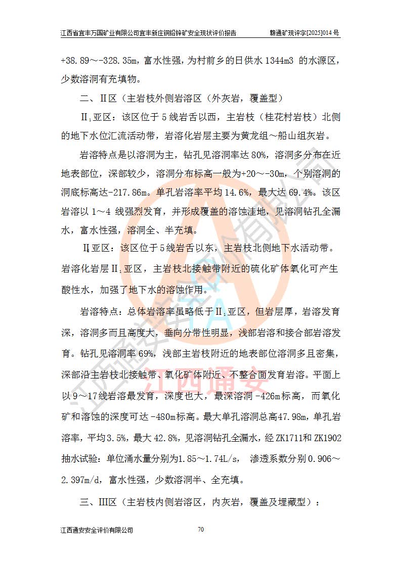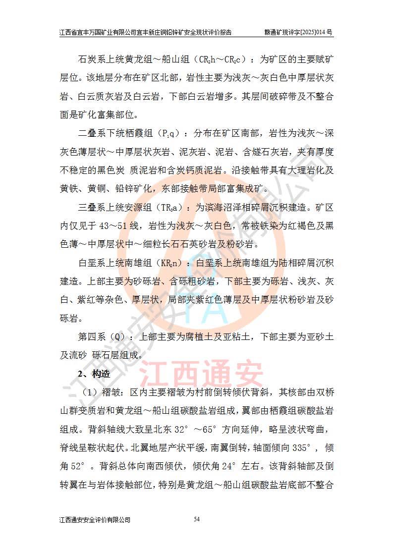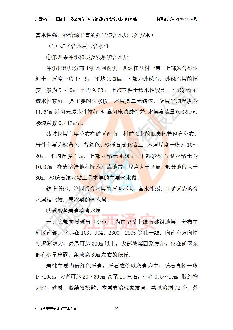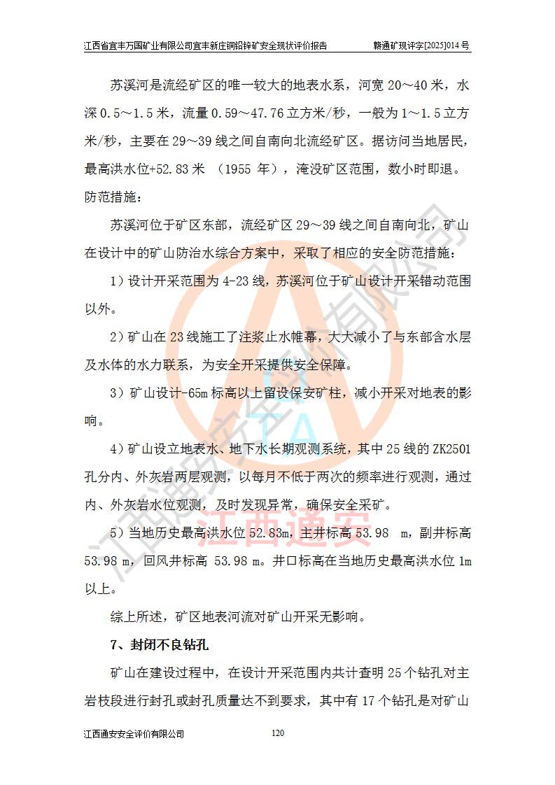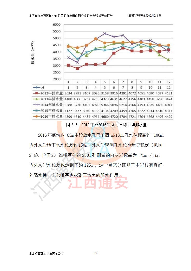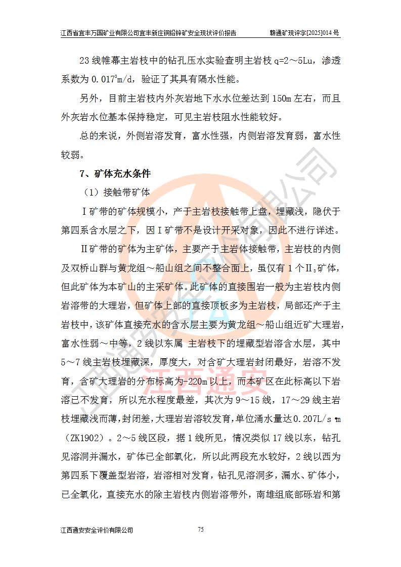 其它 | 江西省宜丰万国矿业有限公司宜丰新庄铜铅锌矿地下开采的主要生产及辅助系统:提升运输、排水、供配电、通风、供风、采掘、安全避险“六大系统”等符合法律法规要求和规程、规范要求;各种危险有害因素及不可接受的风险在运行中认真落实行之**的技术措施或管理措施,严格按规程,按要求加强管理,可以避免和控制各类事故,**安全生产。现阶段矿山设备、设施和场所符合**安全生产有关法律、法规、标准及规范的规定。矿山采用竖井开拓方式,安全生产条件较好;安全管理能满足法规要求,矿山现状与安全设施设计一致,矿山地下开采符合**规定的安全生产条件。 | ||||