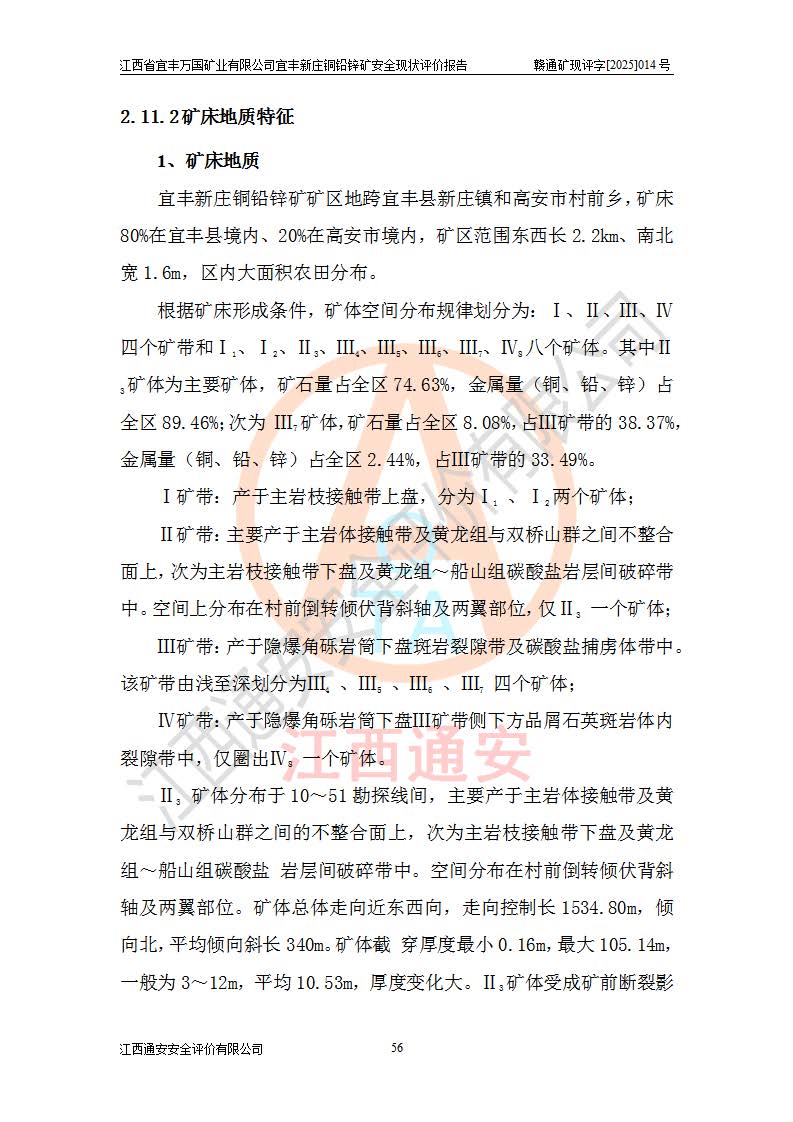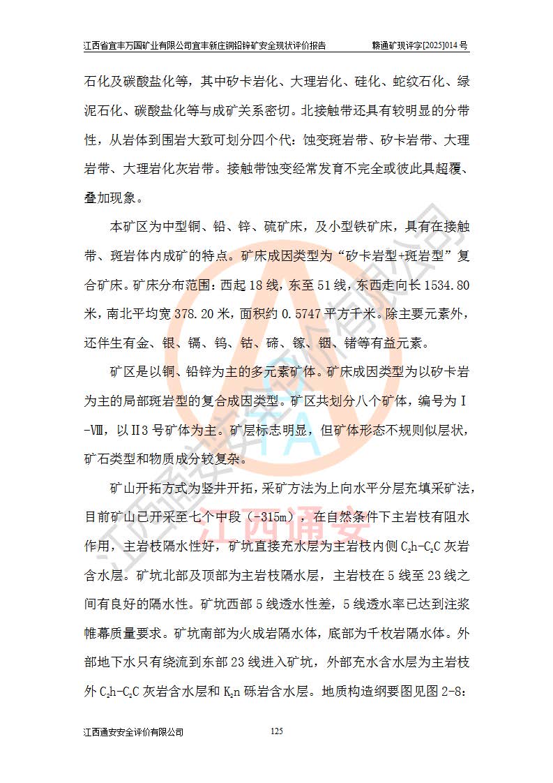 项目简介 | 江西省宜丰万国矿业有限公司宜丰新庄铜铅锌矿矿区位于宜丰县城北东79°方向,直距34km处,属高安市村前镇和宜丰县新庄镇管辖。矿区地理坐标(2000坐标系):东经115°07′01″~115°08′17″,北纬 28°27′30″~28°28′30″,面积3.7693km2。矿区内有省道 S318 公路(宜丰至南昌)通过,由矿区至宜丰县城公路里程34km,至南昌市公路里程99km,至320国道公路里程13km,至昌栗高速(高安西)公路里程21km,至张(家山)—建(山)铁路支线协塘站公路里程59km,矿区交通方便。 宜丰新庄铜铅锌矿为一家证照齐全的地下开采矿山,开采铜、铅、锌矿,矿床成因类型为矽卡岩型+斑岩型复合矿床。矿山采用立井+斜井开拓,有主井(箕斗提升)、副井(罐笼提升)、老副井(罐笼提升)及回风井共4个竖井及1个回风斜井。矿山-315m以上各中段均已完成开拓工程,回采中段有-105m、-145m、-185m、-225m、-270m、-315m、-360m、-405m、-500m中段,其中-105m、-145m、-185m、-225m为残采中段。 江西省宜丰万国矿业有限公司设董事长兼总经理1人、副总经理 1人,矿长、总工程师、生产、安全、机电、行政副矿长各一人,实行公司—采矿场(选矿厂)—班组三级管理,下设安环部、生产部、地测部、调度室、机能部、供销部、质检部、企管部、财务部、供销部、监察部等部门;四个二级生产单位,即充填队、出矿车间(提升运输)、选矿厂、采掘承包施工队。 江西省宜丰万国矿业有限公司的信息化建设情况良好,井下的通风、排水、提升、充填、供电等系统均已实现自动化,**地避免了人员暴露作业的风险,提高了生产效率和安全性。同时配备了多台智能化设备,如遥控铲运机、反向天井钻等,这些设备的应用提高了矿山的生产效率和智能化水平。为了让已有的以及即将建立的信息化系统价值*大化地发挥出来,打造出属于矿山企业自身的核心竞争力,进而实现可持续发展,2025年2月企业委托长沙迪迈科技股份有限公司编制提交了《江西省宜丰万国矿业有限公司信息化系统智慧监管平台项目建设方案》。该信息化系统智慧监管平台项目现已建成,集成万国矿业充填系统、排水系统、主井提升系统、通风系统、供电、常规视频系统、AI 视频、尾矿库等系统数据数据,消除万国矿业各个系统间形成的信息孤岛,实现各系统数据的集中存储、管理与共享。从系统层面建立各智能系统与运营管理的联系,规范和统一生产技术人员工作流程,提高技术、生产管理工作效率。利用互联网实现应用系统碎片化数据的及时上传,减少数据的二次抄录。自动生成相关的生产统计报表,减少统计报表工作量。在三维环境下实现对万国矿业的虚拟仿真,实现对整个矿山资源、环境、自动化系统状况、安全监测、人员和设备状态进行***管理,实现生产过程数据的实时展示与预警。 根据《安全生产法》、《安全生产许可证条例》等有关法律、法规的规定及**矿山安全监察局《关于进一步加强非煤矿山安全生产行政许可工作的通知》以及《关于做好非煤矿矿山企业安全生产许可证延期换证工作的通知》的要求,2025年7月,江西省宜丰万国矿业有限公司委托江西通安安全评价有限公)对江西省宜丰万国矿业有限公司宜丰新庄铜铅锌矿进行安全现状评价。 | ||||
