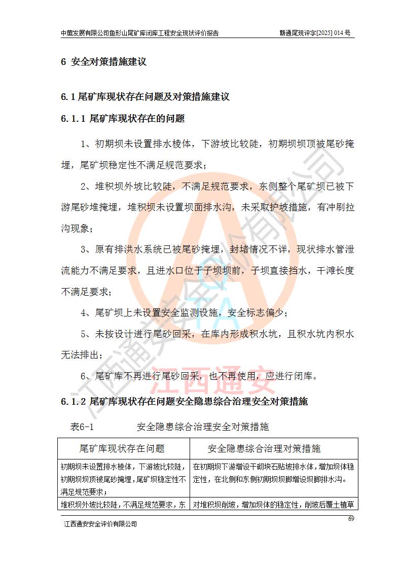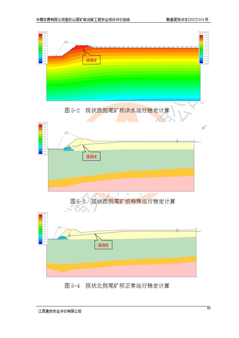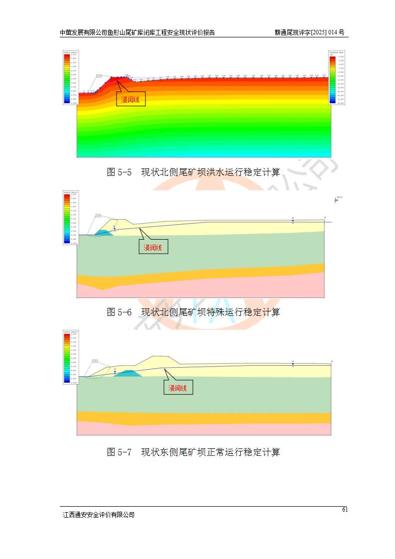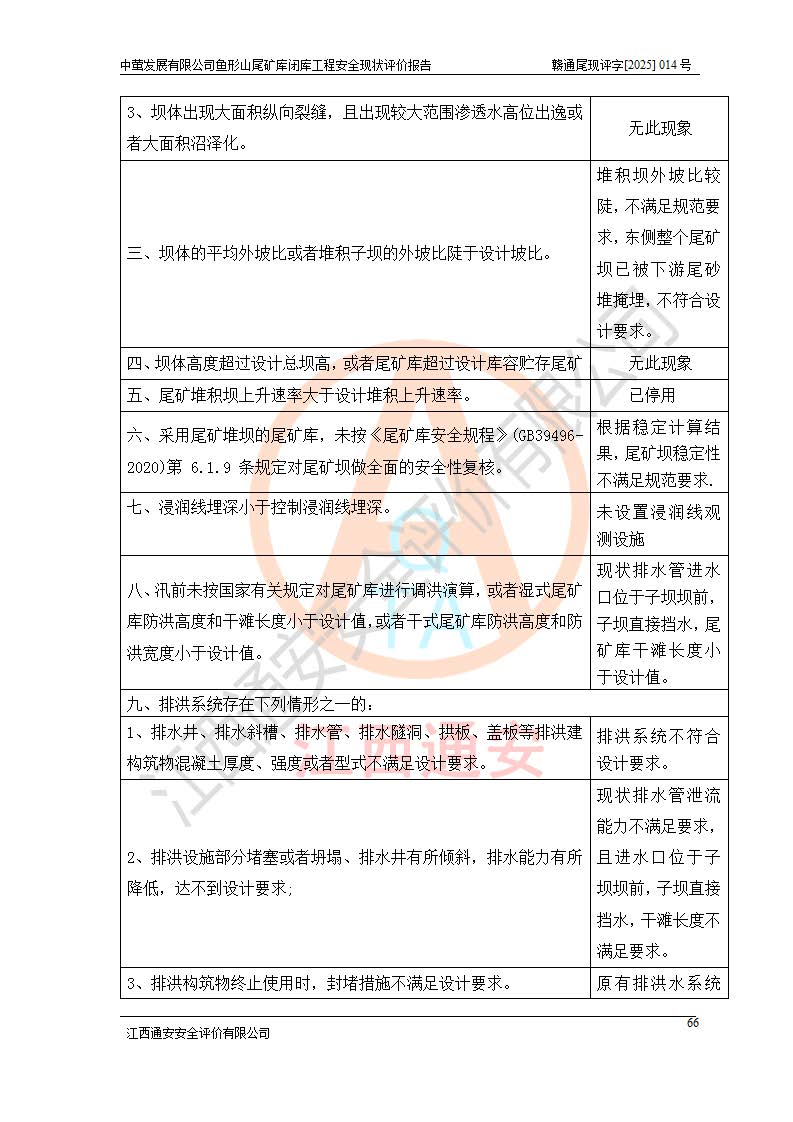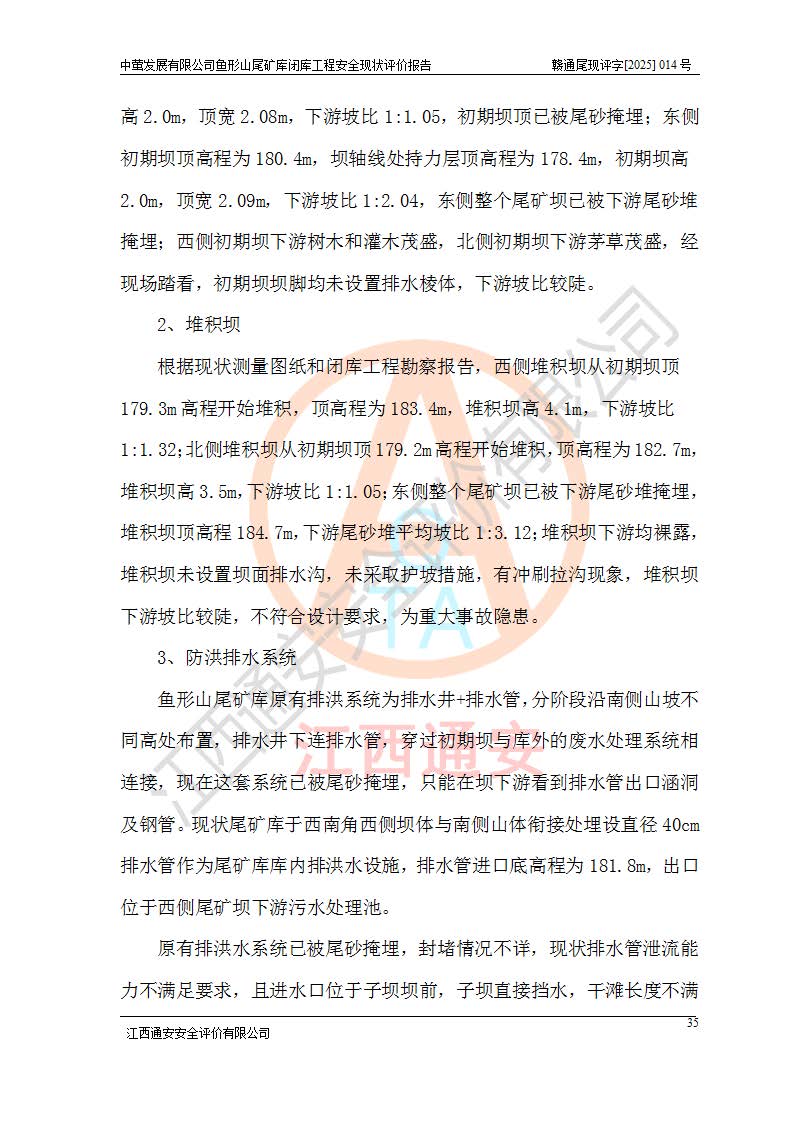 存在的问题: 1、初期坝未设置排水棱体,下游坡比较陡,初期坝坝顶被尾砂掩埋,尾矿坝稳定性不满足规范要求; 2、堆积坝外坡比较陡,不满足规范要求,东侧整个尾矿坝已被下游尾砂堆掩埋,堆积坝未设置坝面排水沟,未采取护坡措施,有冲刷拉沟现象; 3、原有排洪水系统已被尾砂掩埋,封堵情况不详,现状排水管泄流能力不满足要求,且进水口位于子坝坝前,子坝直接挡水,干滩长度不满足要求; 4、尾矿坝上未设置安全监测设施,安全标志偏少; 5、未按设计进行尾砂回采,在库内形成积水坑,且积水坑内积水无法排出; 6、尾矿库不再进行尾砂回采,也不再使用,应进行闭库。 整改措施: 1、在初期坝下游增设干砌块石贴坡排水体,增加坝体稳定性,在北侧和东侧初期坝坝脚增设坝脚排水沟。 2、对堆积坝削坡,增加坝体的稳定性,削坡后覆土植草皮护坡,修建坝面坝肩排水沟。 3、新建溢洪道用于闭库后尾矿库排洪排水,拆除现有排水管;对原排洪系统进行封堵。 4、闭库时在尾矿坝上增设安全监测设施,增设安全标志。 5、对库内积水坑进行平整。 6、应进行闭库,整治尾矿库库内干滩面,为防止干滩面水土流失,覆土植草,覆土范围为整个库区范围。在库内干滩面设置库面排水沟,截洪沟、新建溢洪道,形成库内排水网,能**的将库内雨水排至库外。 |
