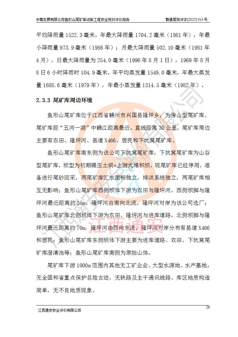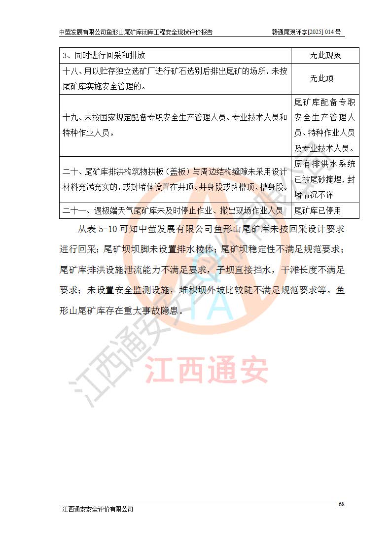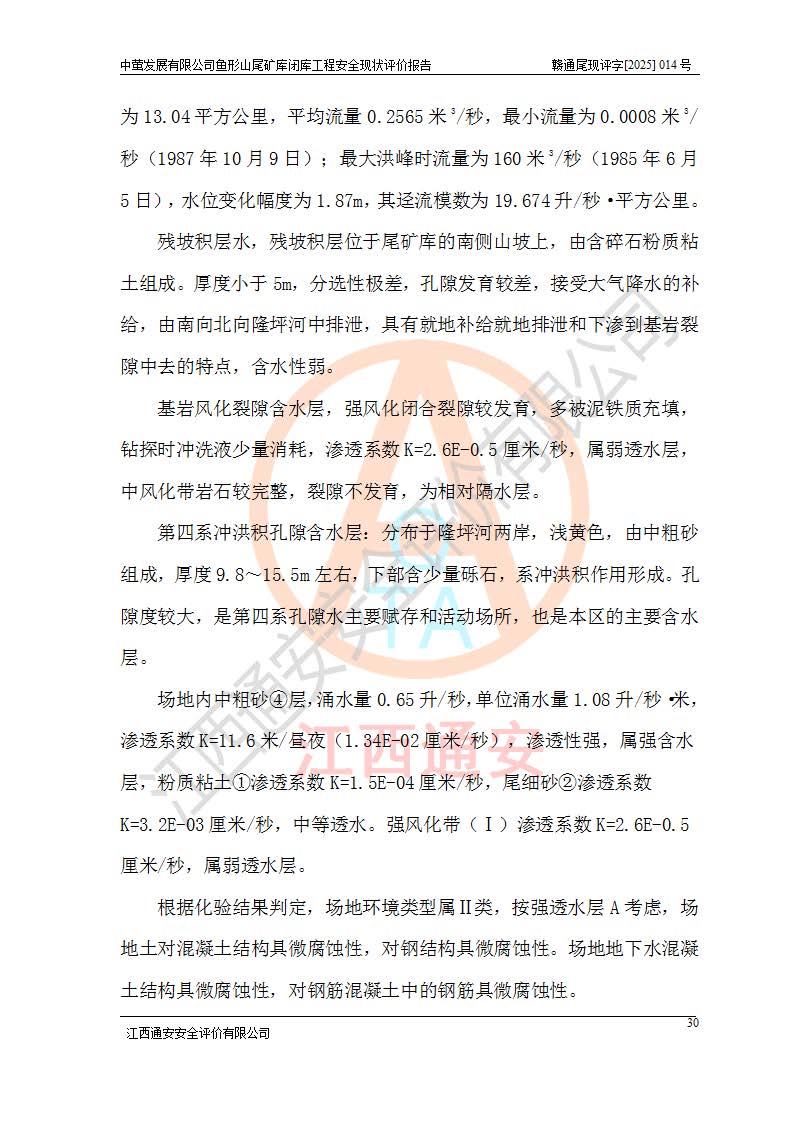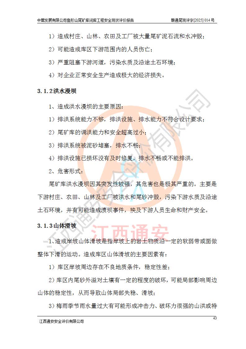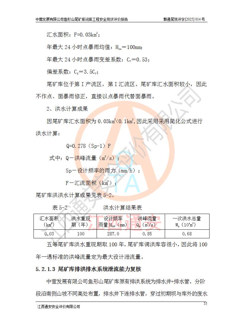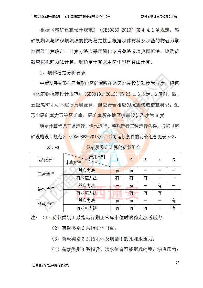 存在的问题: 1、初期坝未设置排水棱体,下游坡比较陡,初期坝坝顶被尾砂掩埋,尾矿坝稳定性不满足规范要求; 2、堆积坝外坡比较陡,不满足规范要求,东侧整个尾矿坝已被下游尾砂堆掩埋,堆积坝未设置坝面排水沟,未采取护坡措施,有冲刷拉沟现象; 3、原有排洪水系统已被尾砂掩埋,封堵情况不详,现状排水管泄流能力不满足要求,且进水口位于子坝坝前,子坝直接挡水,干滩长度不满足要求; 4、尾矿坝上未设置安全监测设施,安全标志偏少; 5、未按设计进行尾砂回采,在库内形成积水坑,且积水坑内积水无法排出; 6、尾矿库不再进行尾砂回采,也不再使用,应进行闭库。 整改措施: 1、在初期坝下游增设干砌块石贴坡排水体,增加坝体稳定性,在北侧和东侧初期坝坝脚增设坝脚排水沟。 2、对堆积坝削坡,增加坝体的稳定性,削坡后覆土植草皮护坡,修建坝面坝肩排水沟。 3、新建溢洪道用于闭库后尾矿库排洪排水,拆除现有排水管;对原排洪系统进行封堵。 4、闭库时在尾矿坝上增设安全监测设施,增设安全标志。 5、对库内积水坑进行平整。 6、应进行闭库,整治尾矿库库内干滩面,为防止干滩面水土流失,覆土植草,覆土范围为整个库区范围。在库内干滩面设置库面排水沟,截洪沟、新建溢洪道,形成库内排水网,能**的将库内雨水排至库外。 |