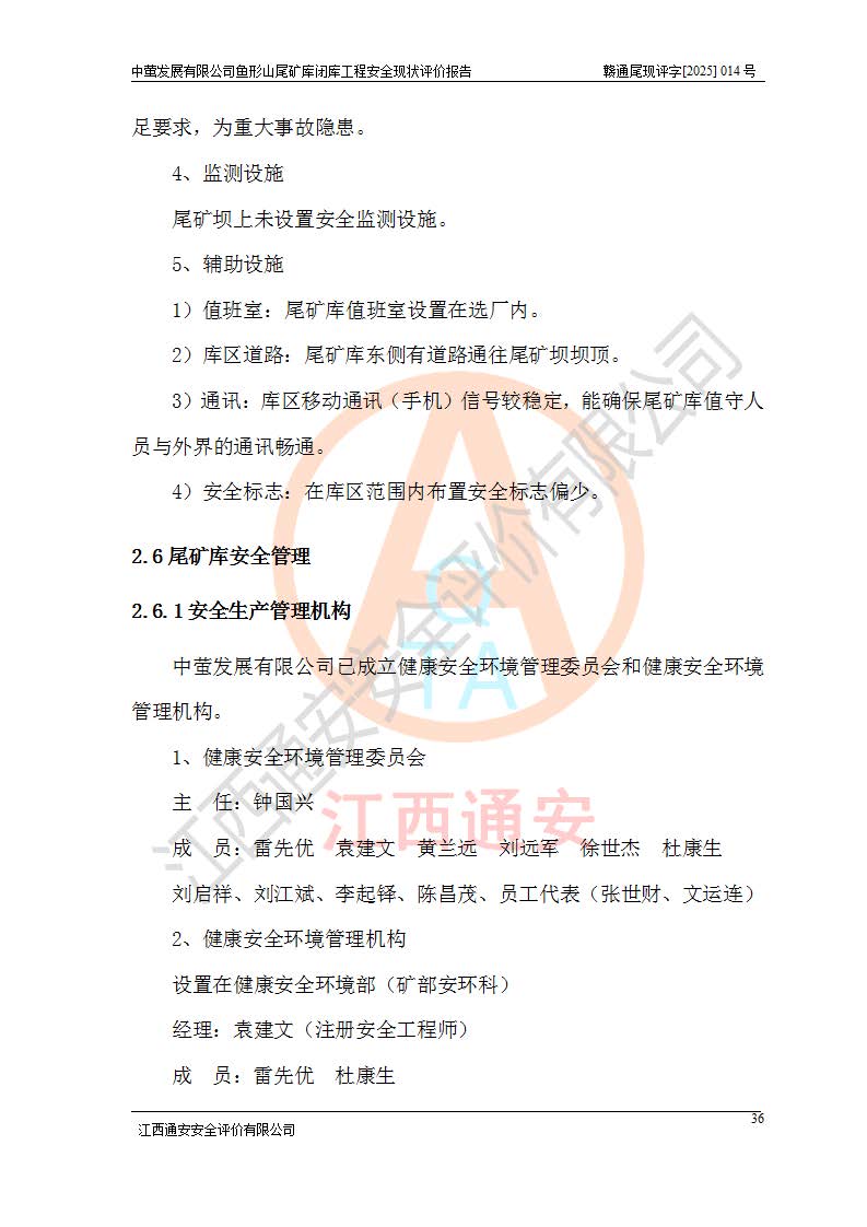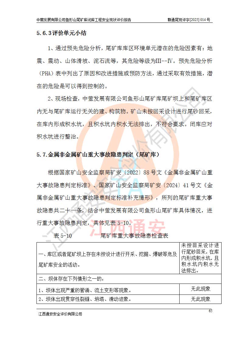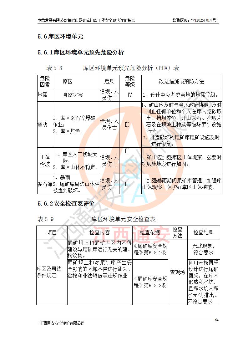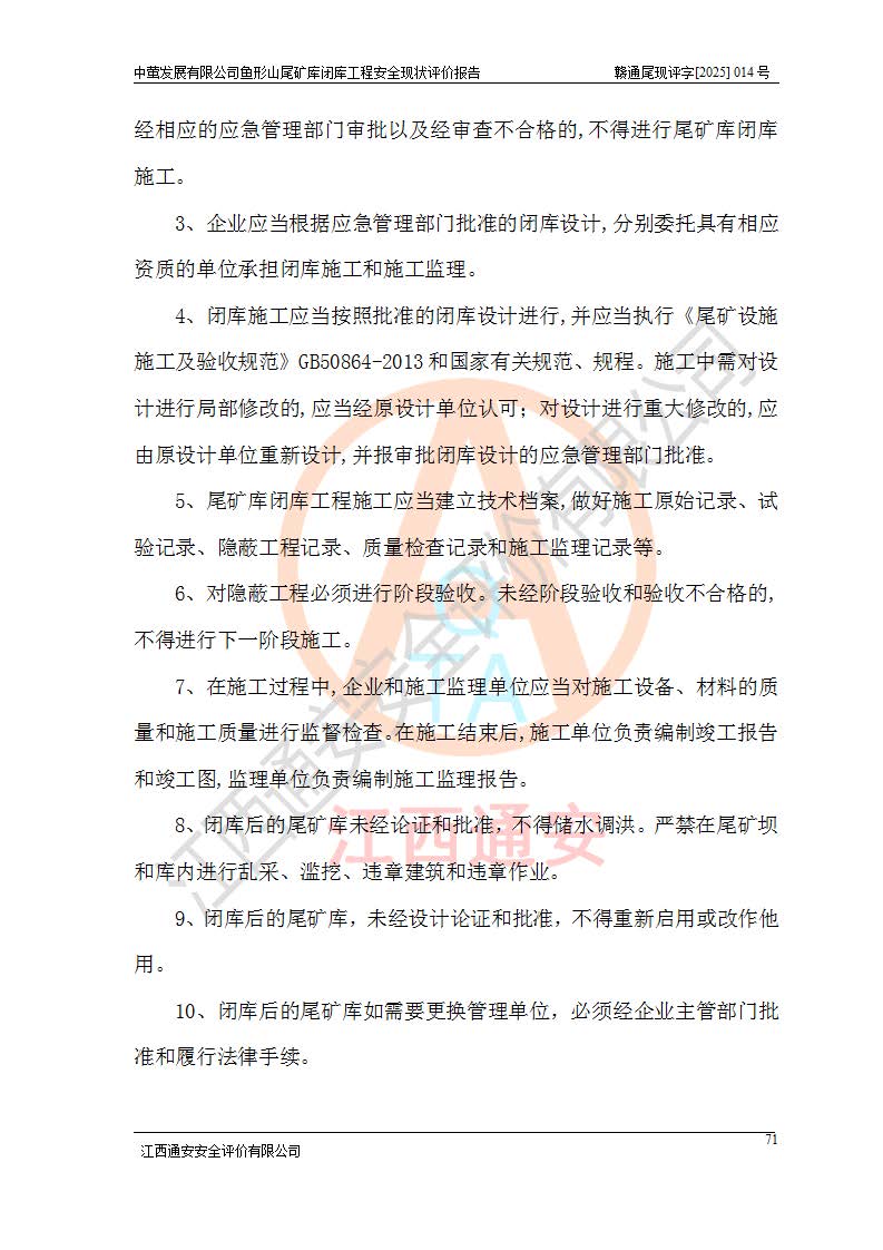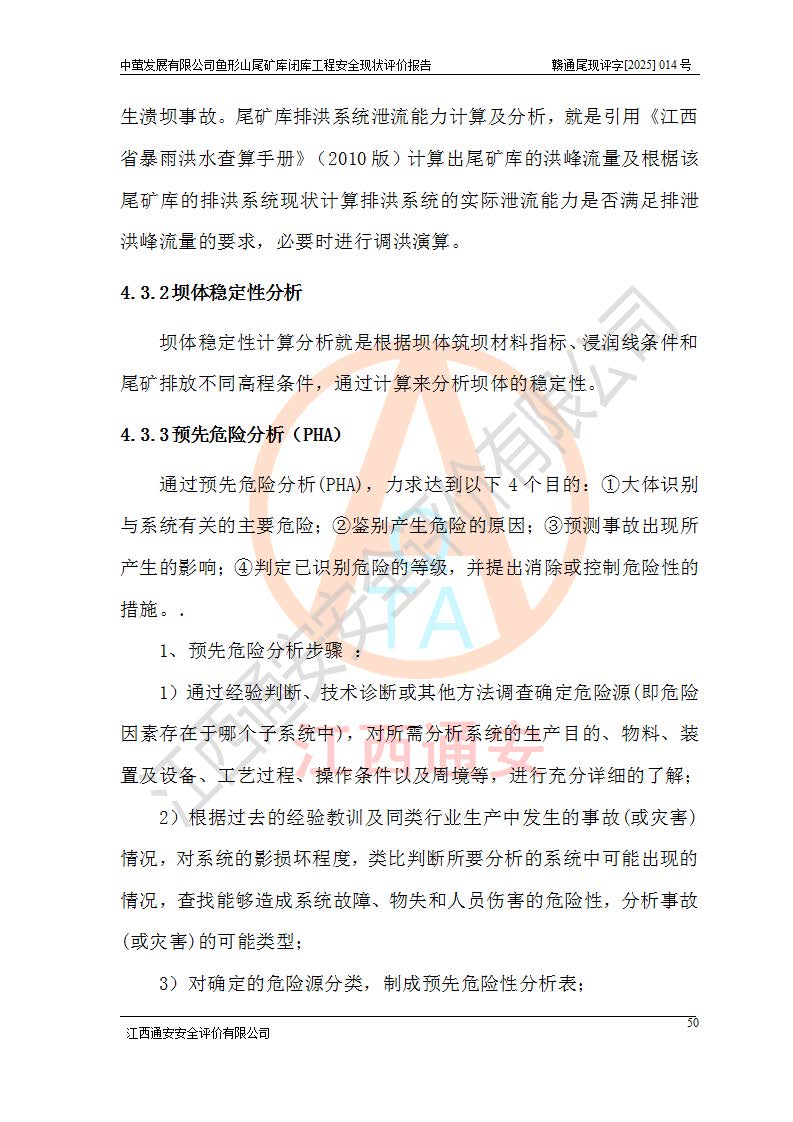 存在的问题: 1、初期坝未设置排水棱体,下游坡比较陡,初期坝坝顶被尾砂掩埋,尾矿坝稳定性不满足规范要求; 2、堆积坝外坡比较陡,不满足规范要求,东侧整个尾矿坝已被下游尾砂堆掩埋,堆积坝未设置坝面排水沟,未采取护坡措施,有冲刷拉沟现象; 3、原有排洪水系统已被尾砂掩埋,封堵情况不详,现状排水管泄流能力不满足要求,且进水口位于子坝坝前,子坝直接挡水,干滩长度不满足要求; 4、尾矿坝上未设置安全监测设施,安全标志偏少; 5、未按设计进行尾砂回采,在库内形成积水坑,且积水坑内积水无法排出; 6、尾矿库不再进行尾砂回采,也不再使用,应进行闭库。 整改措施: 1、在初期坝下游增设干砌块石贴坡排水体,增加坝体稳定性,在北侧和东侧初期坝坝脚增设坝脚排水沟。 2、对堆积坝削坡,增加坝体的稳定性,削坡后覆土植草皮护坡,修建坝面坝肩排水沟。 3、新建溢洪道用于闭库后尾矿库排洪排水,拆除现有排水管;对原排洪系统进行封堵。 4、闭库时在尾矿坝上增设安全监测设施,增设安全标志。 5、对库内积水坑进行平整。 6、应进行闭库,整治尾矿库库内干滩面,为防止干滩面水土流失,覆土植草,覆土范围为整个库区范围。在库内干滩面设置库面排水沟,截洪沟、新建溢洪道,形成库内排水网,能**的将库内雨水排至库外。 |